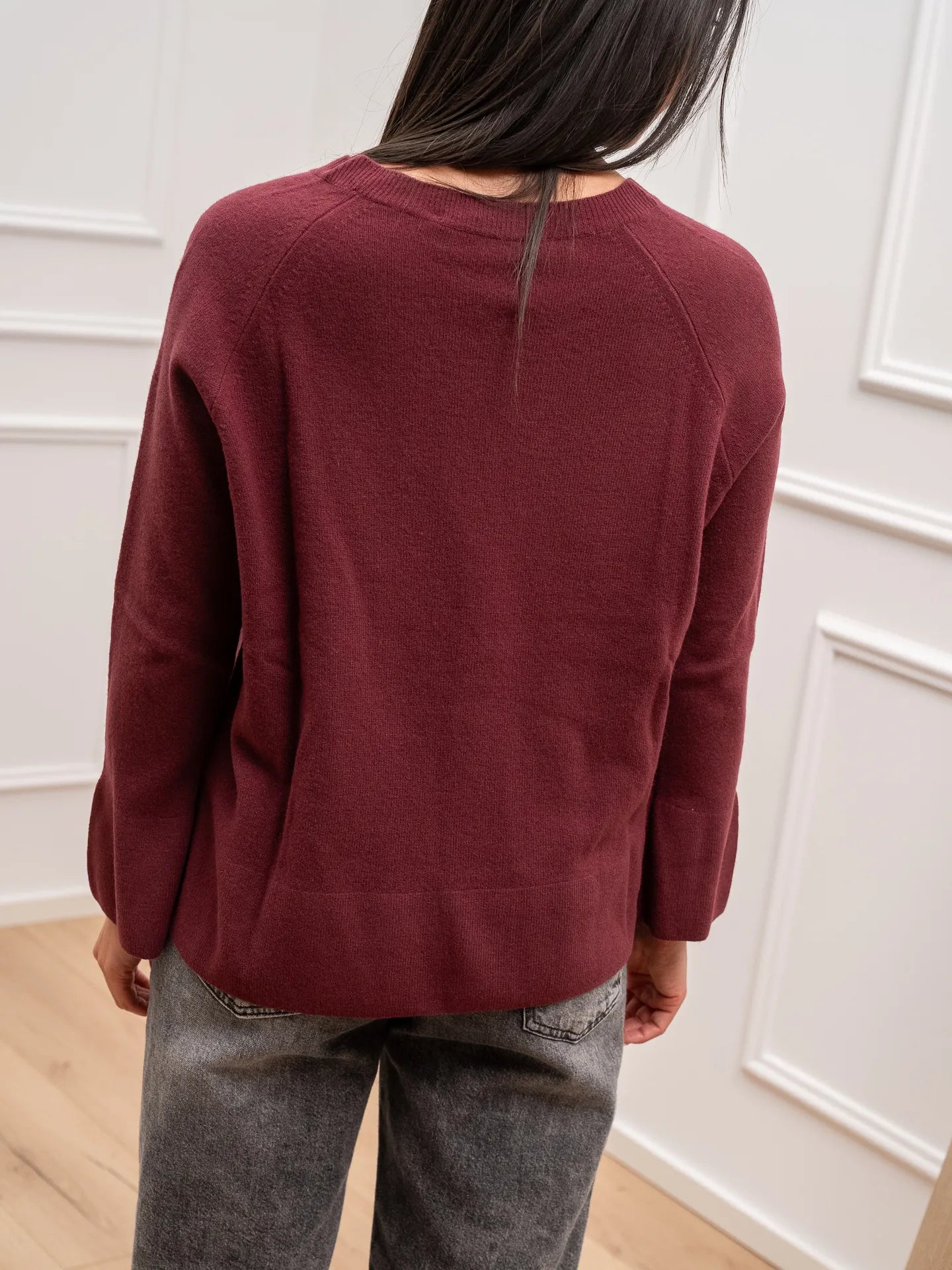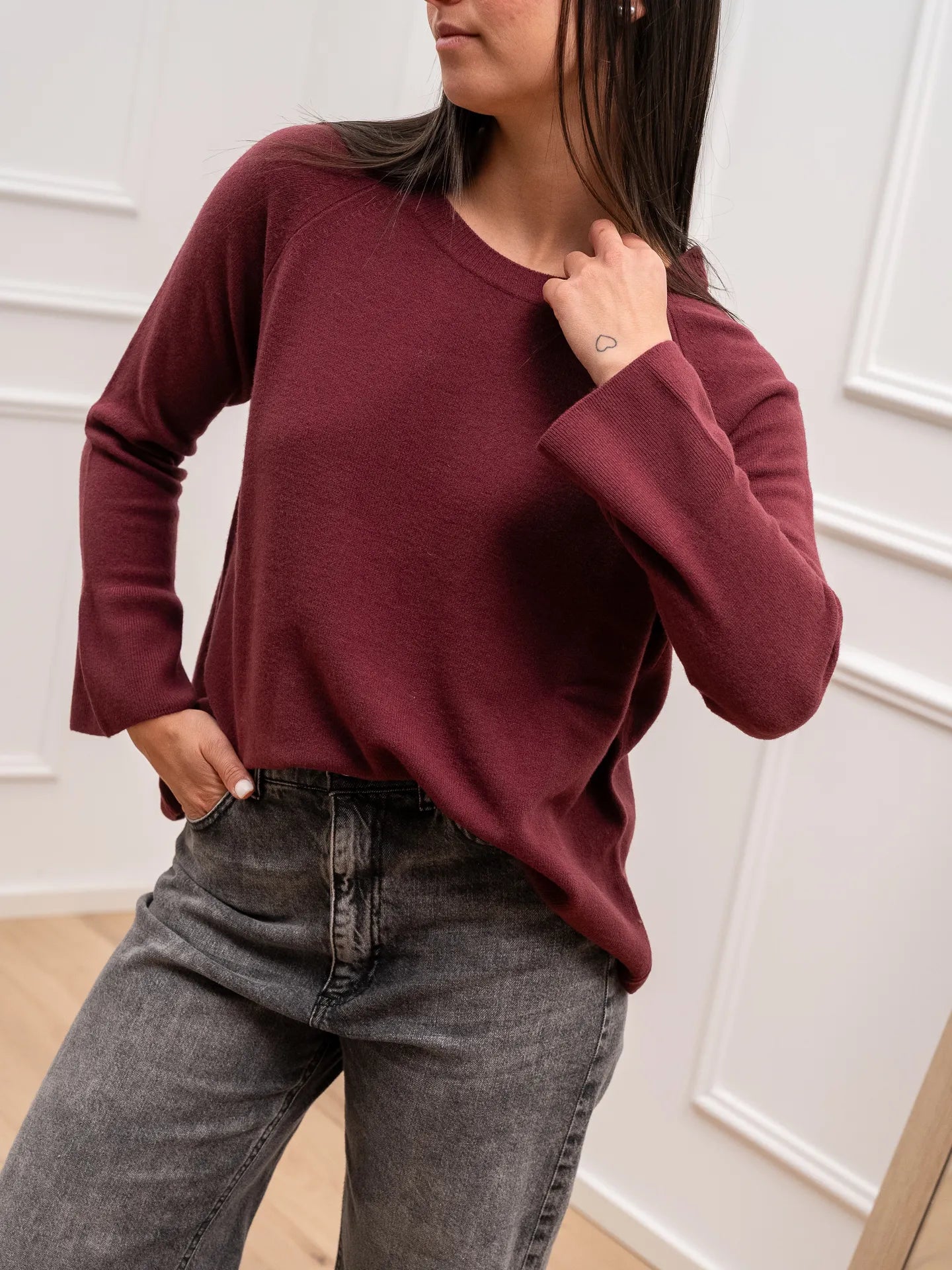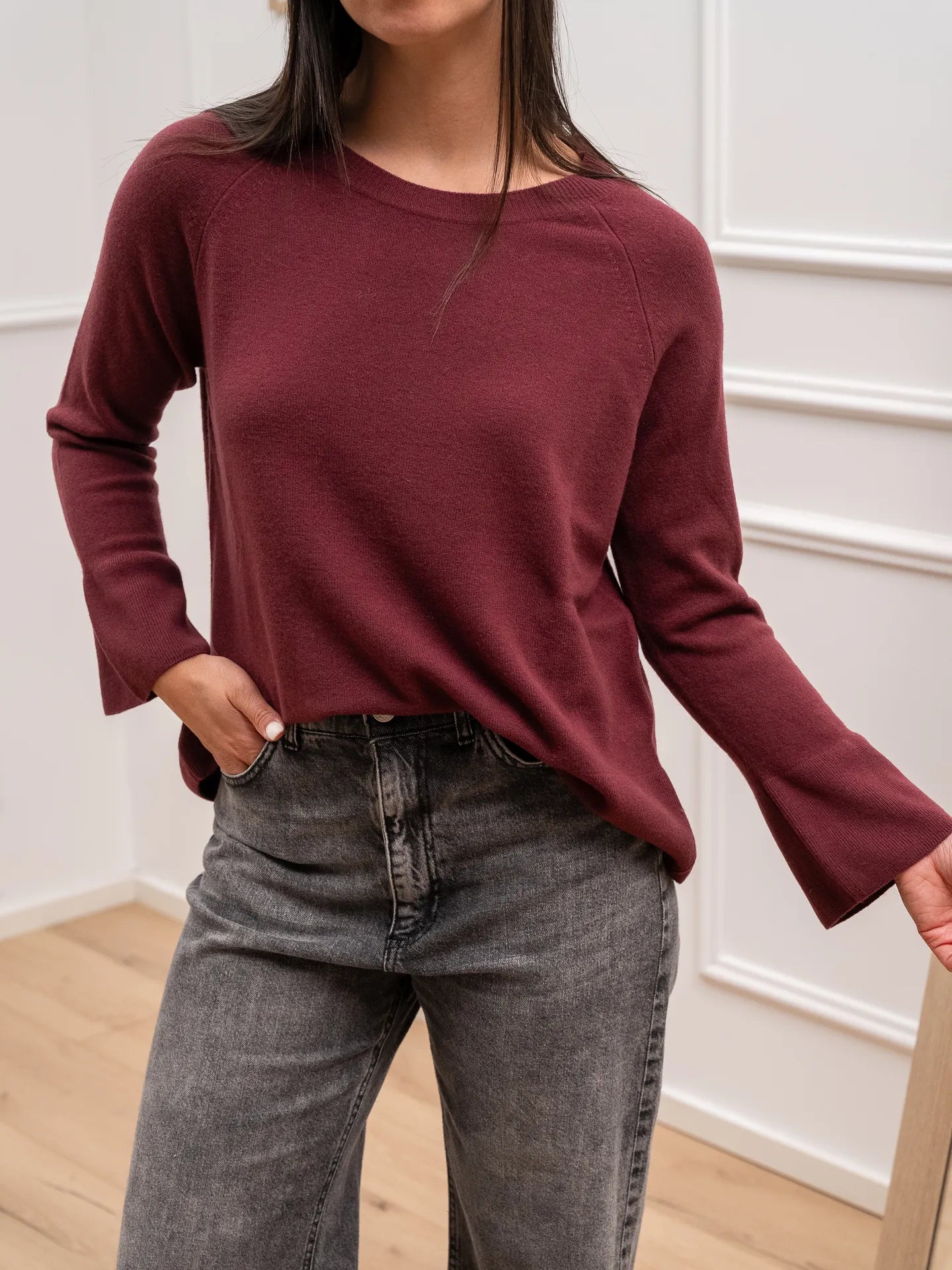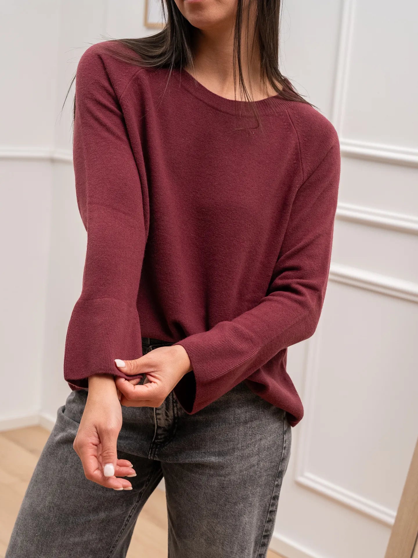 Maglia color bordeaux 100% lana HaveOne. Modello girocollo fit morbido con maniche lunghe e polsino scampanato. Finiture a costine.