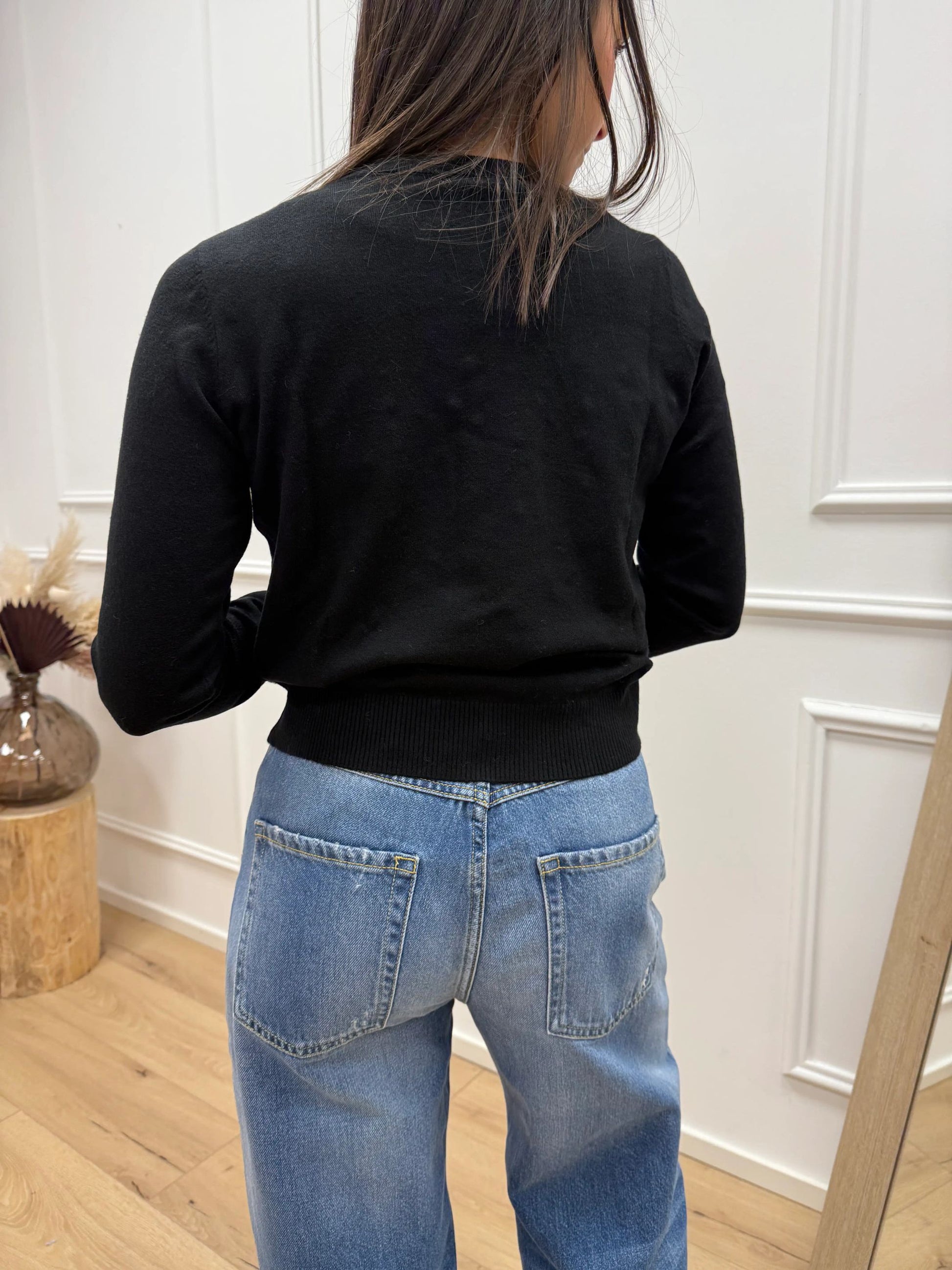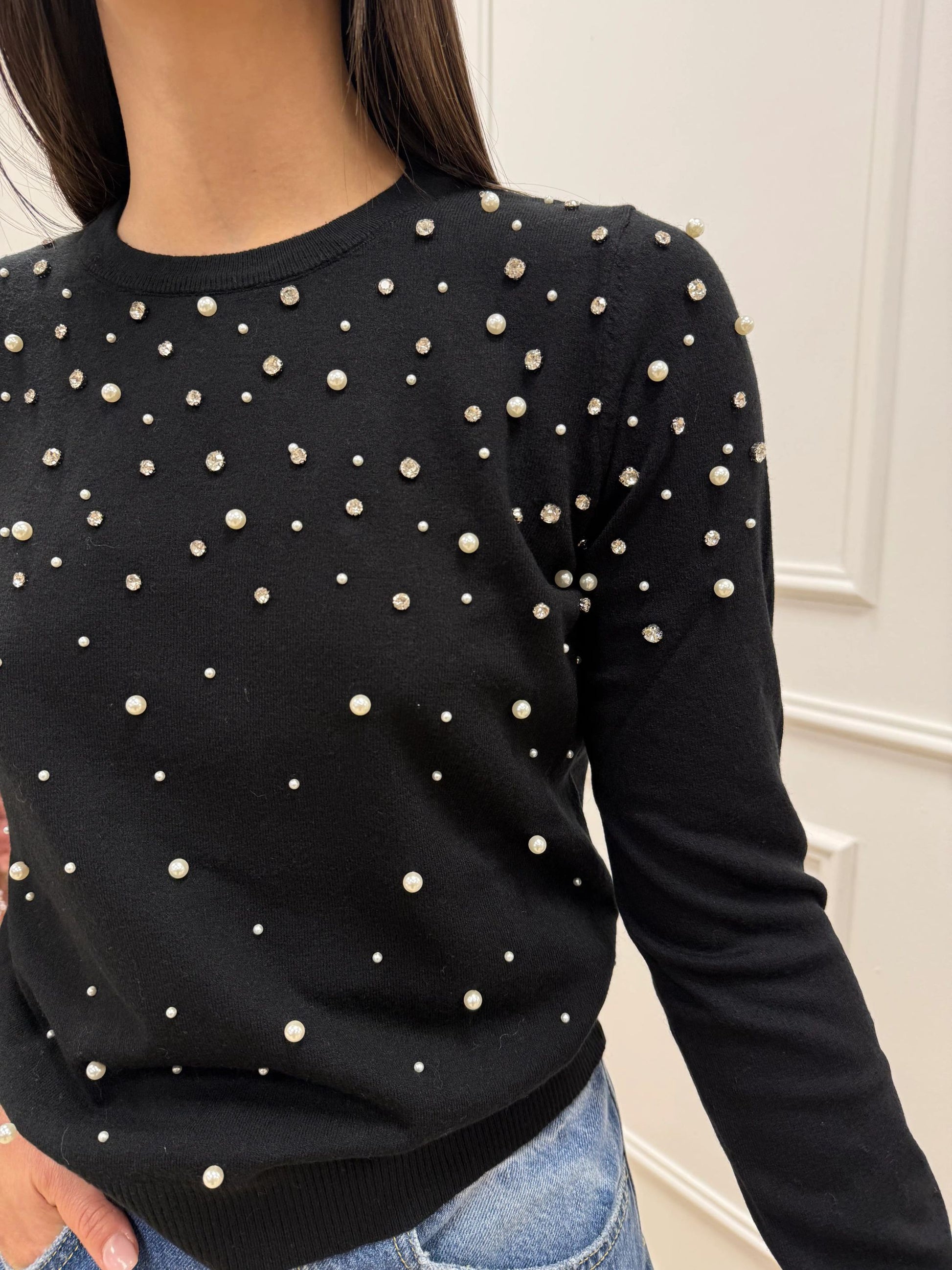 Maglia color nera You Decide. Modello fit regolare girocollo a manica lunga. Finiture a costine. Dettaglio di perle e strass all over.
