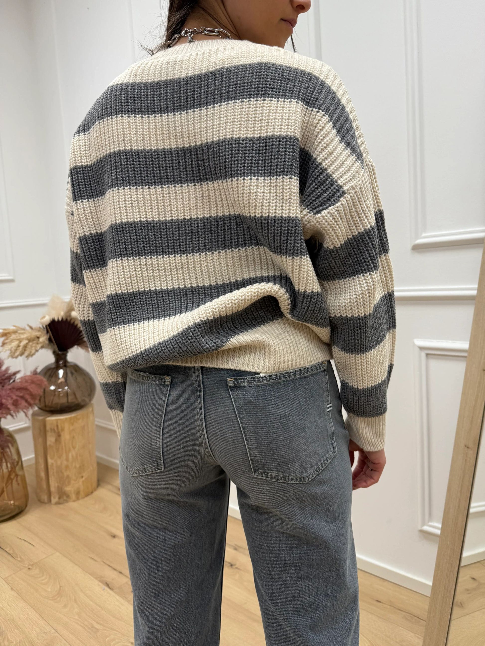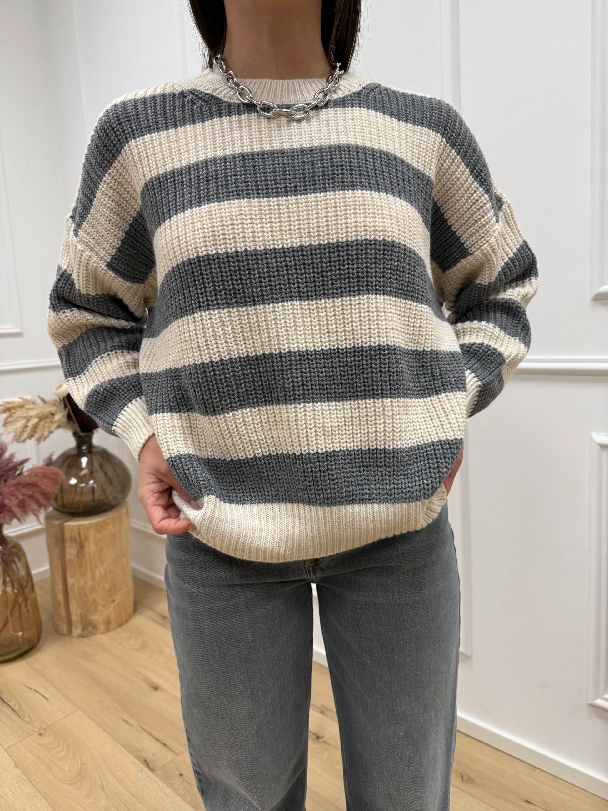 Maglia rigata grigio e crema HaveOne. Modello girocollo a manica lunga. Fit regolare.