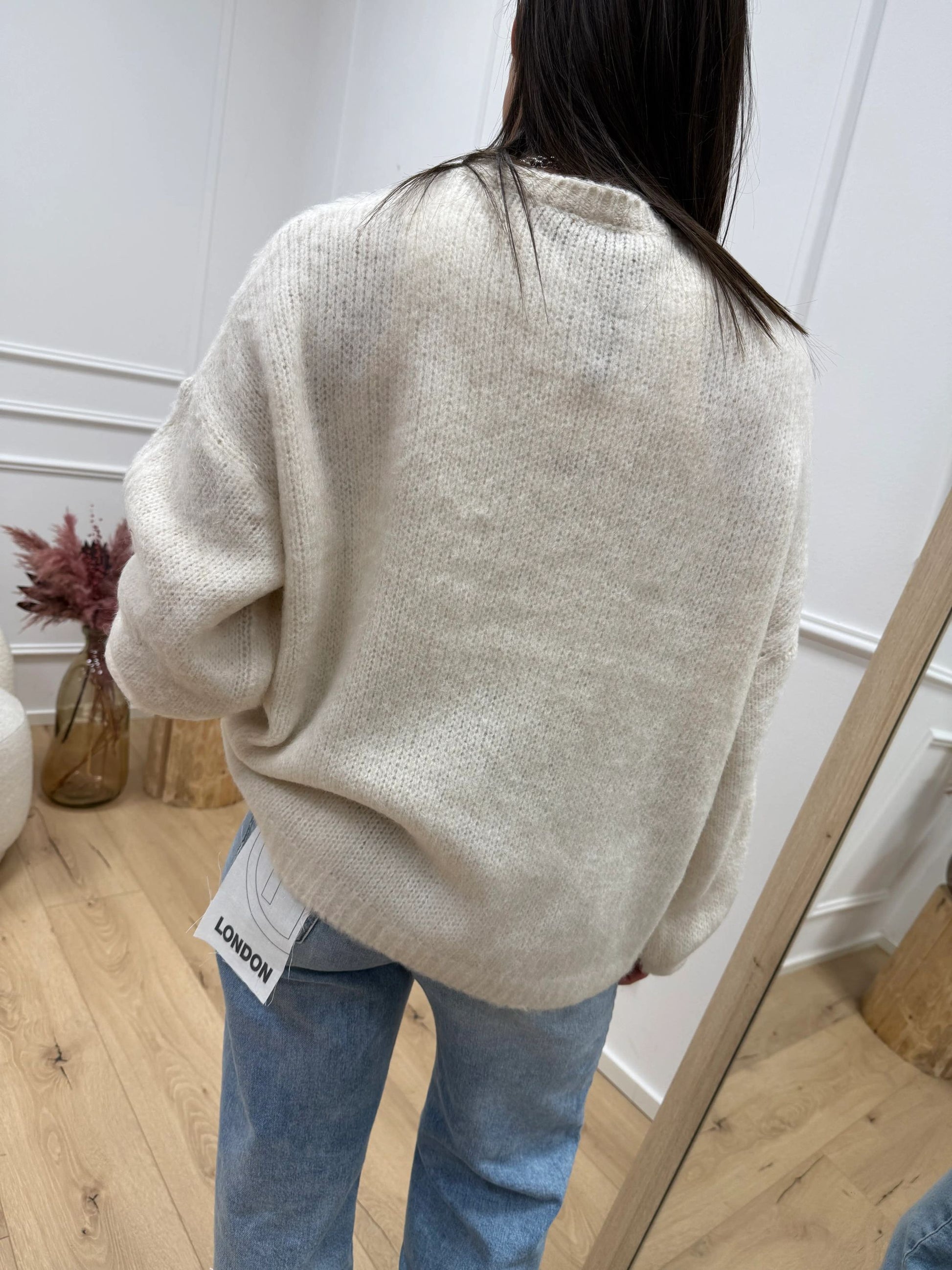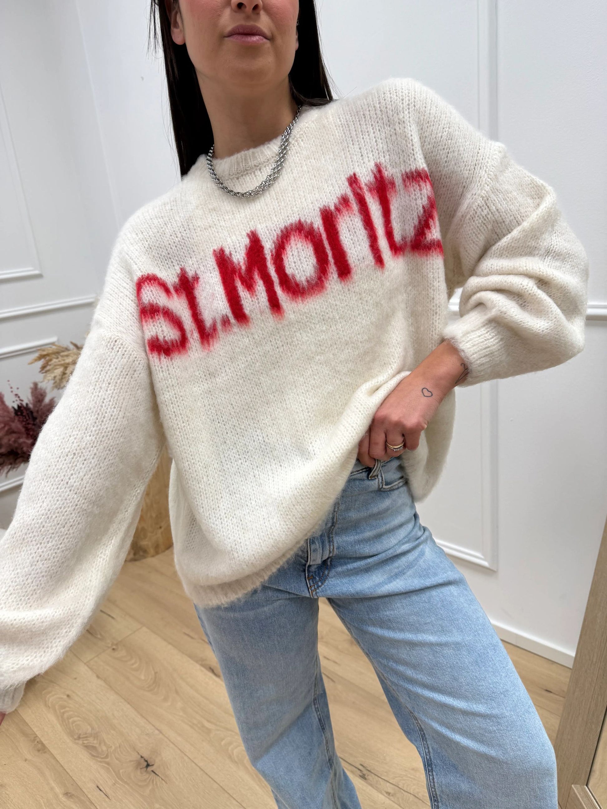 Maglia girocollo St.Moritz base panna con scritta rosso HaveOne. Modello fit morbido girocollo con spalla scesa e manica a palloncino.