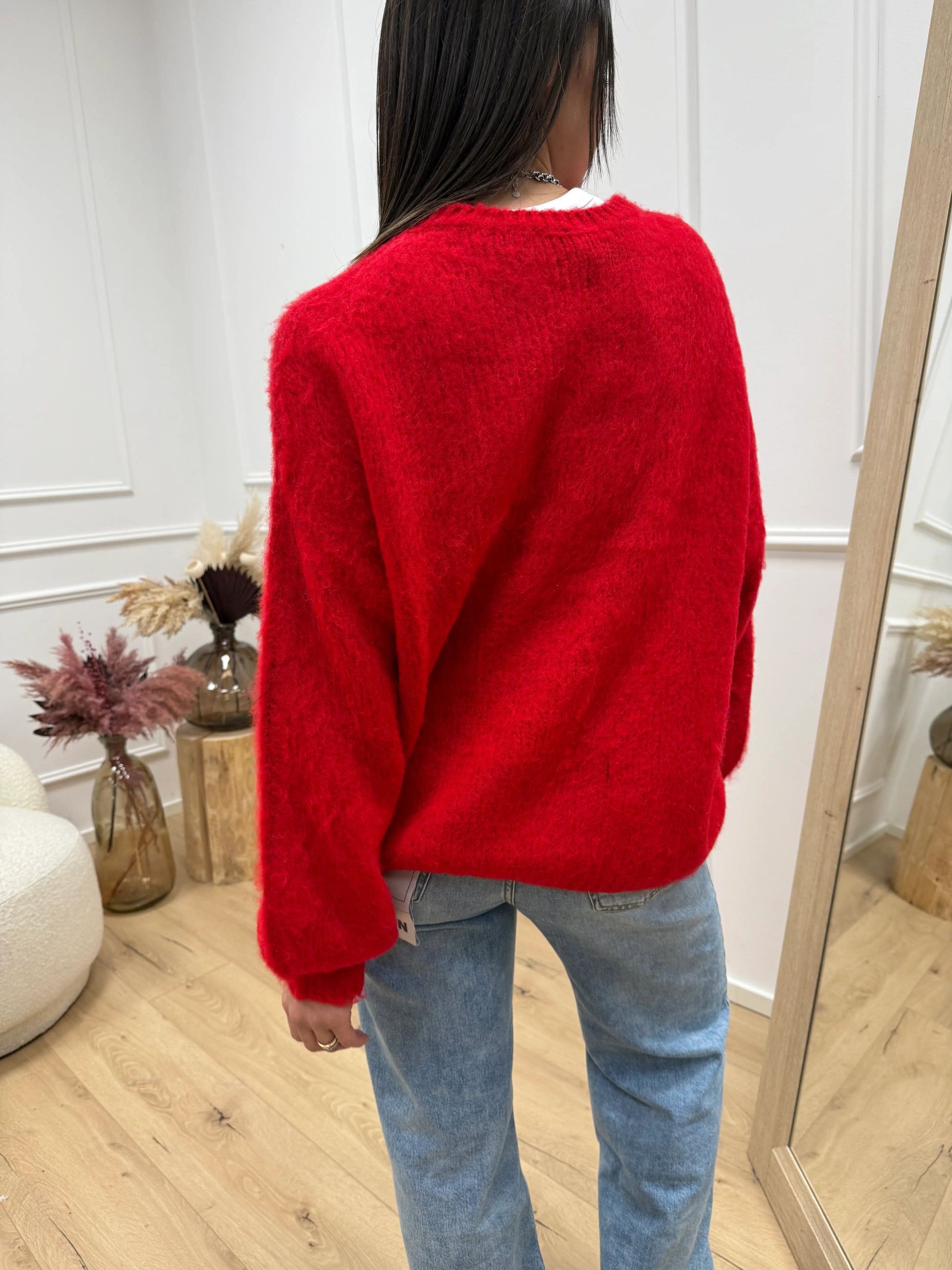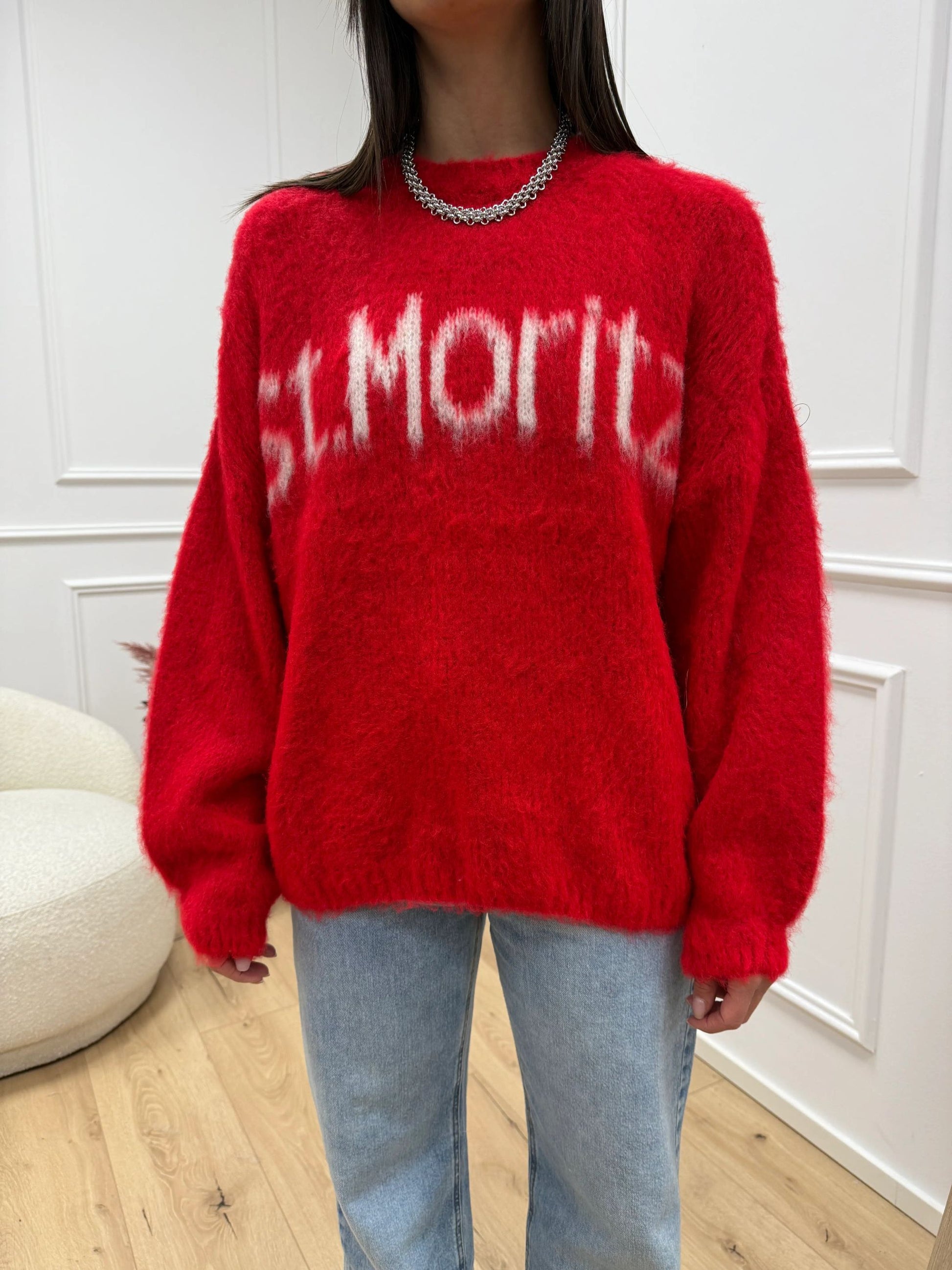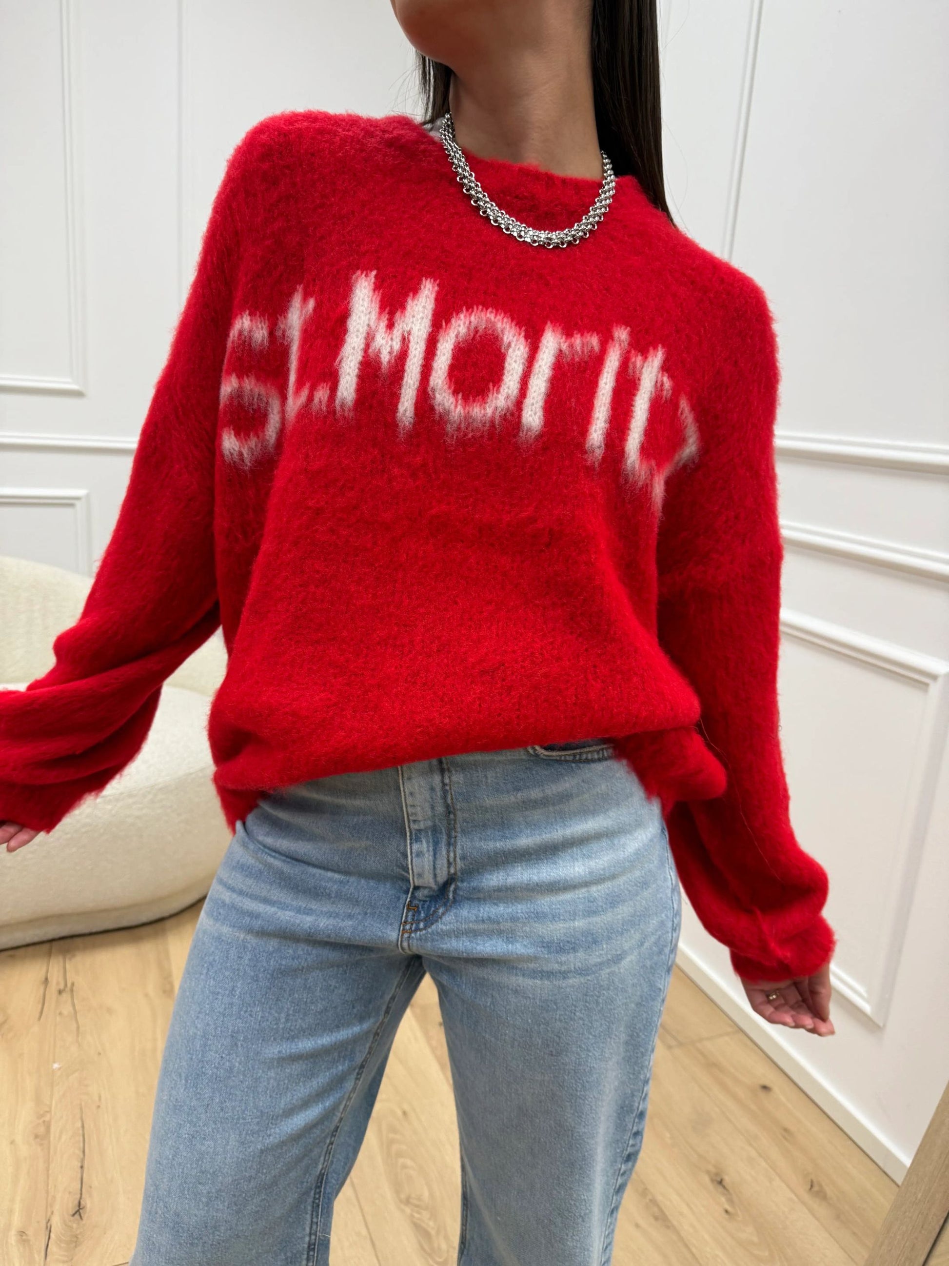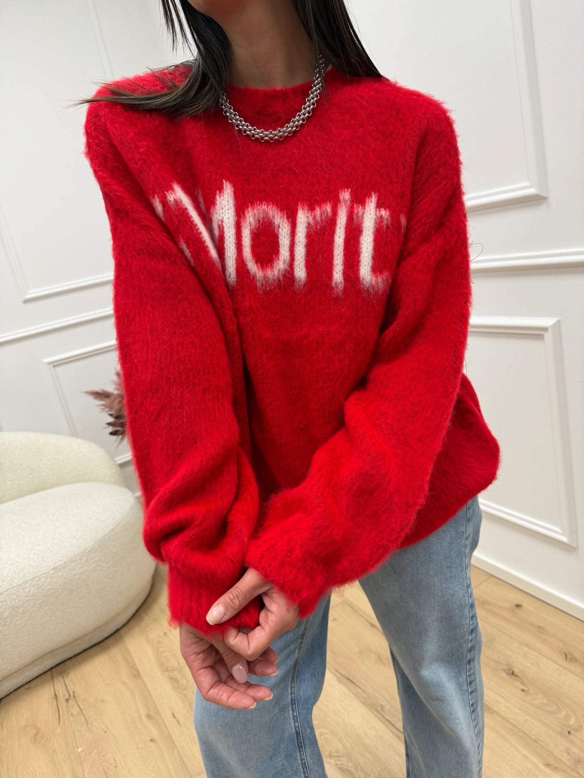 Maglia girocollo St.Moritz base rosso con scritta panna HaveOne. Modello fit morbido girocollo con spalla scesa e manica a palloncino.