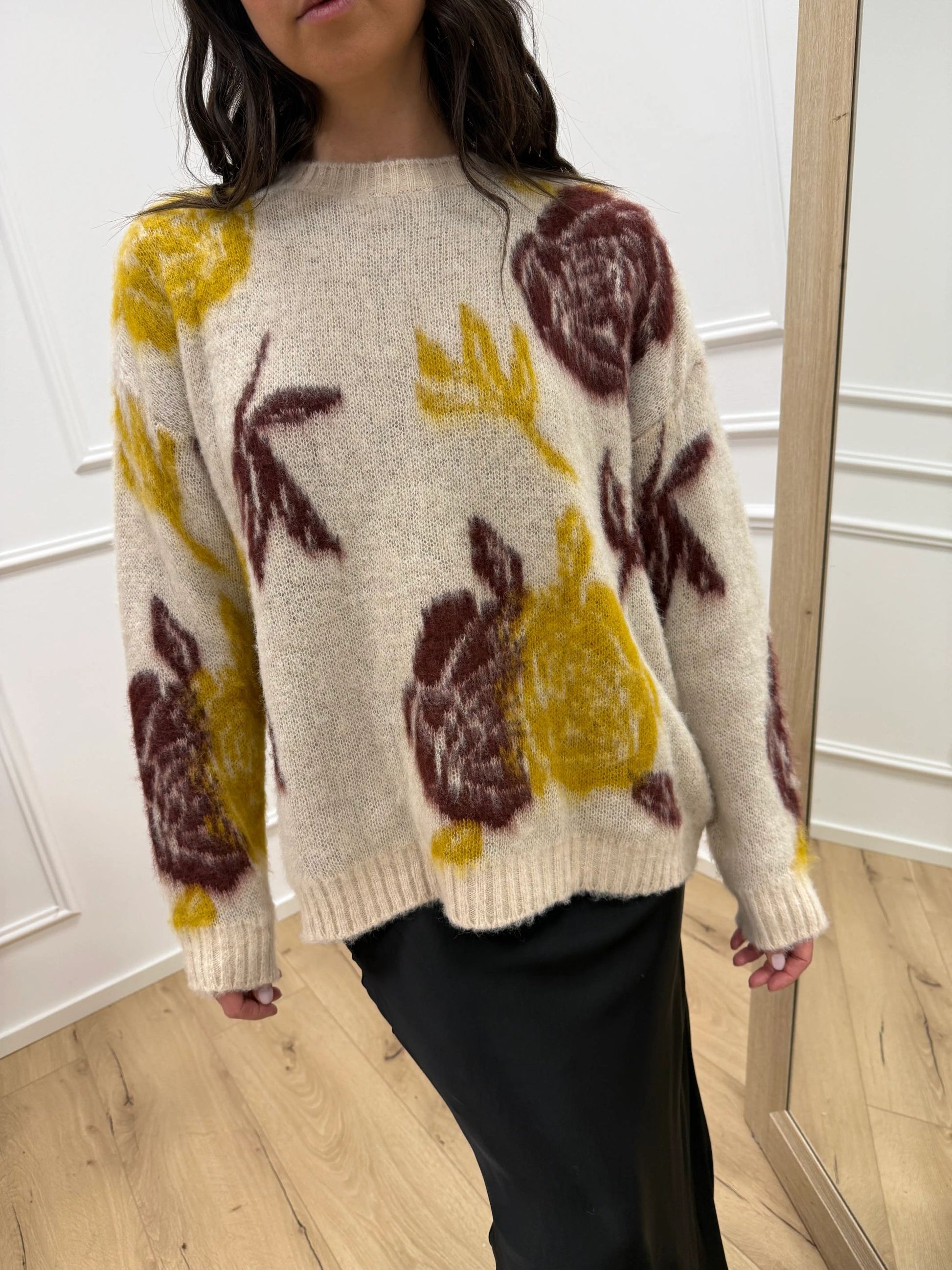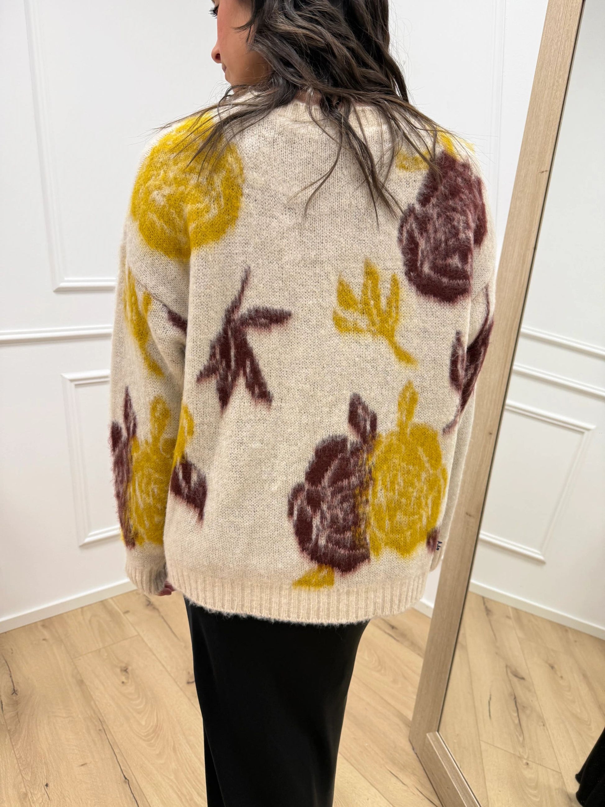 Maglia jacquard fiori beige, vino e senape - HaveOne