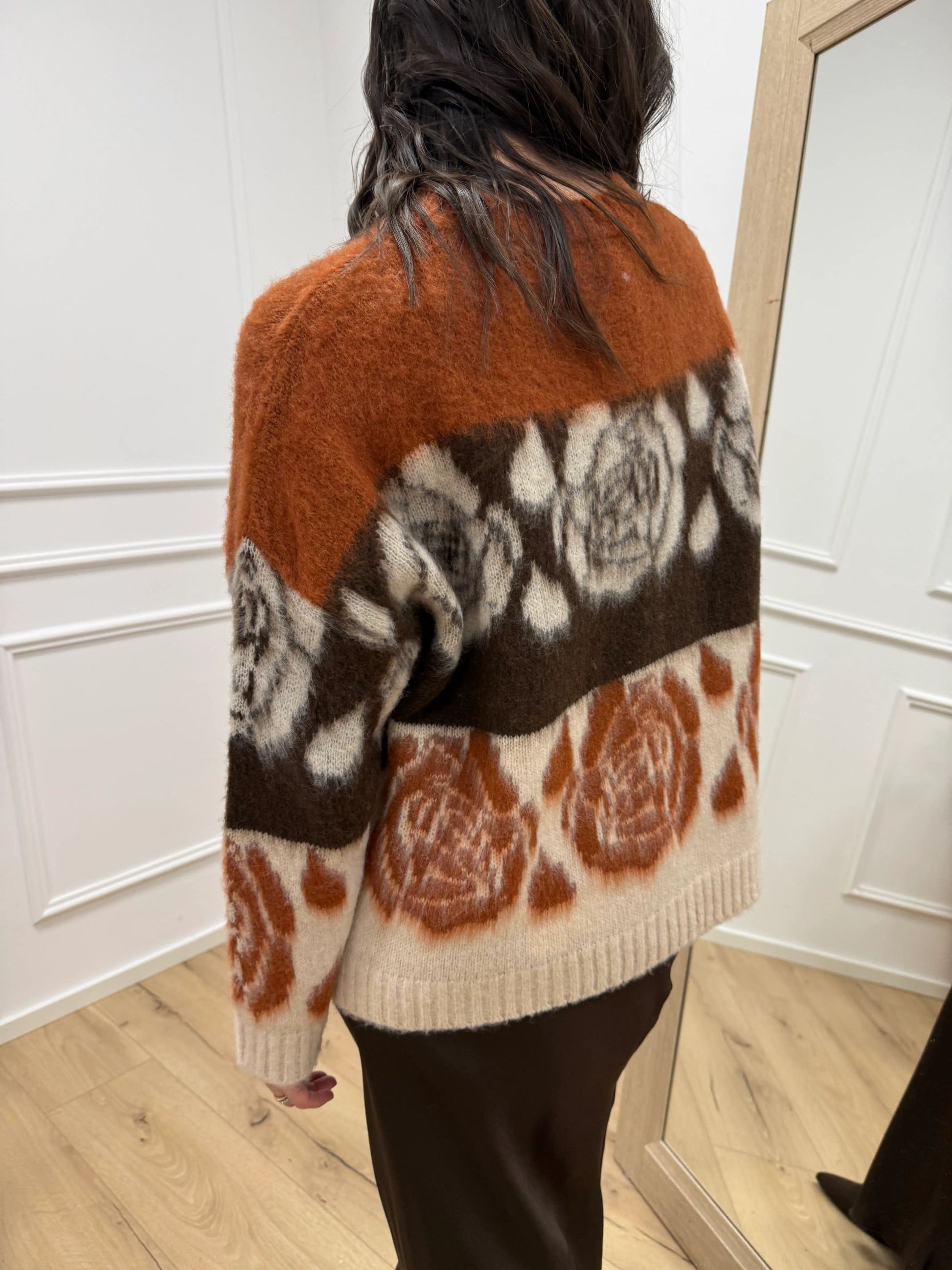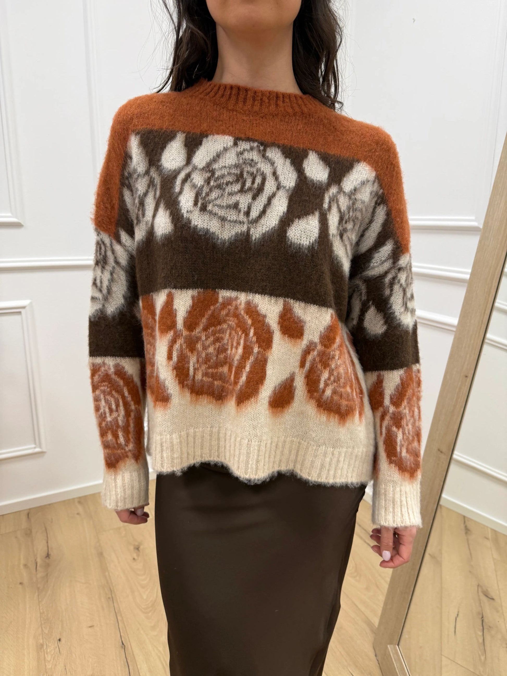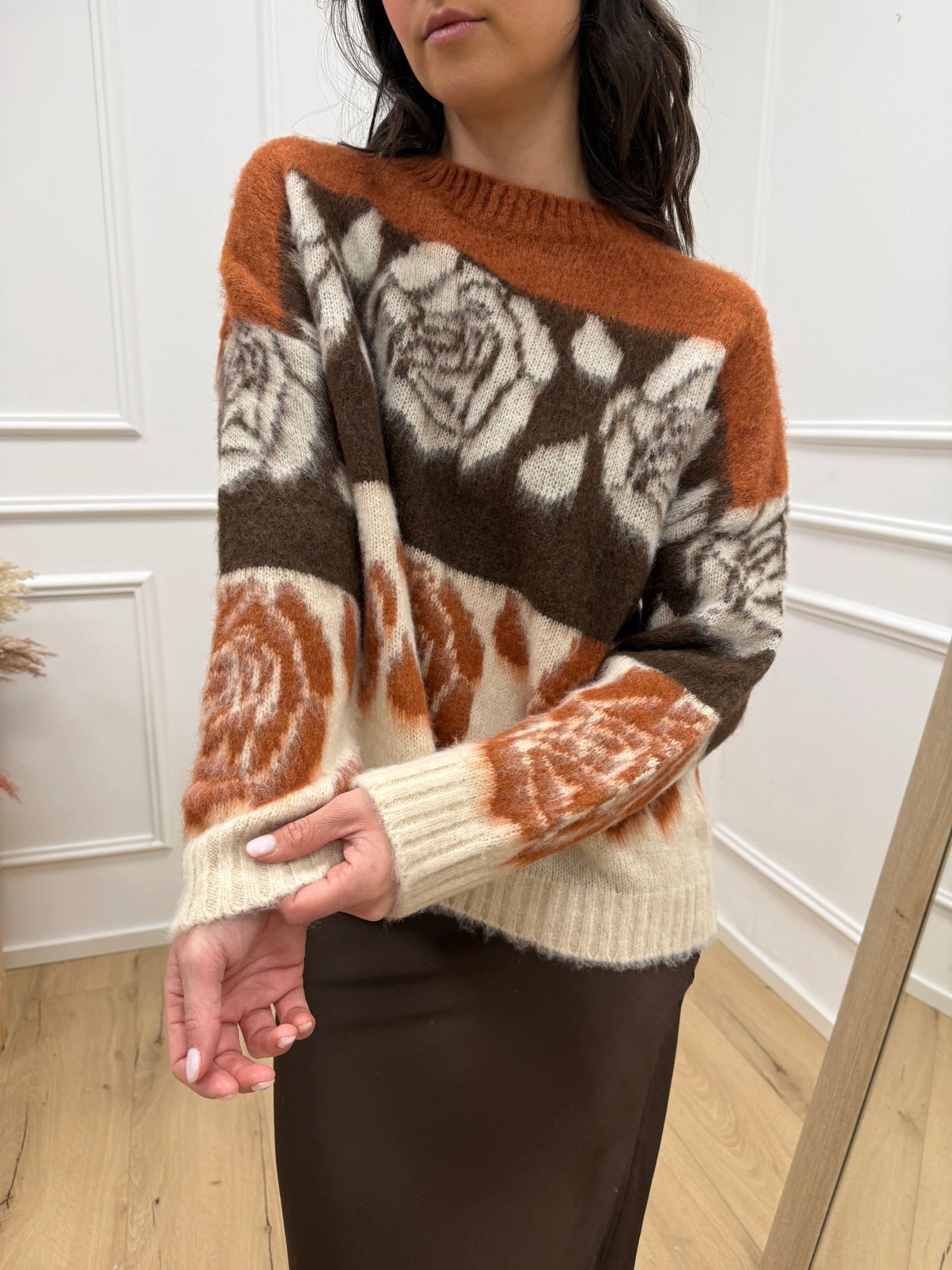 Maglia garzata jacquard fantasia righe e fiori sui toni del beige, coccio e moro HaveOne. Modello girocollo a manica lunga, finiture a coste.