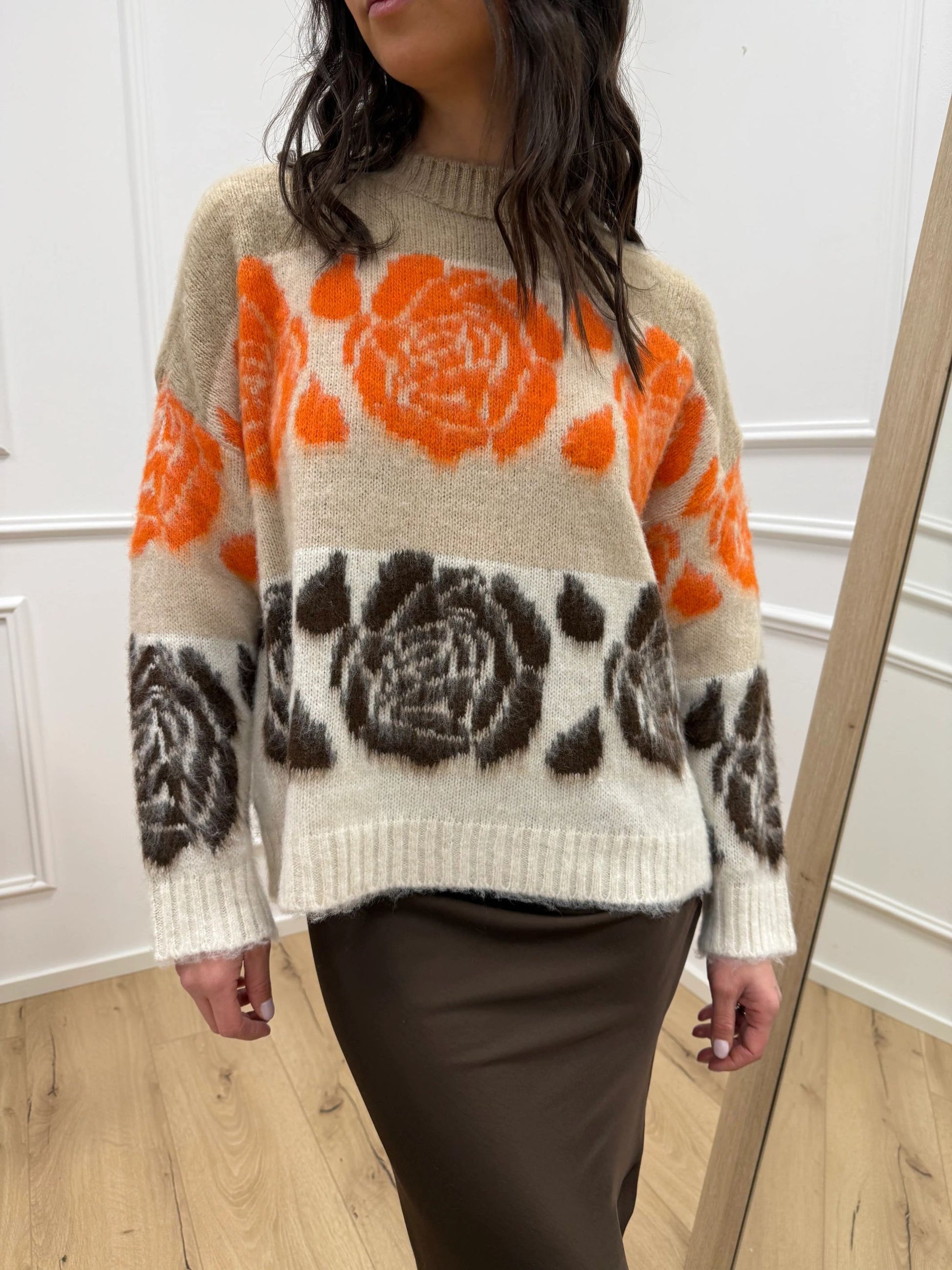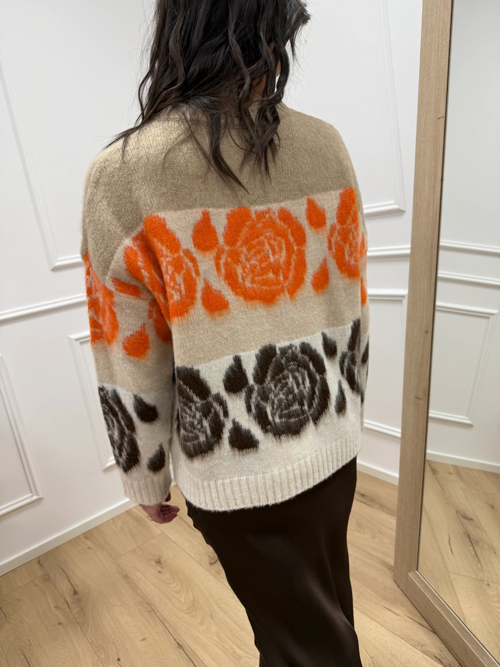 Maglia jacquard righe e fiori panna, moro, beige, arancio e mastice - HaveOne