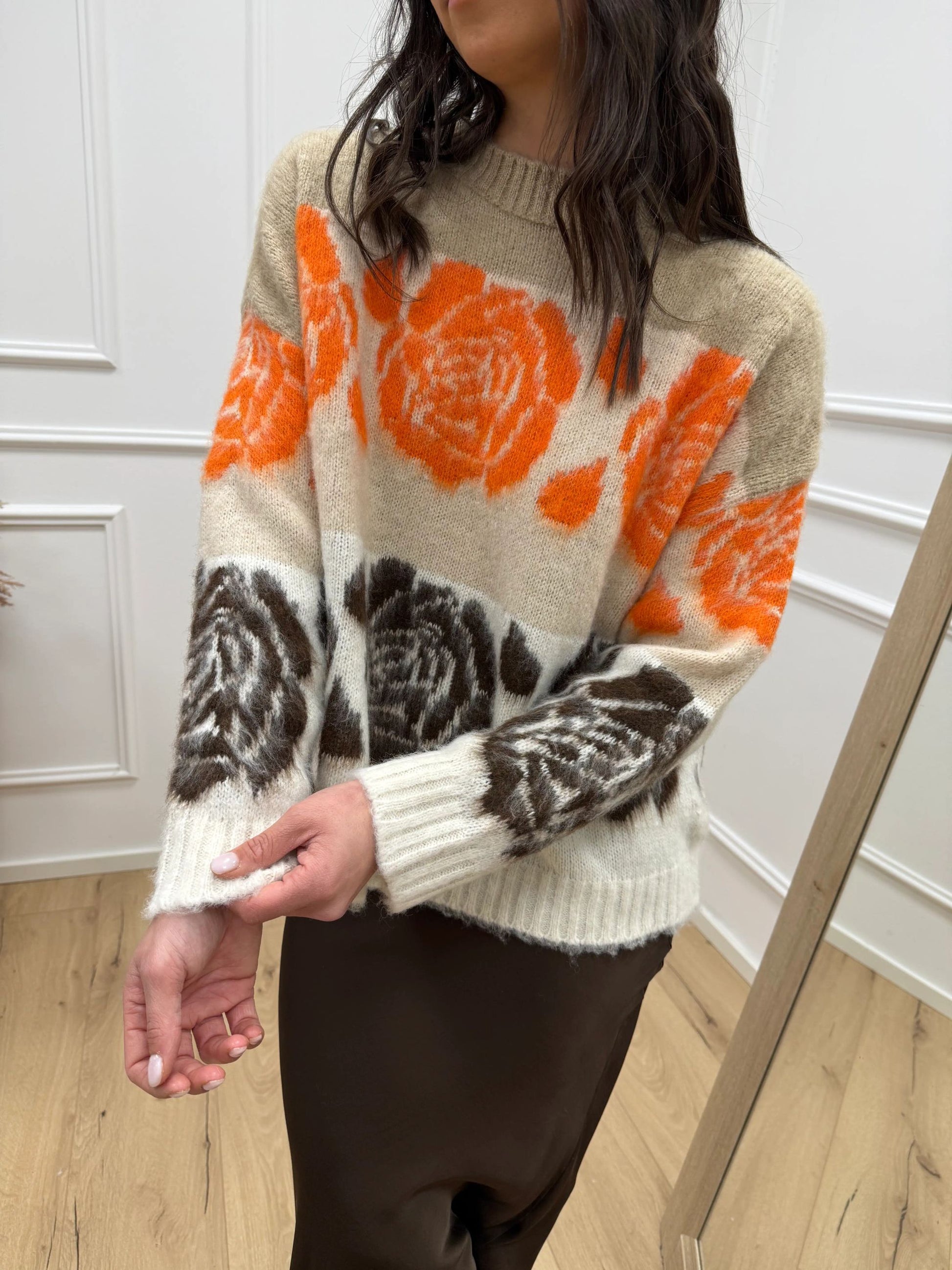 Maglia garzata jacquard fantasia righe e fiori sui toni del panna, moro, beige, arancio e mastice HaveOne. Modello girocollo a manica lunga, finiture a coste.