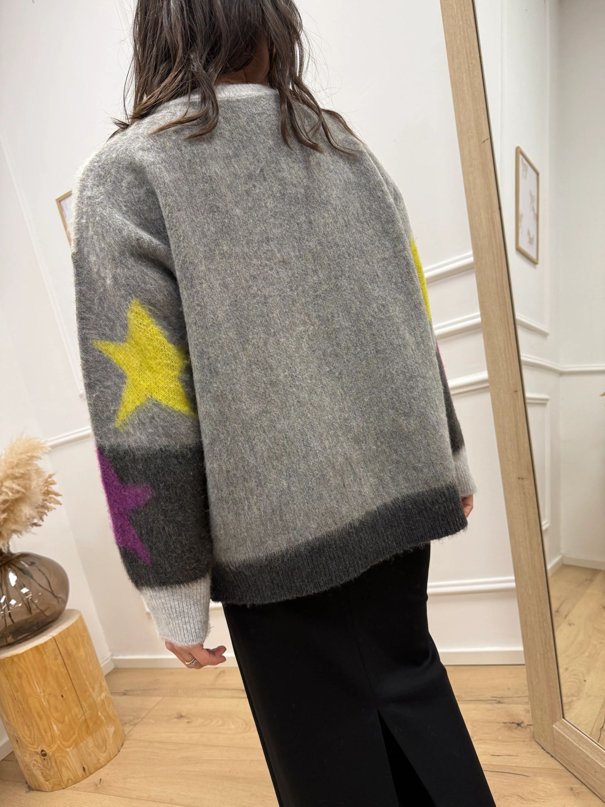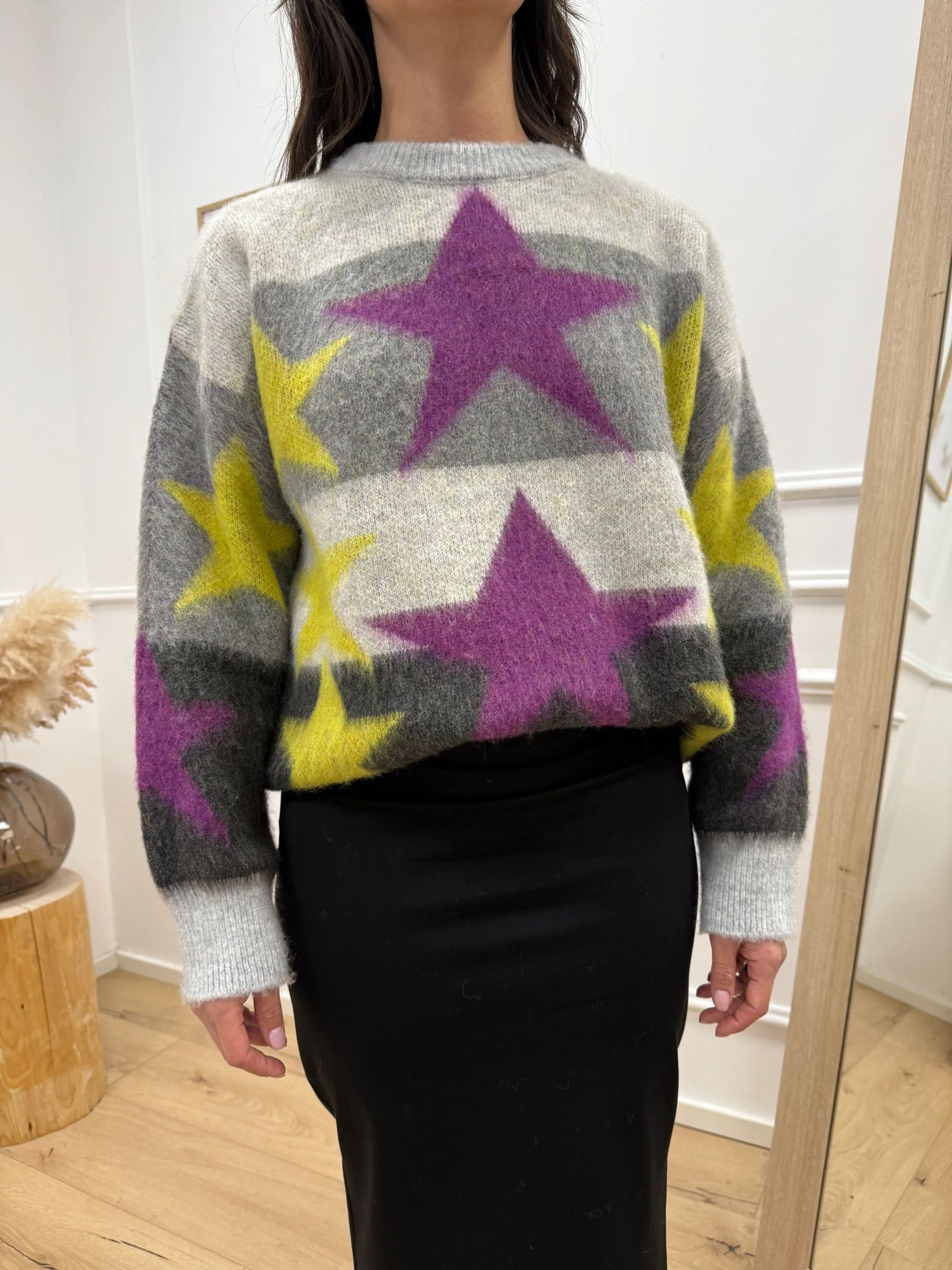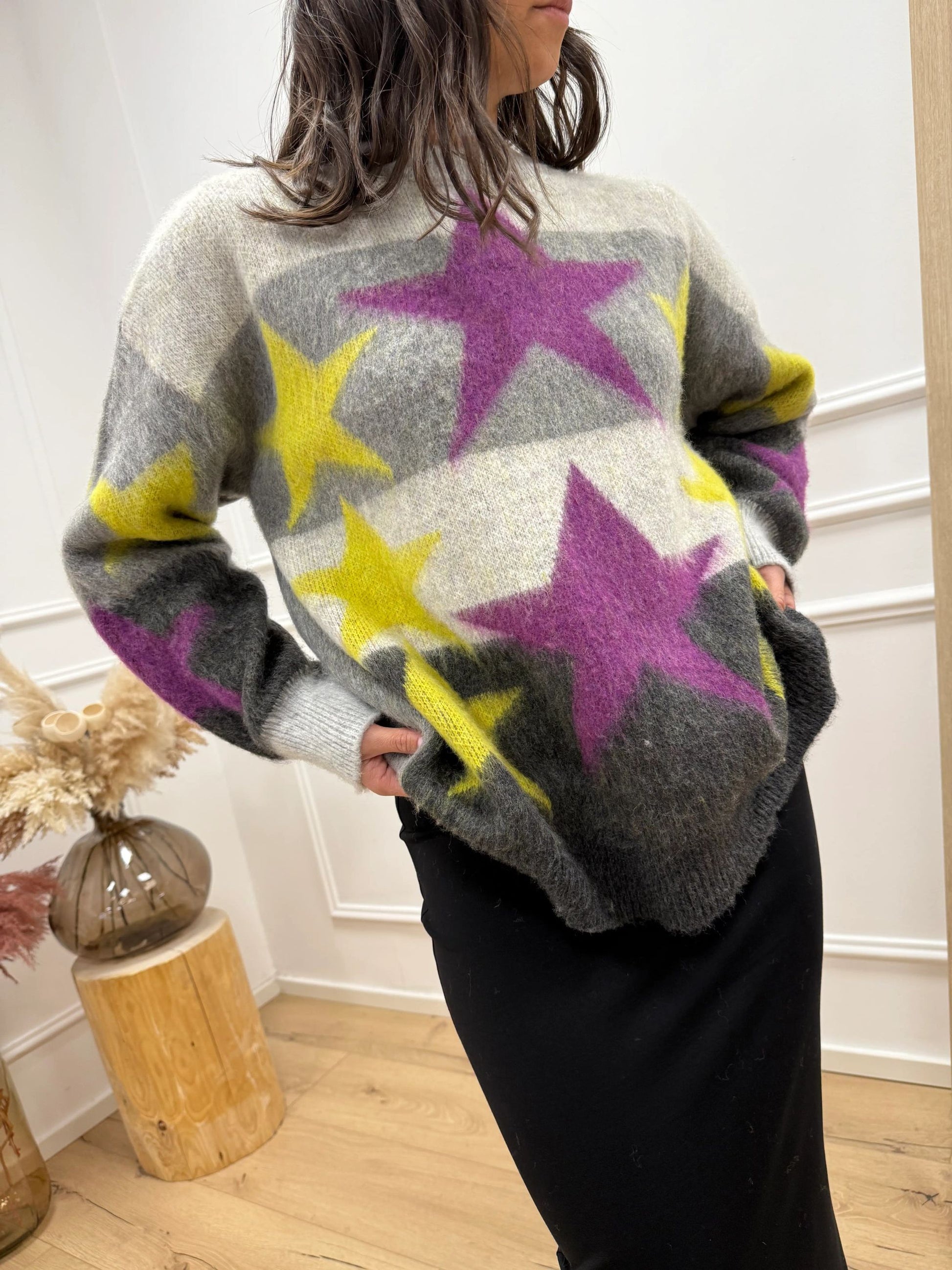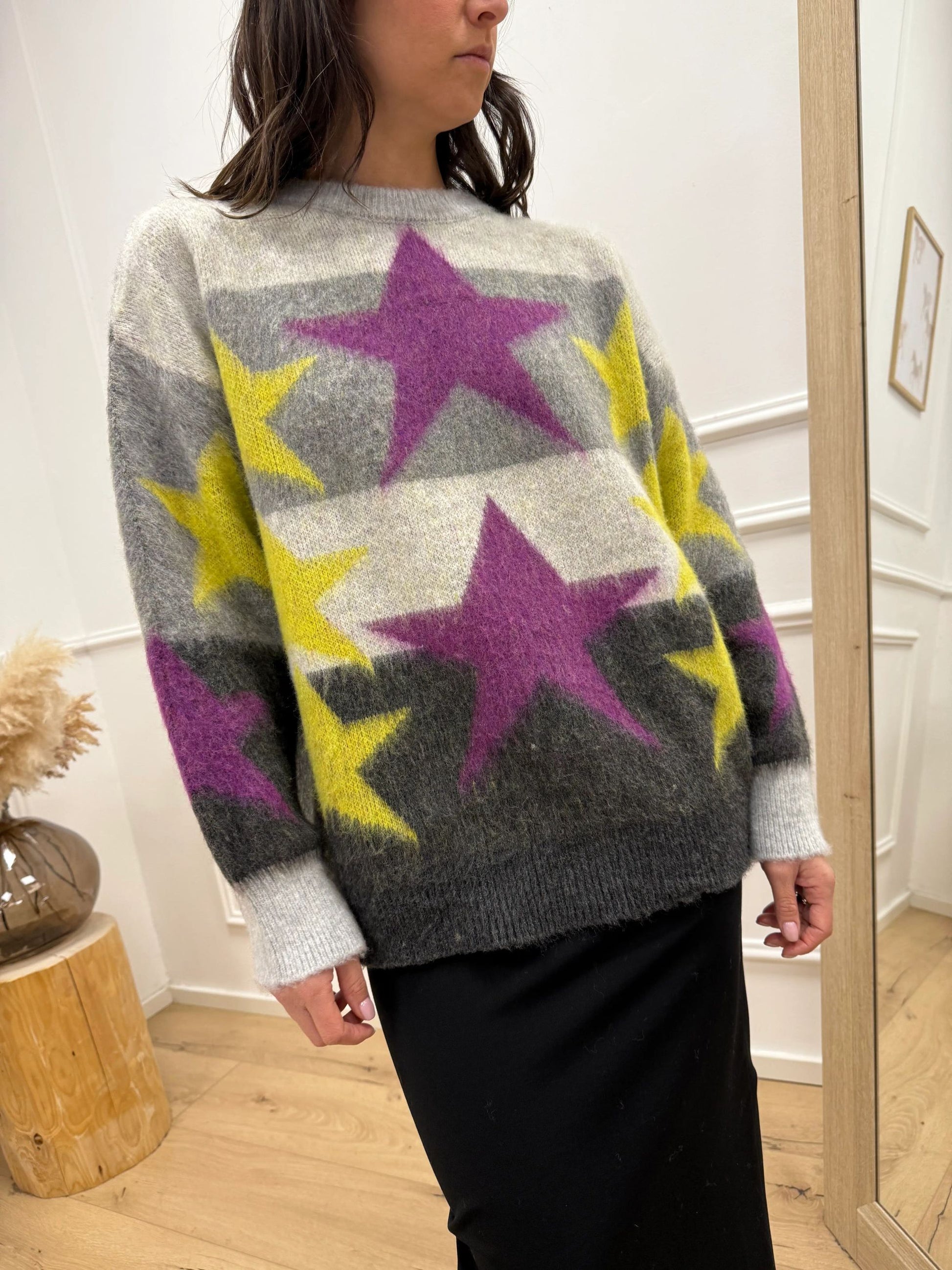 Maglia jacquard fantasia stelle antracite, perla, grigio HaveOne. Modello girocollo fit oversize a manica lunga. Finiture a costine.