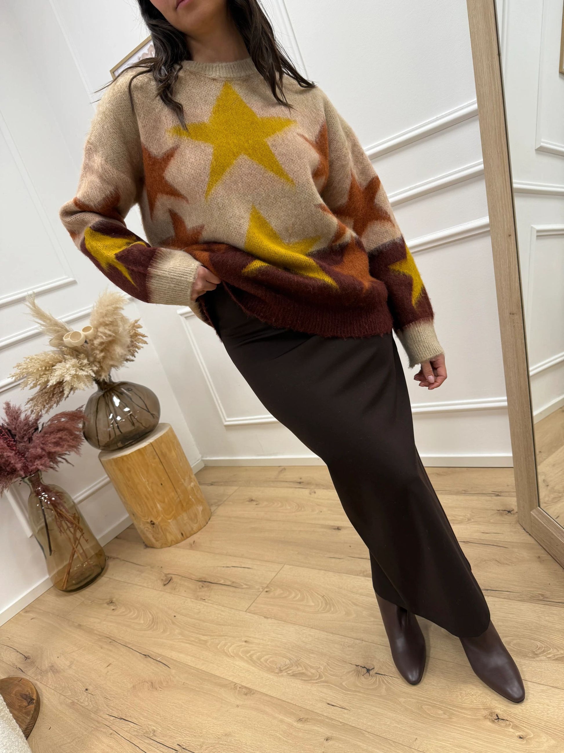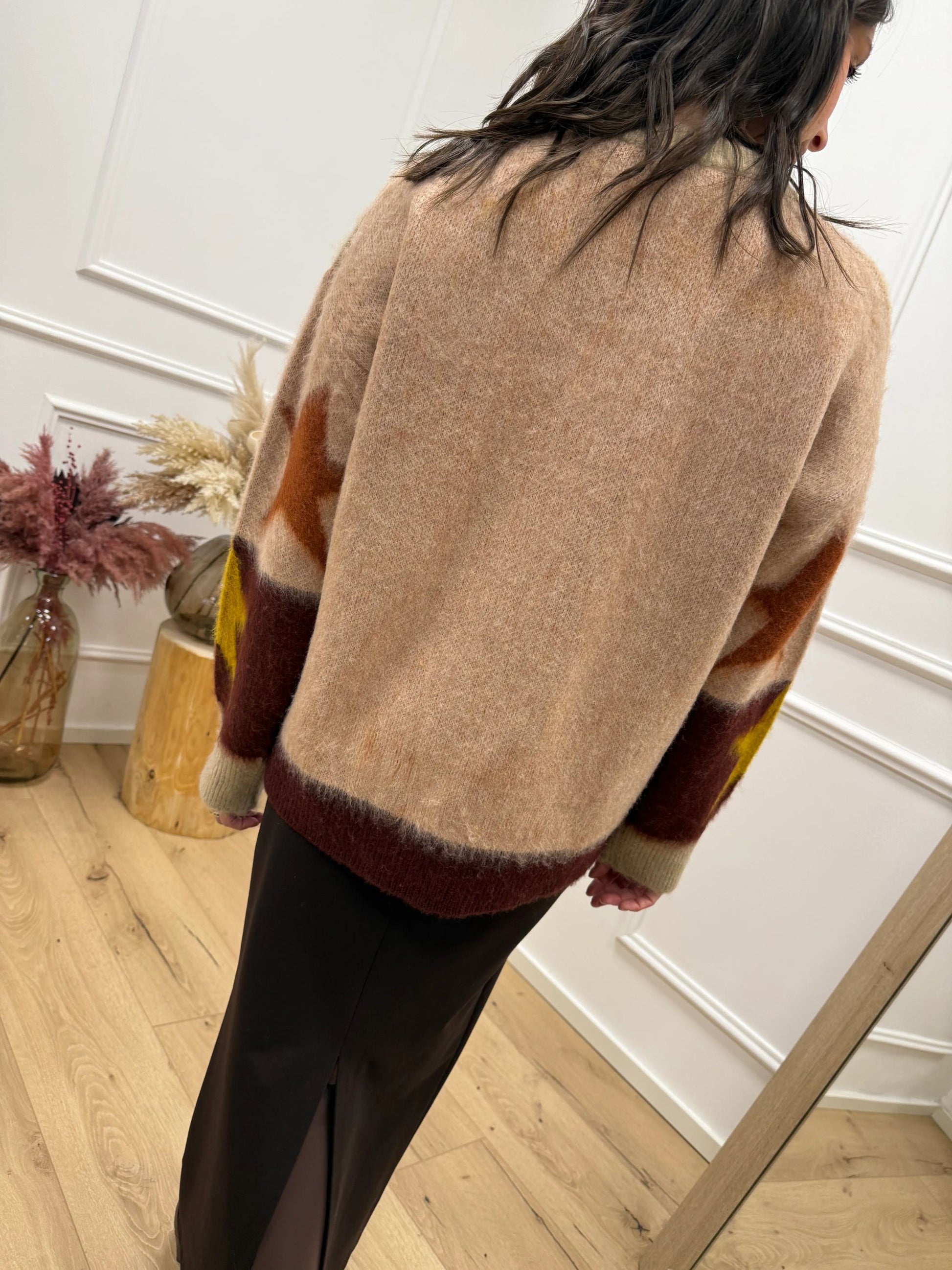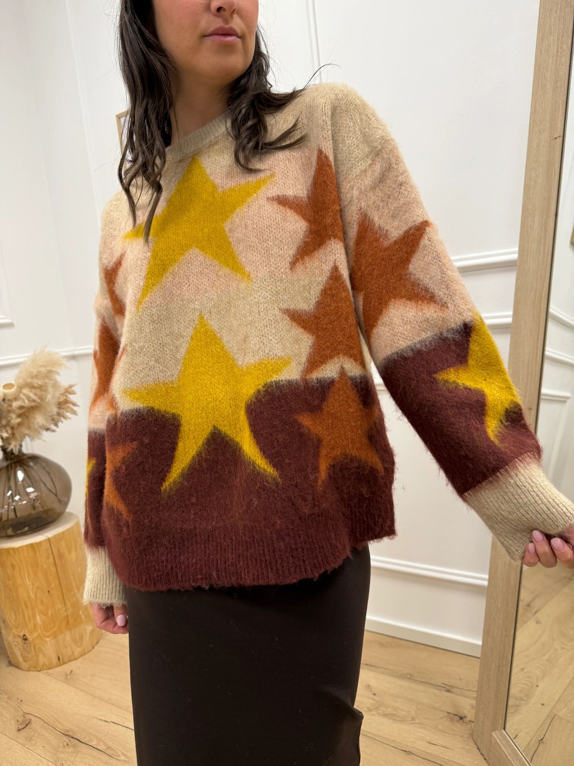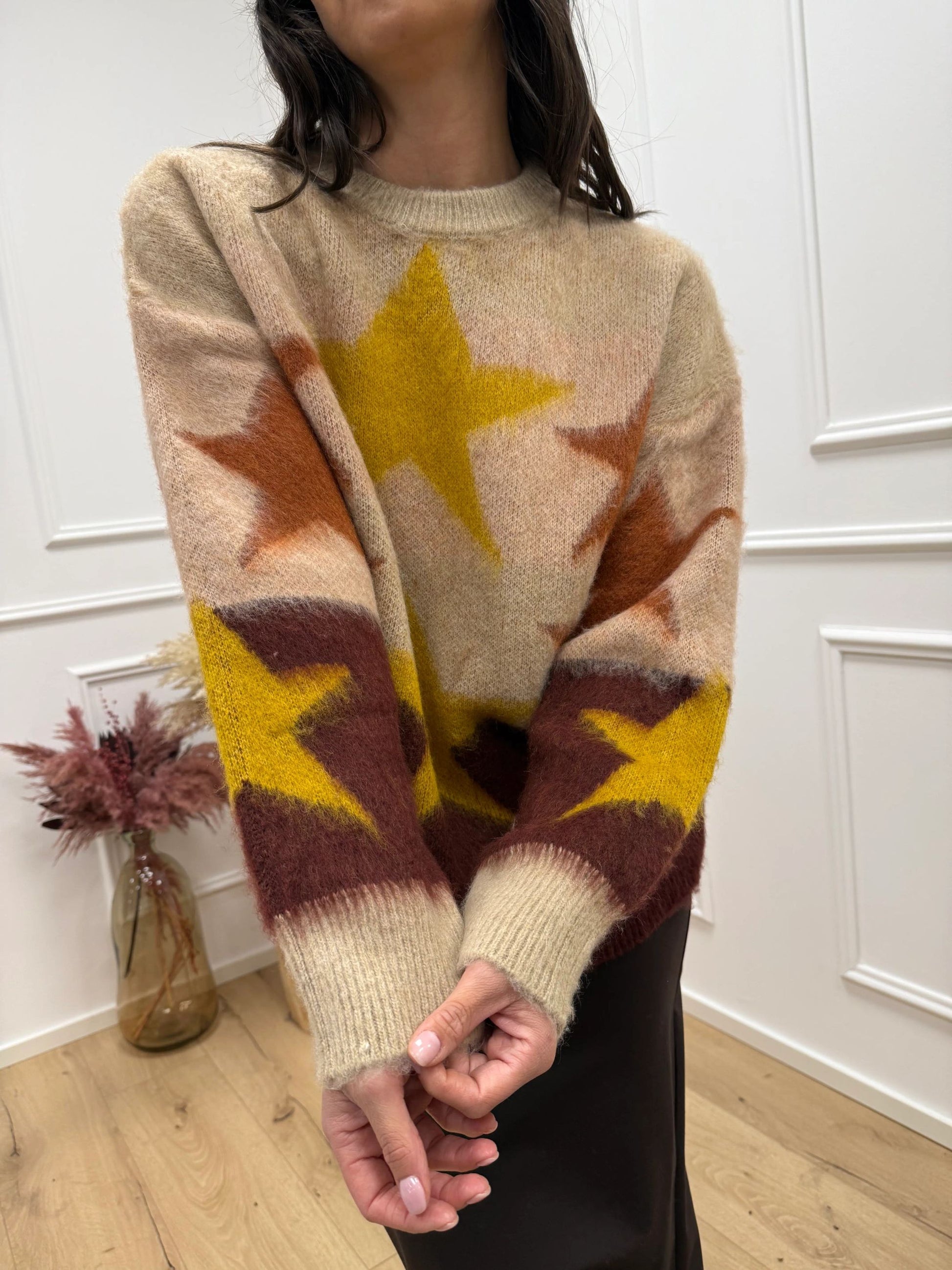 Maglia jacquard fantasia stelle bordeaux, mastice, senape, coccio HaveOne. Modello girocollo fit oversize a manica lunga. Finiture a costine.