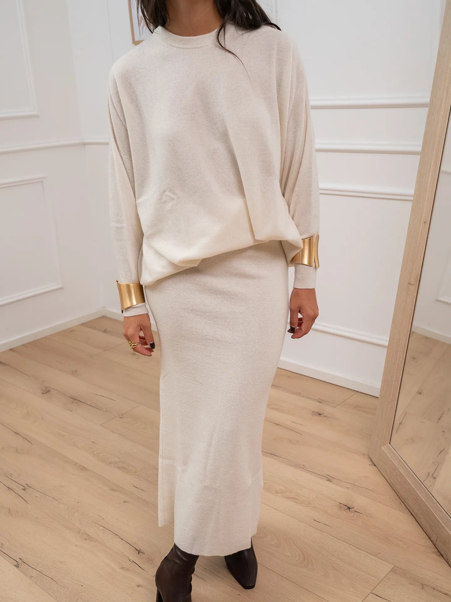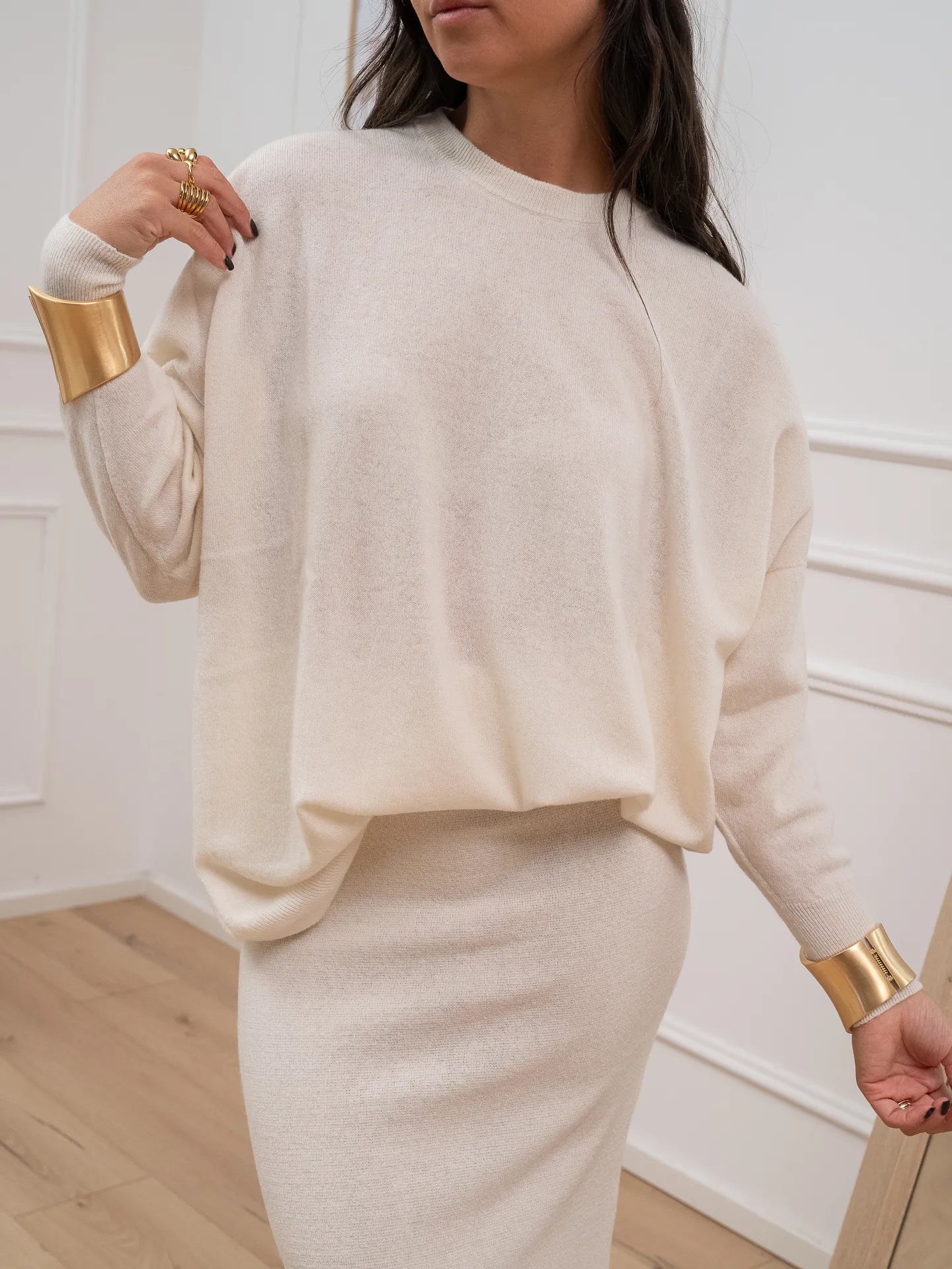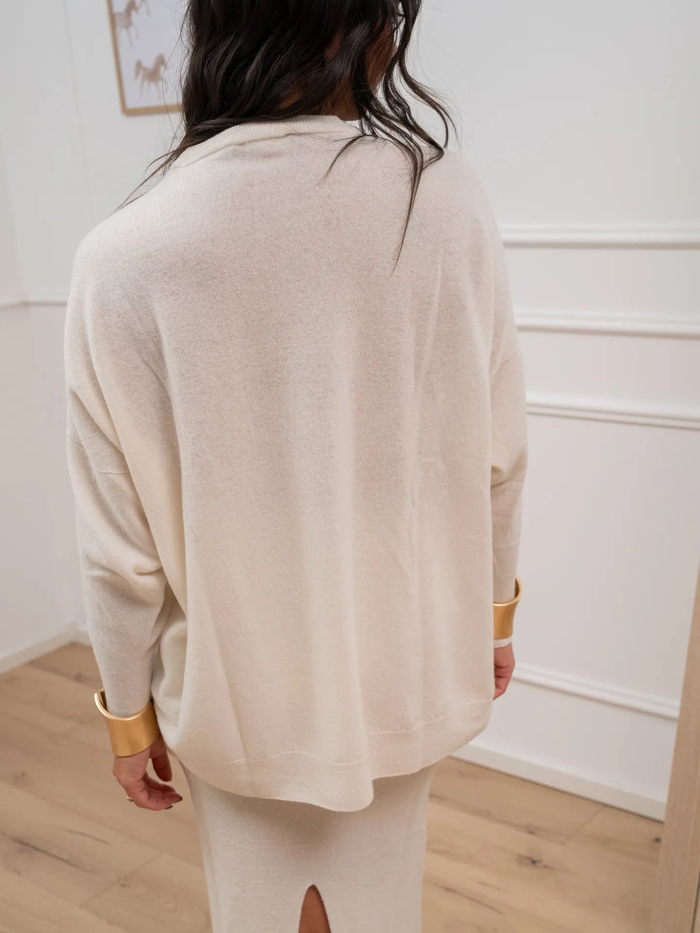 Maglia color panna misto cashmere Vicolo. Modello girocollo a maniche lunghe. Fit oversize e finiture a costine.