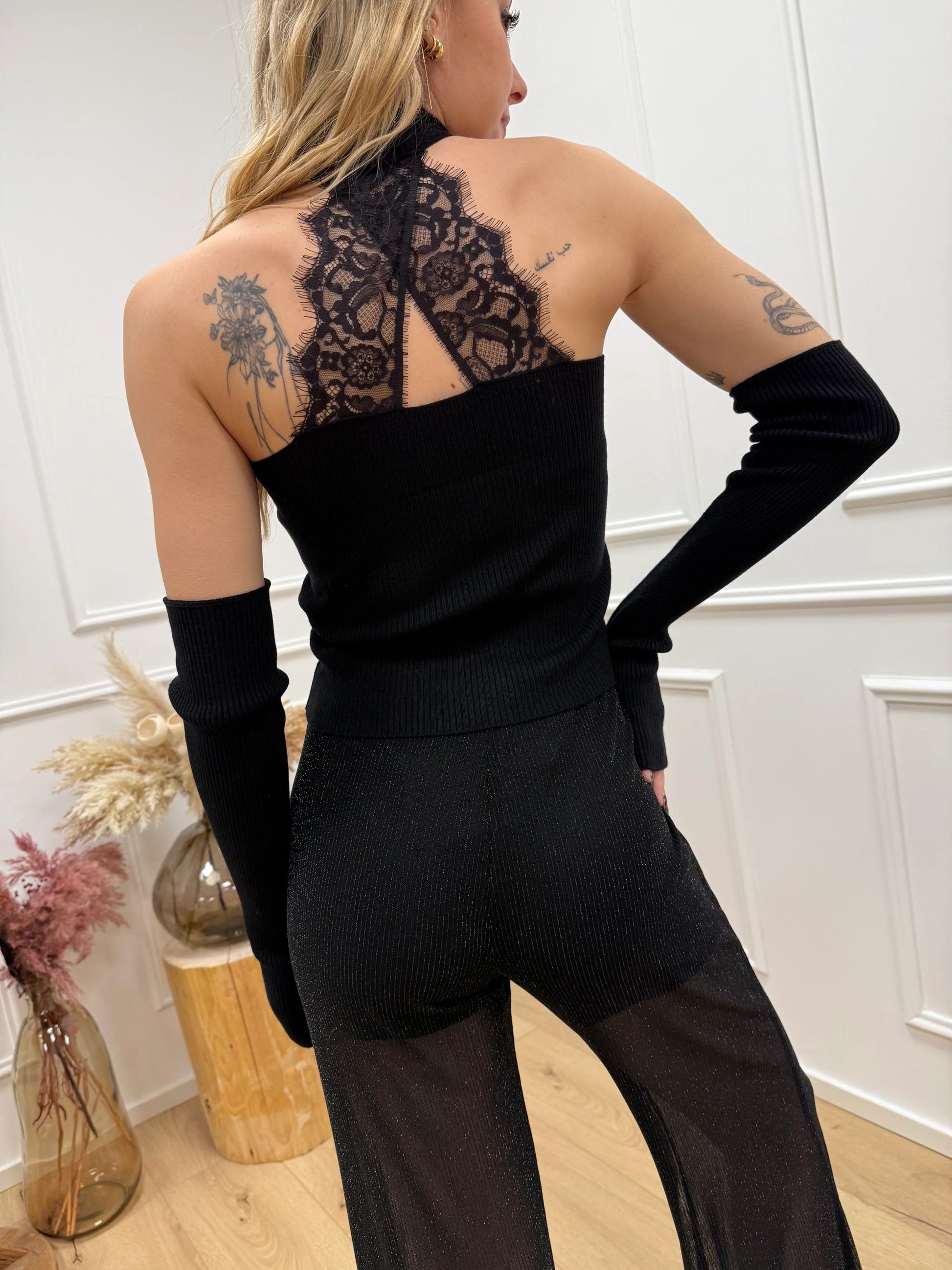 Maglia color nero a costine HaveOne. Modello scollo america e dettaglio di inserti in pizzo sul retro e manicotti.