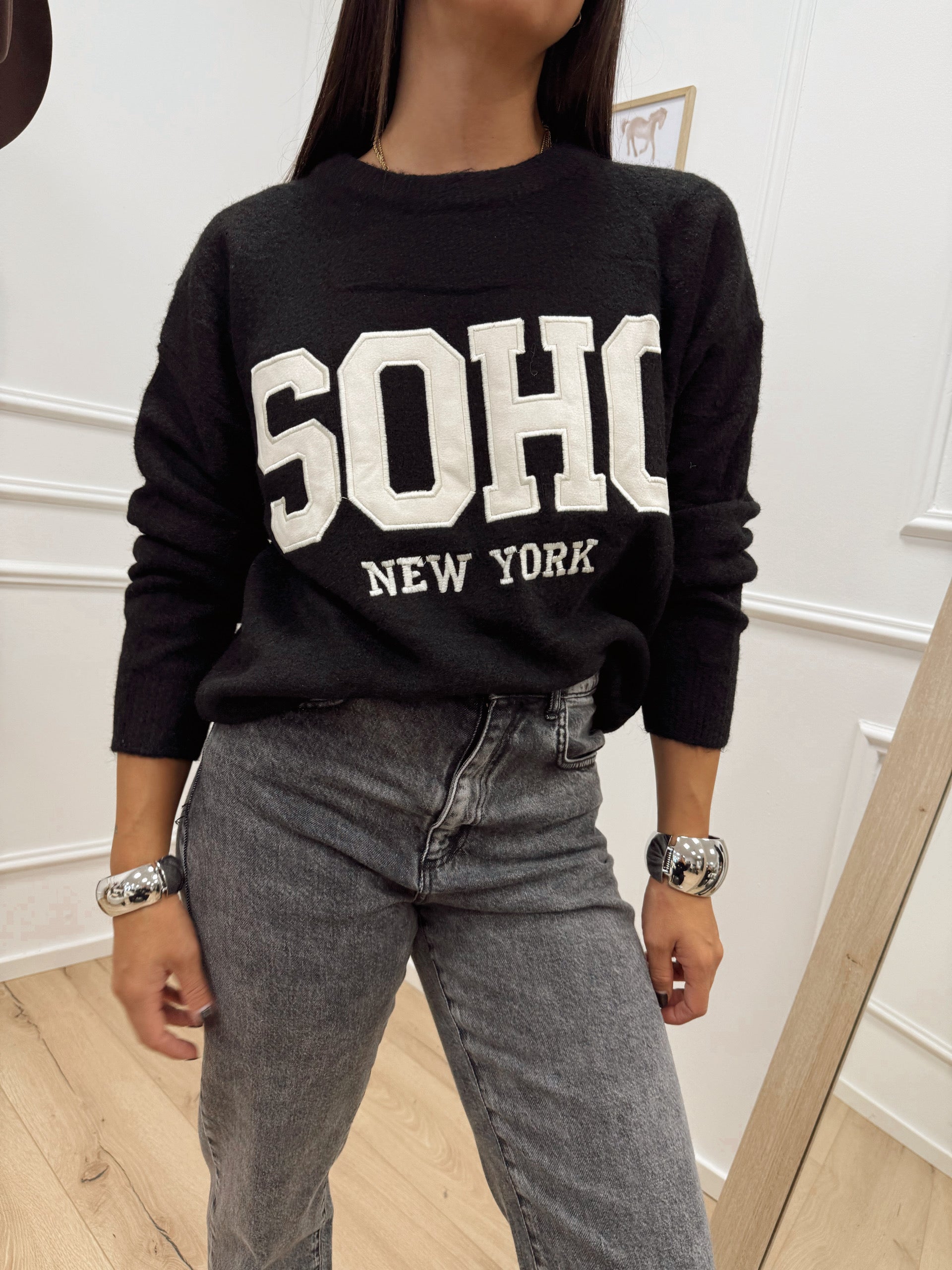Maglia color nero "Soho" misto lana HaveOne. Modello girocollo a manica lunga. Fit regolare e finiture a coste. Dettaglio di ricamo a contrasto frontale.