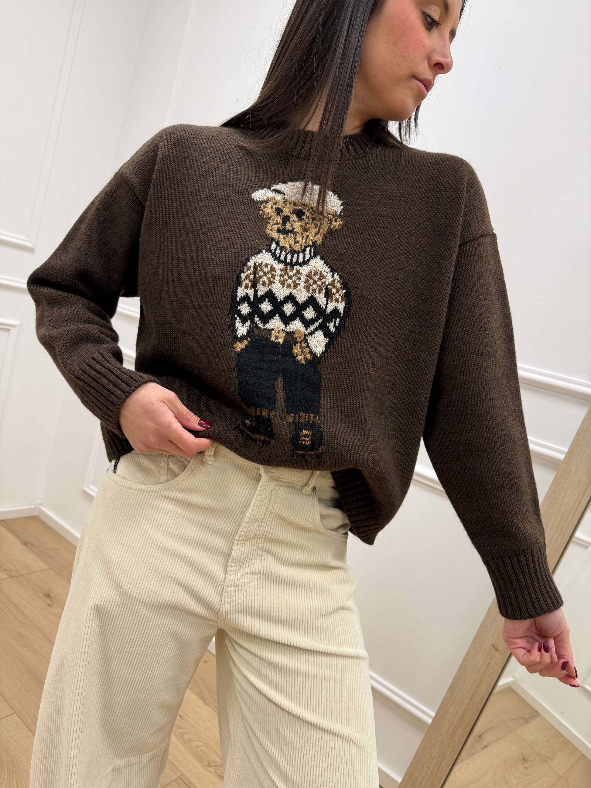 Maglia orsetto color moro Tensione In. Modello girocollo a manica lunga, fit morbido e finiture a coste.