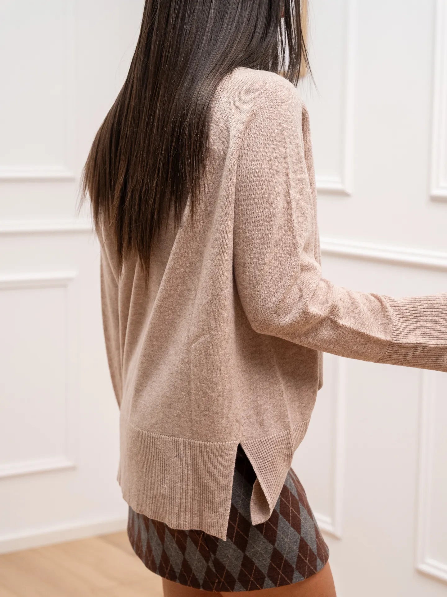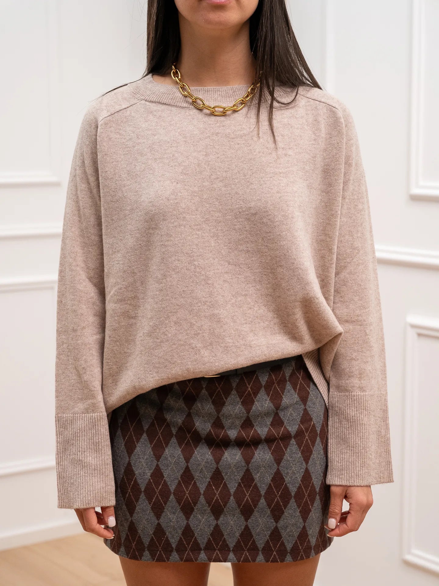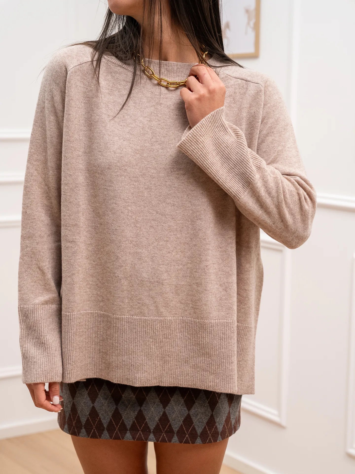 Maglia color castoro in 100% lana Tensione In. Modello fit oversize girocollo a manica lunghe con dettaglio di spacchetti laterali. Finiture a costine.