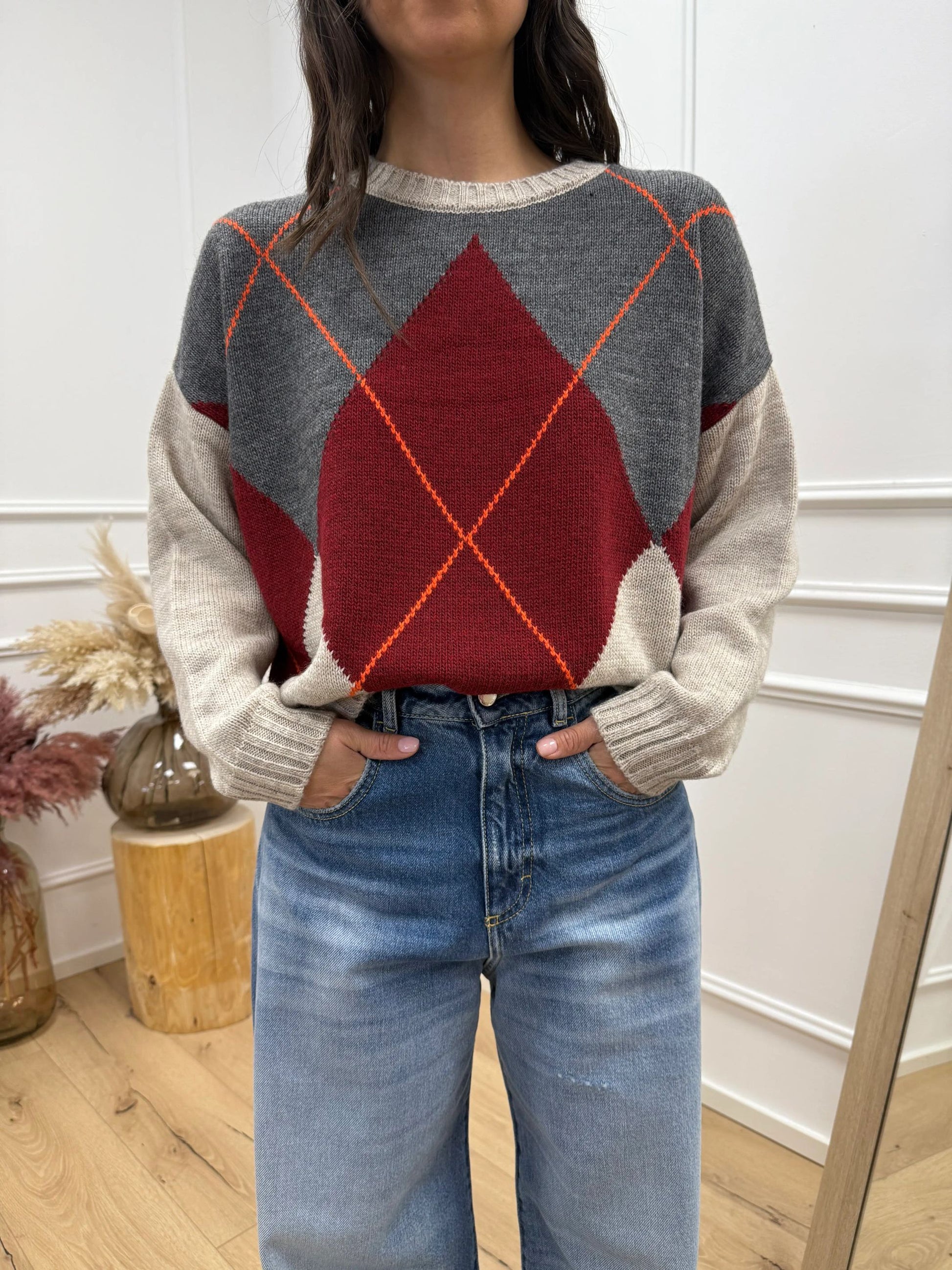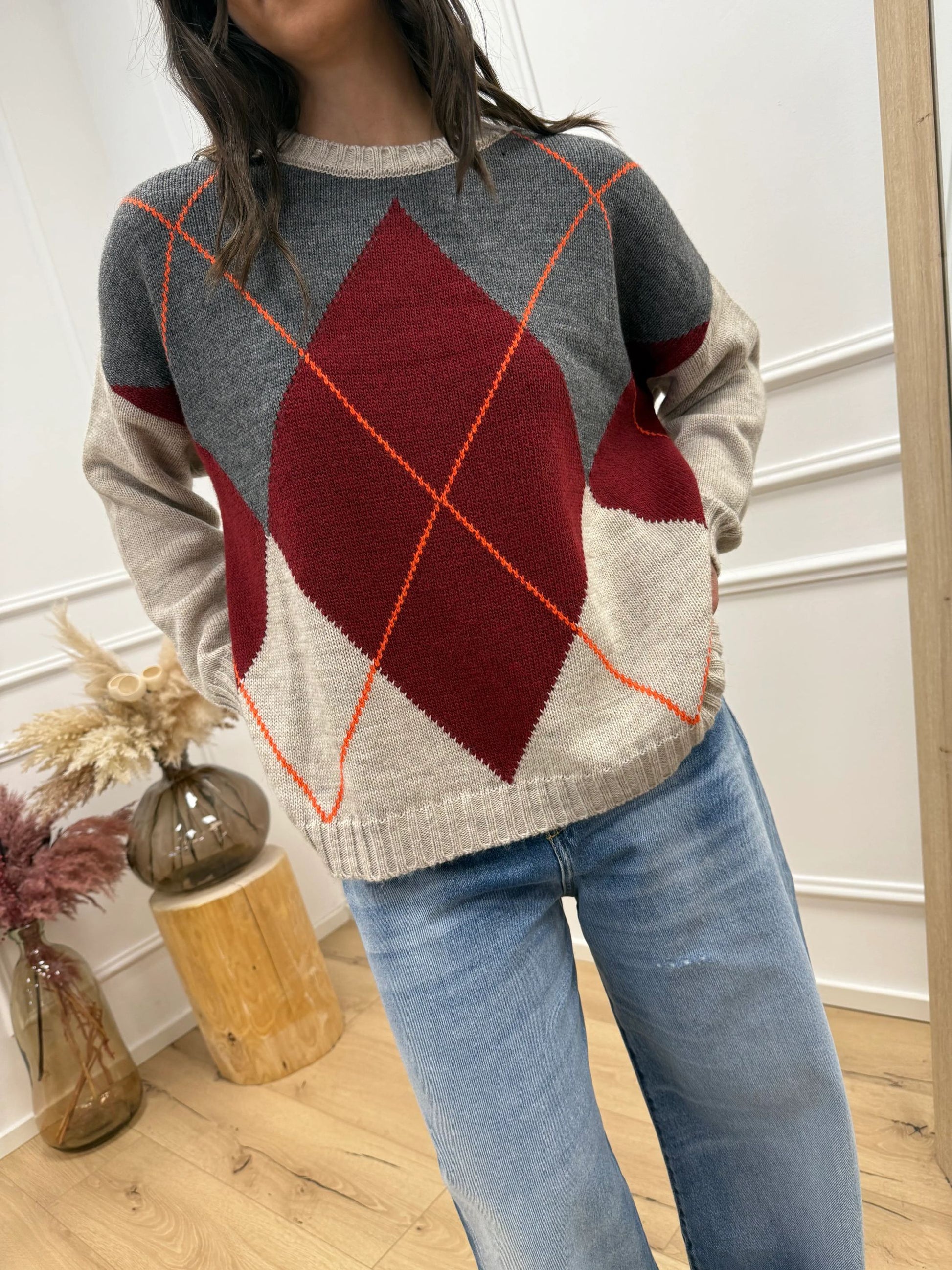 Maglia over rombi beige, rubino, antracite e arancio - HaveOne