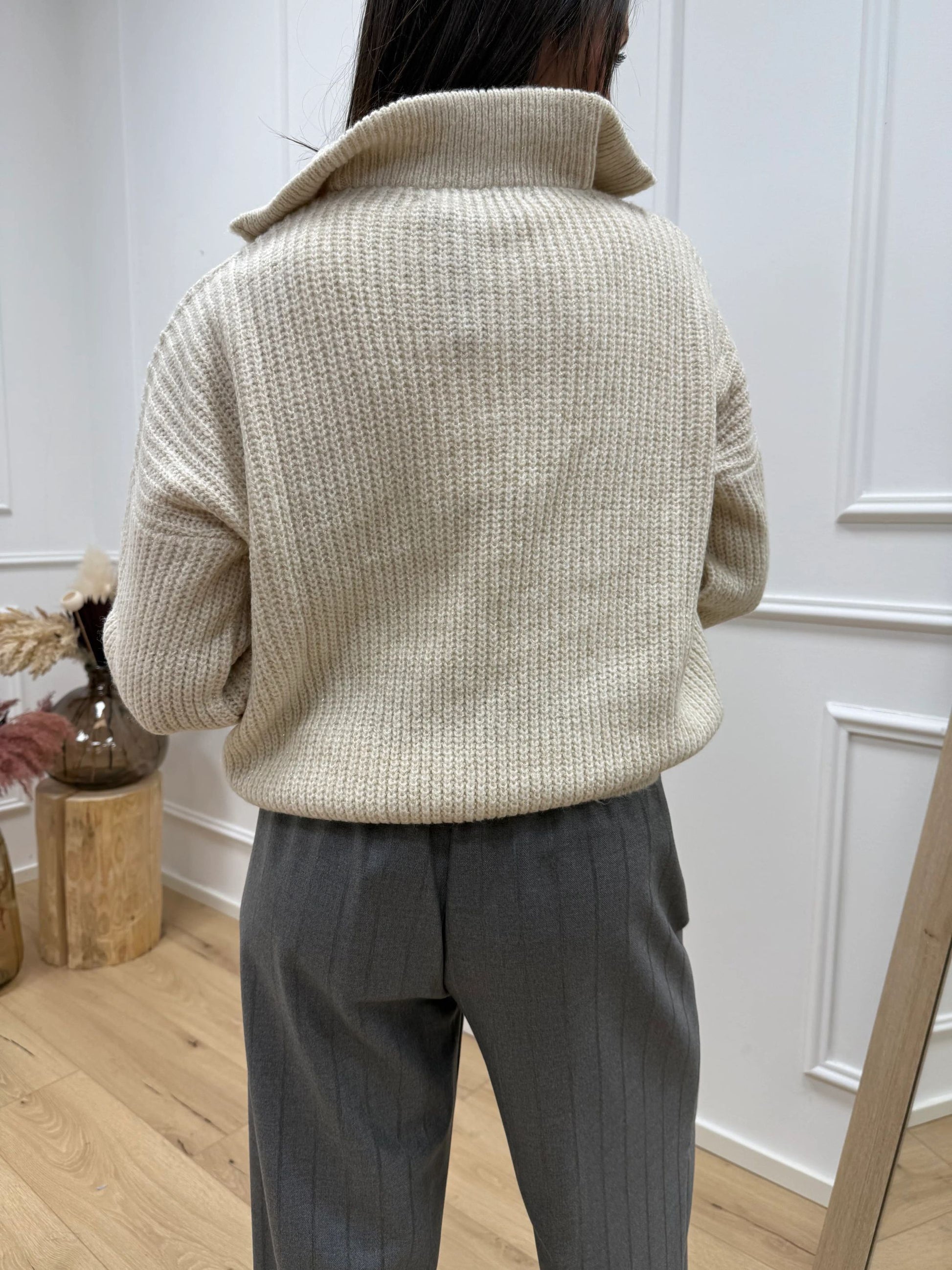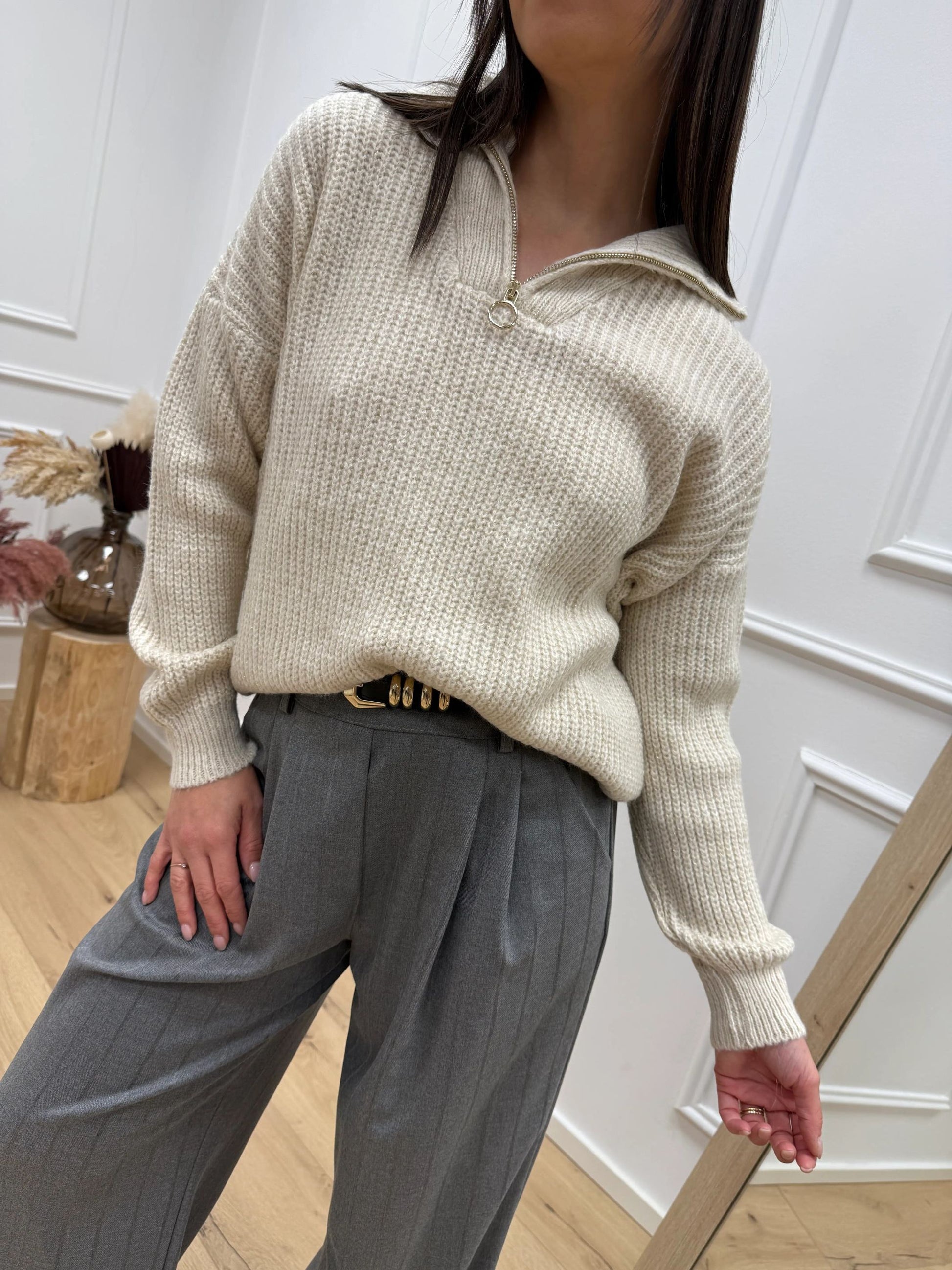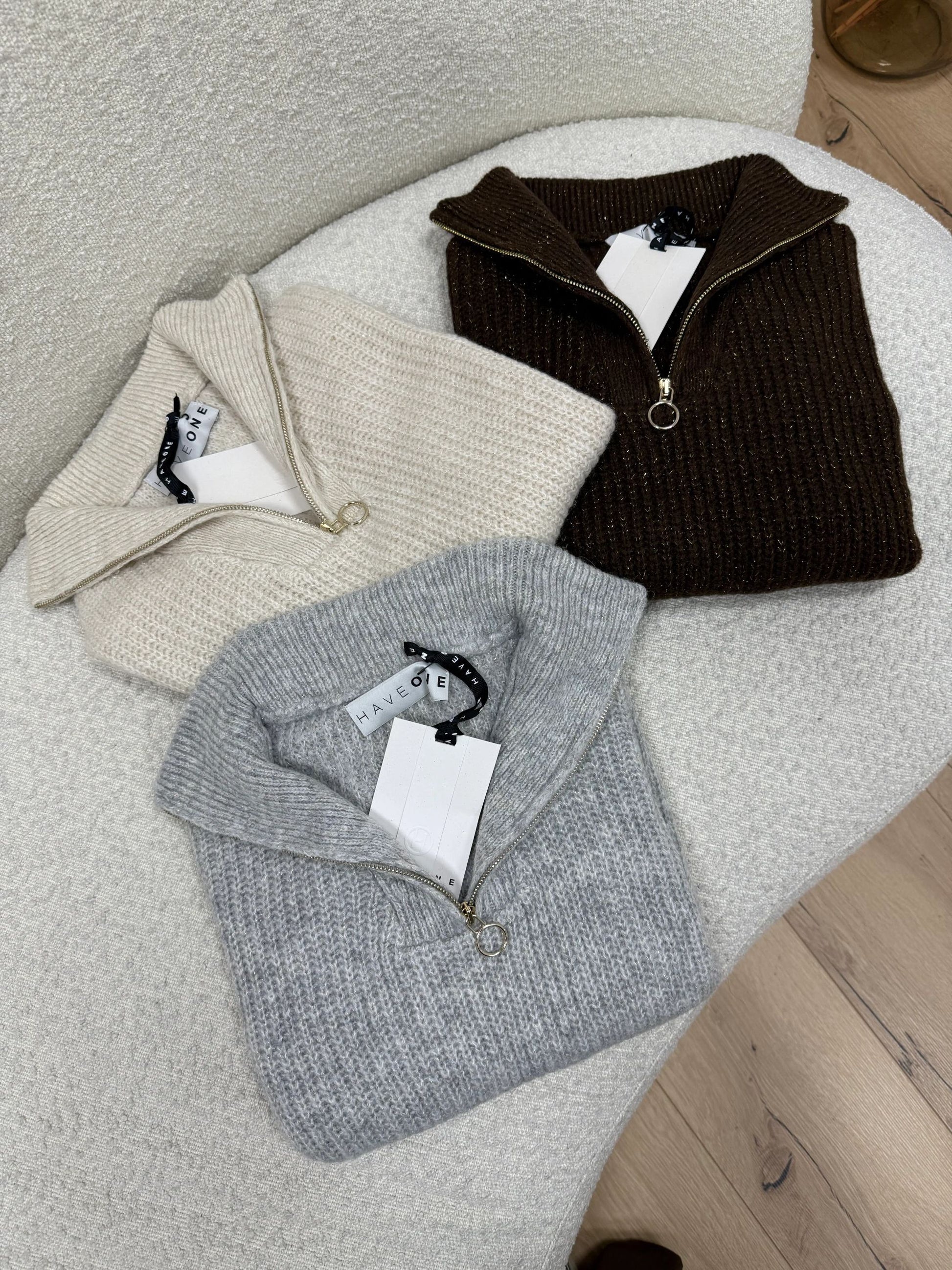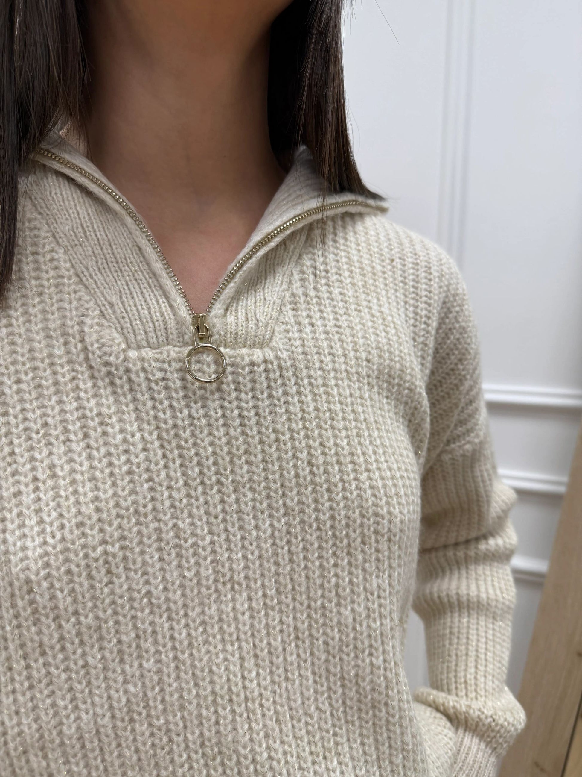 Maglia color panna con filo lamè oro HaveOne. Modello fit regolare con collo alto e zip. Finiture a coste.