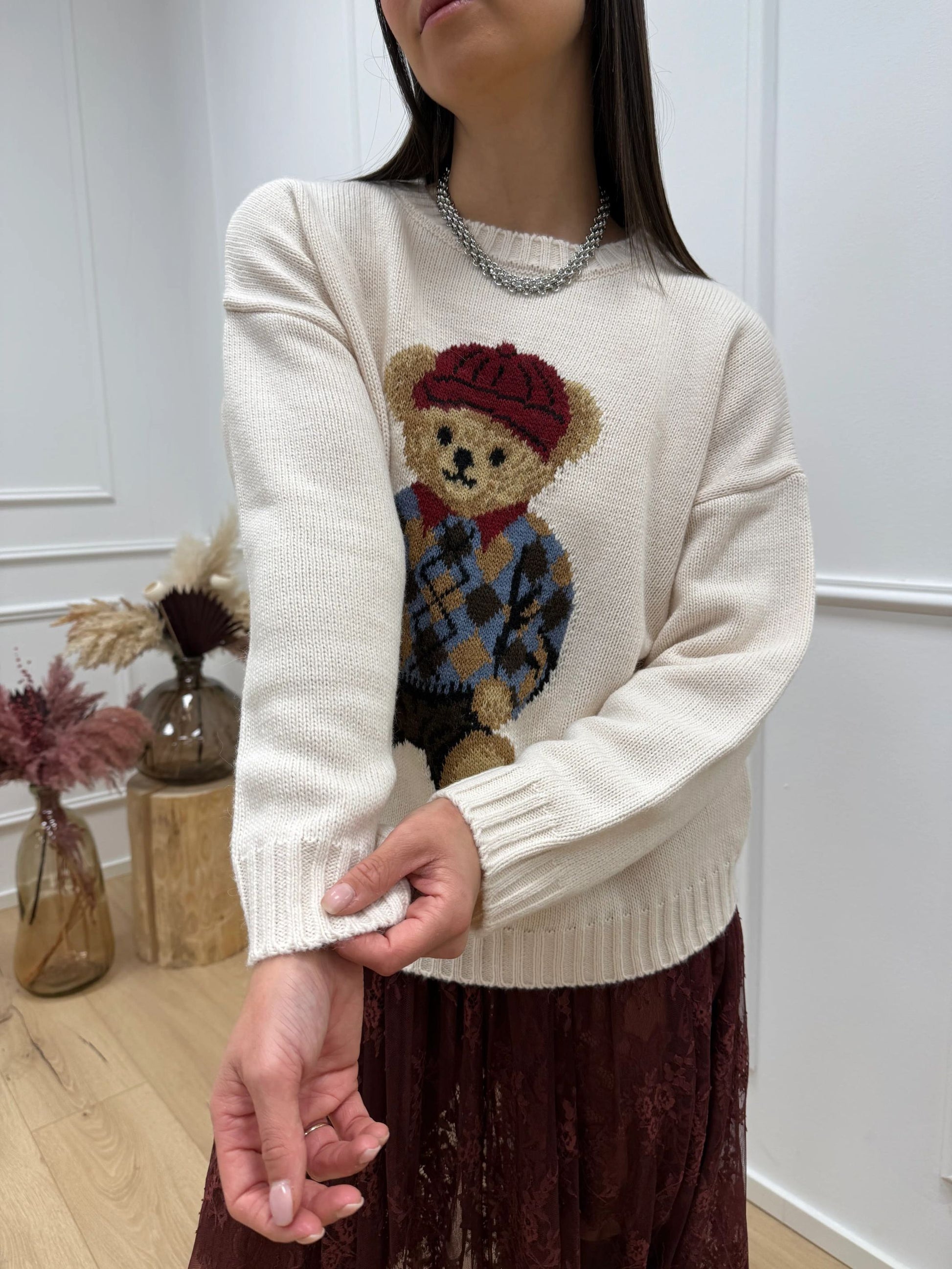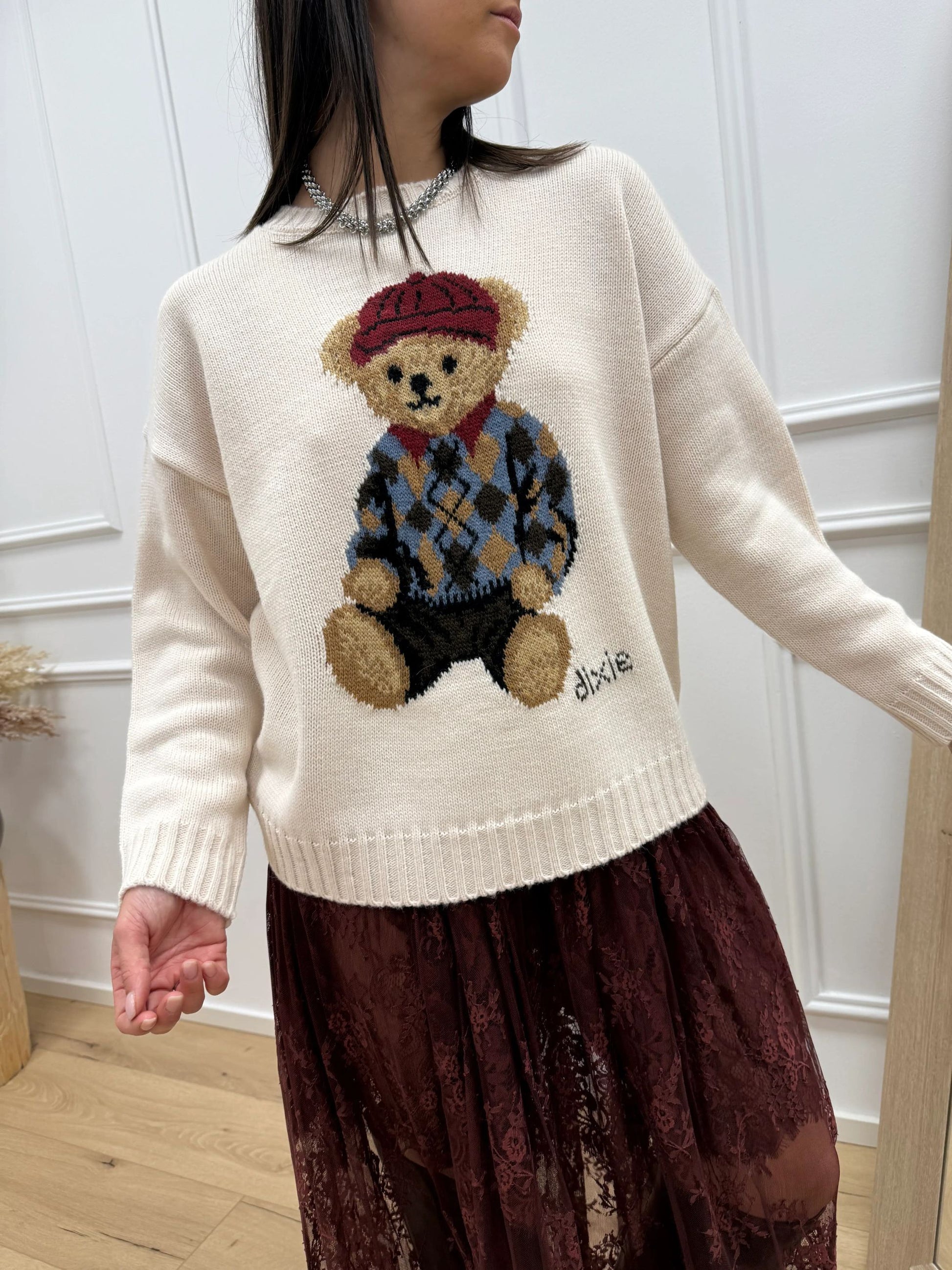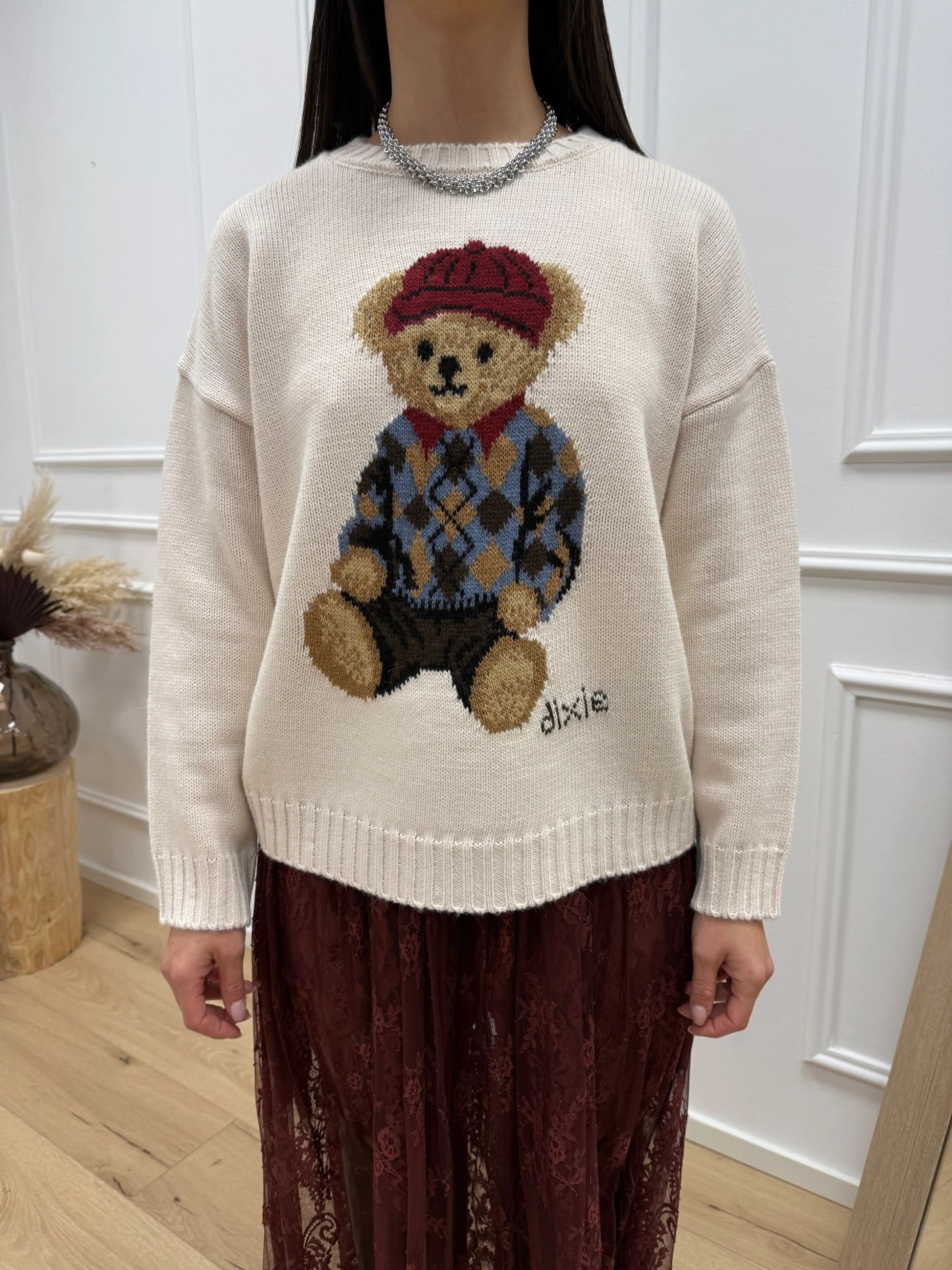 Maglia color panna misto lana Dixie. Modello fit oversize girocollo a manica lunga. Finiture a costine e dettaglio di stampa frontale teddy multicolore.