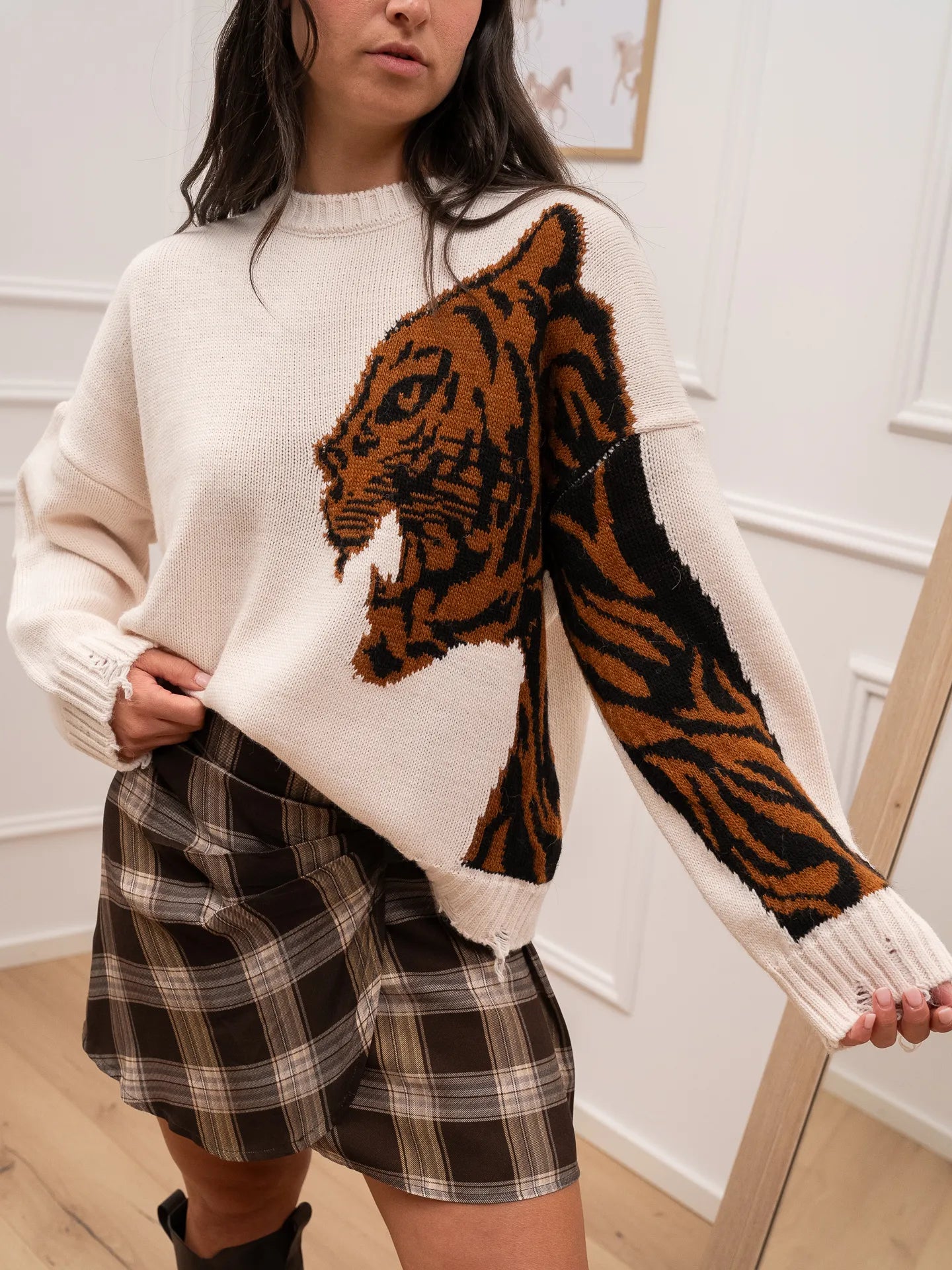 Maglia color pasta HaveOne. Modello fit morbido girocollo a manica lunga. Dettaglio di finiture a coste con rotture. Stampa frontale tigre color bruciato a contrasto.