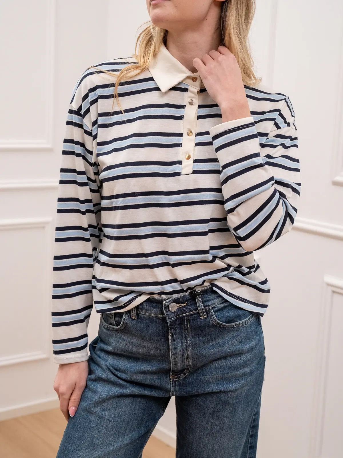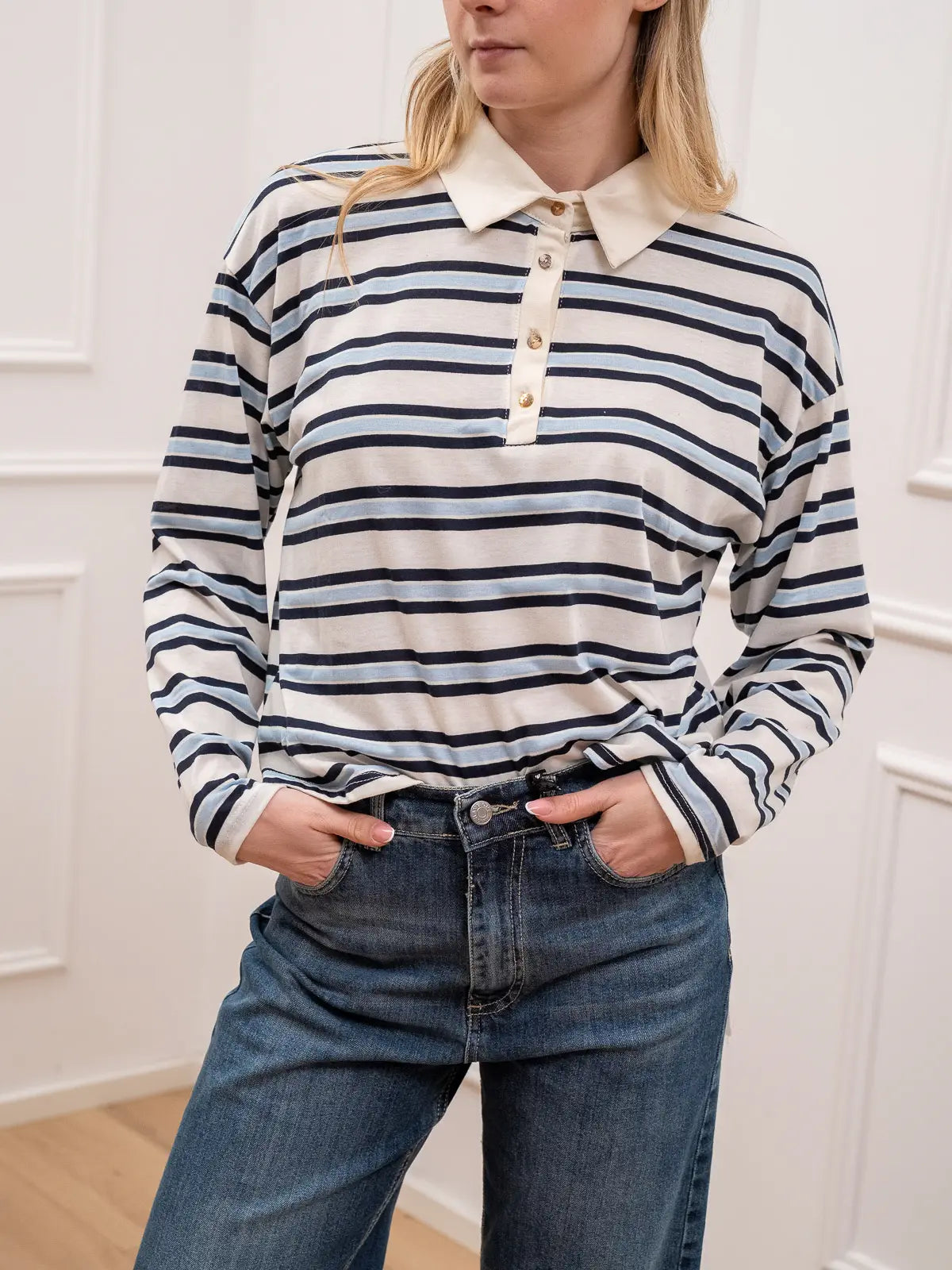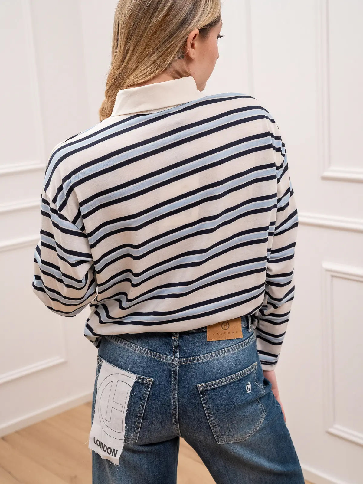Maglia polo rigata blu, celeste e bianco HaveOne. Modello fit oversize a manica lunga con colletto e bottoncini frontali.