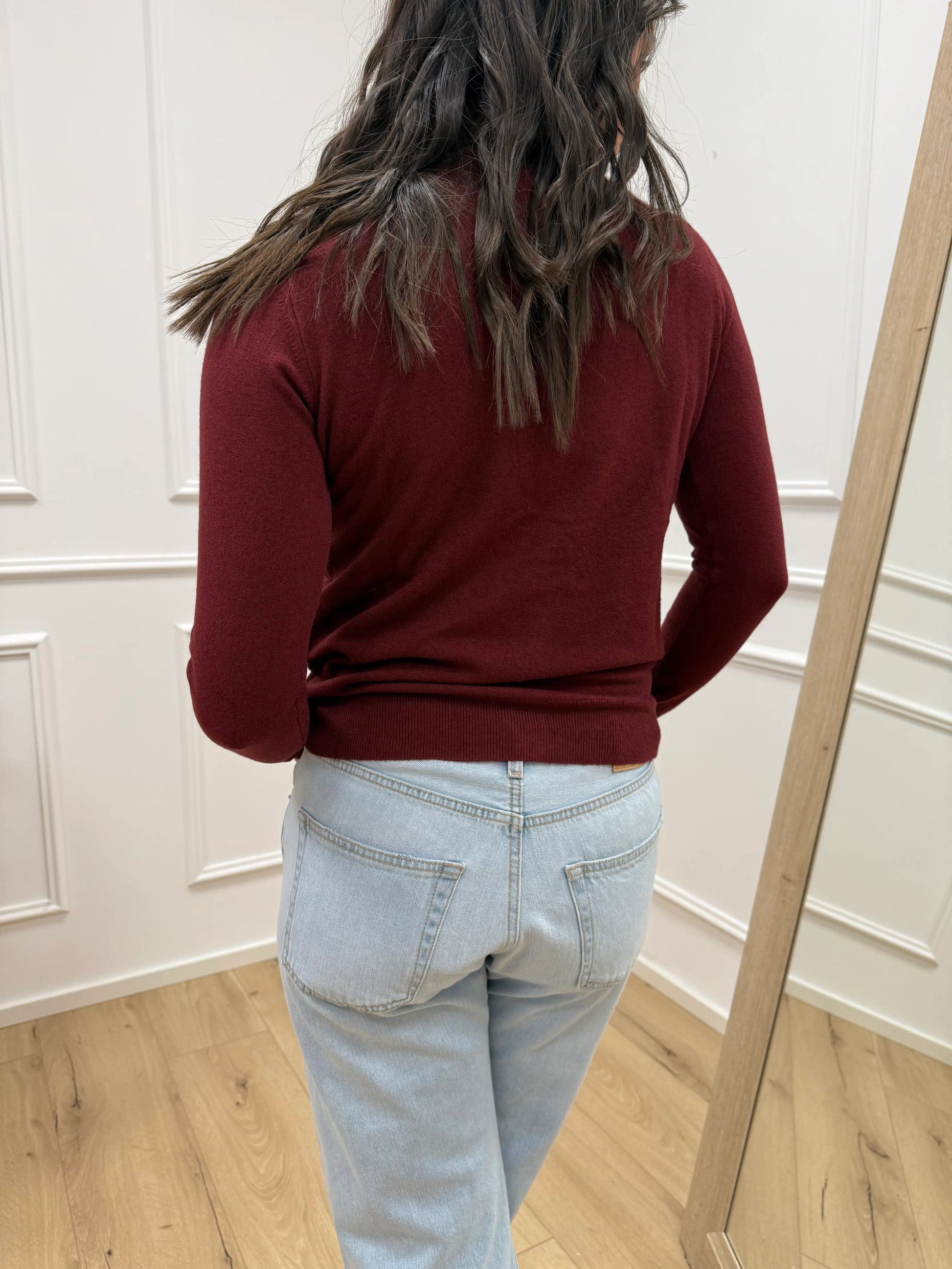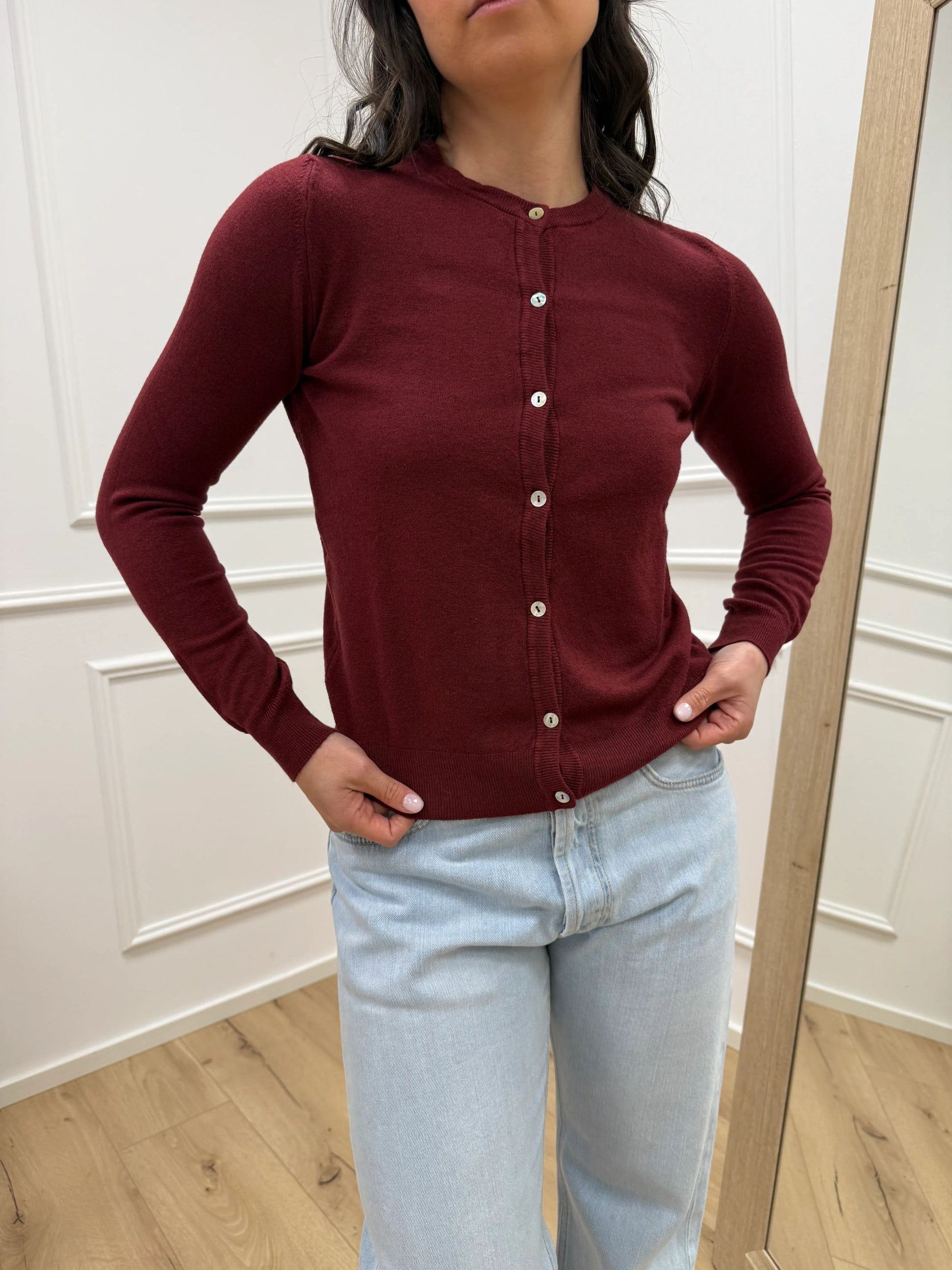 Maglia rebecchina misto lana color bordeaux HaveOne. Modello girocollo a manica lunga con chiusura frontale a bottoncini. Finiture a costine.