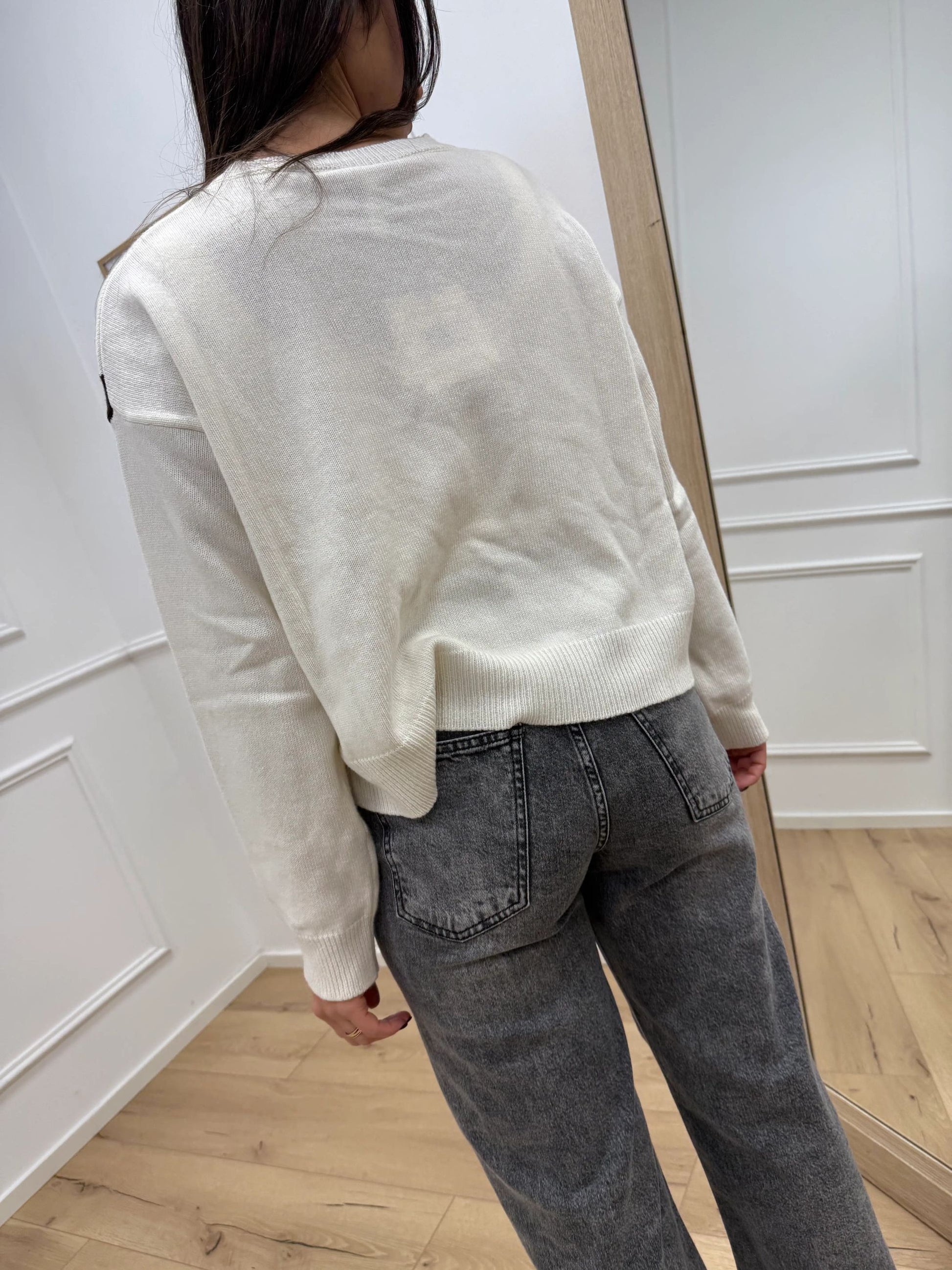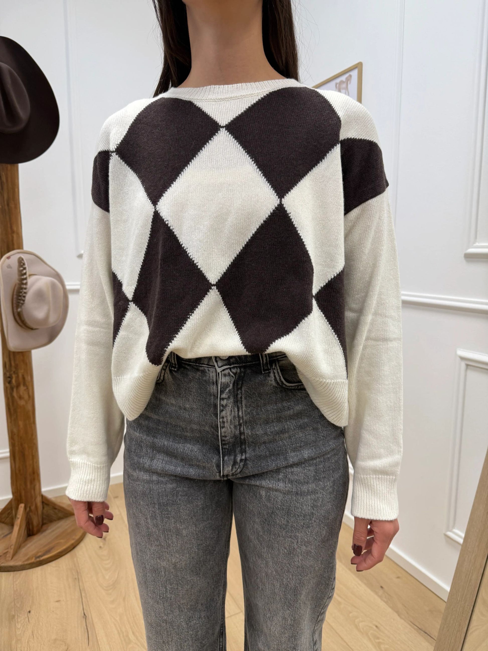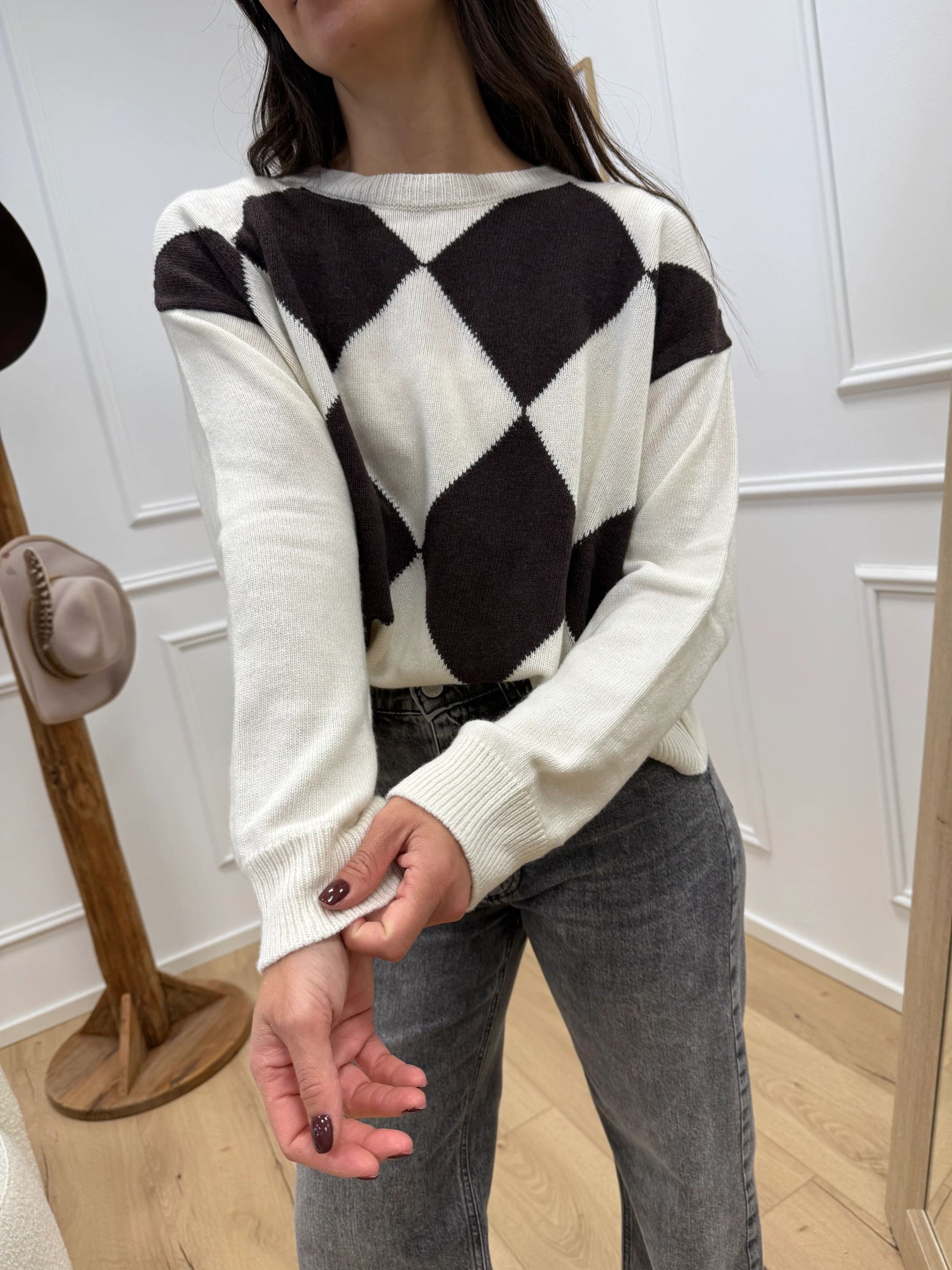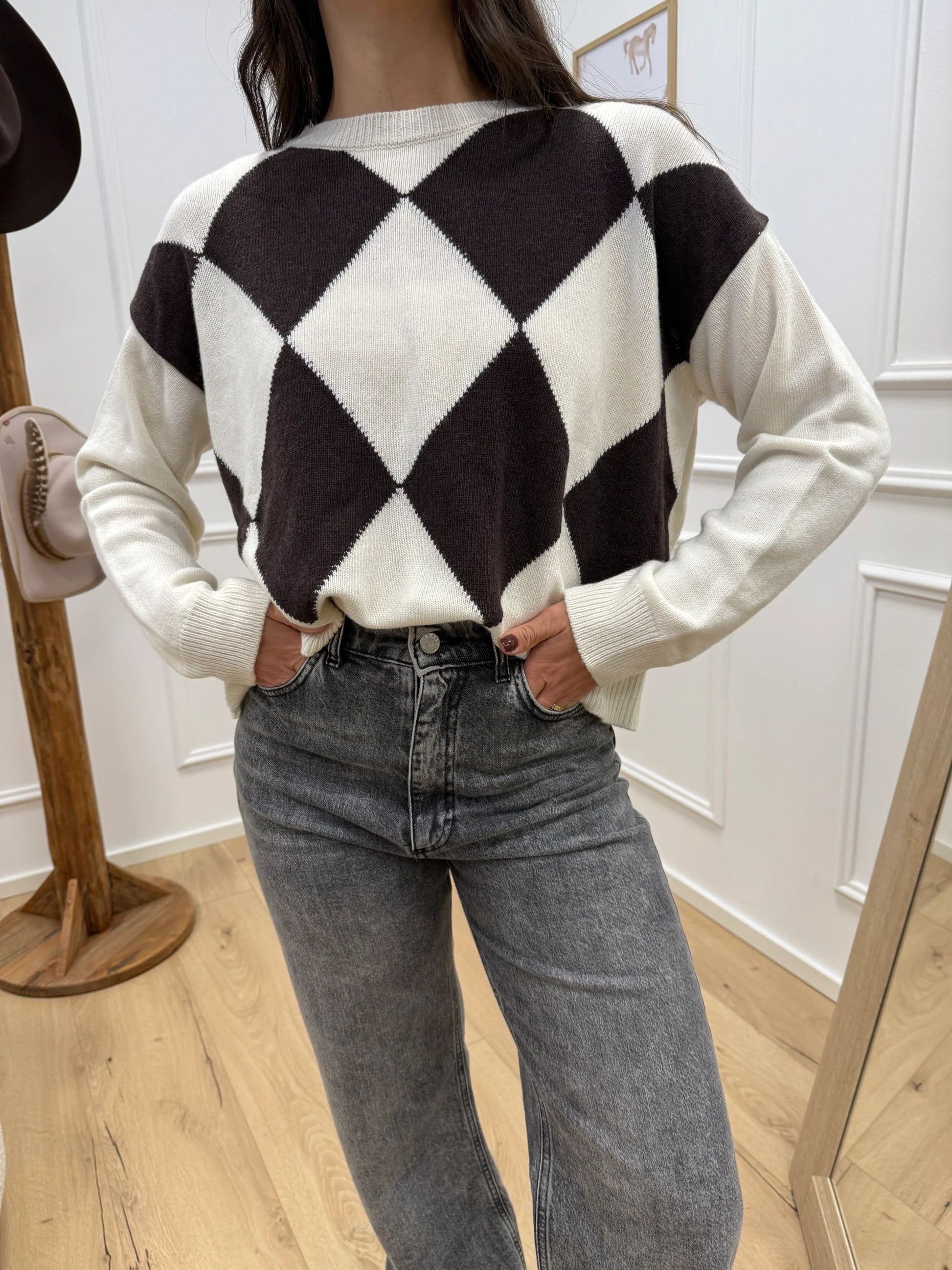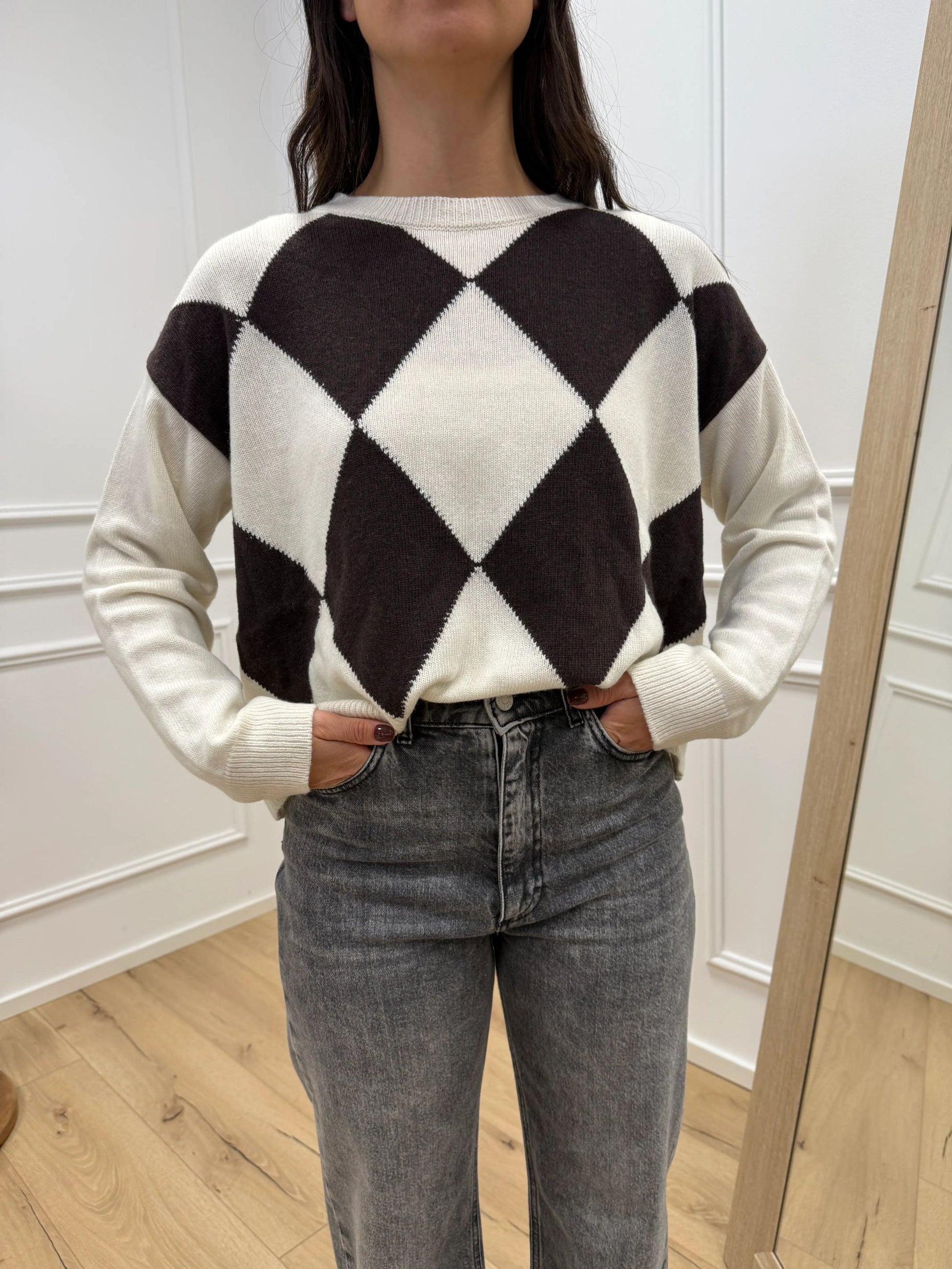 Maglia fantasia rombi azzurro e moro Tensione In. Modello girocollo a maniche lunghe con finiture a costine.