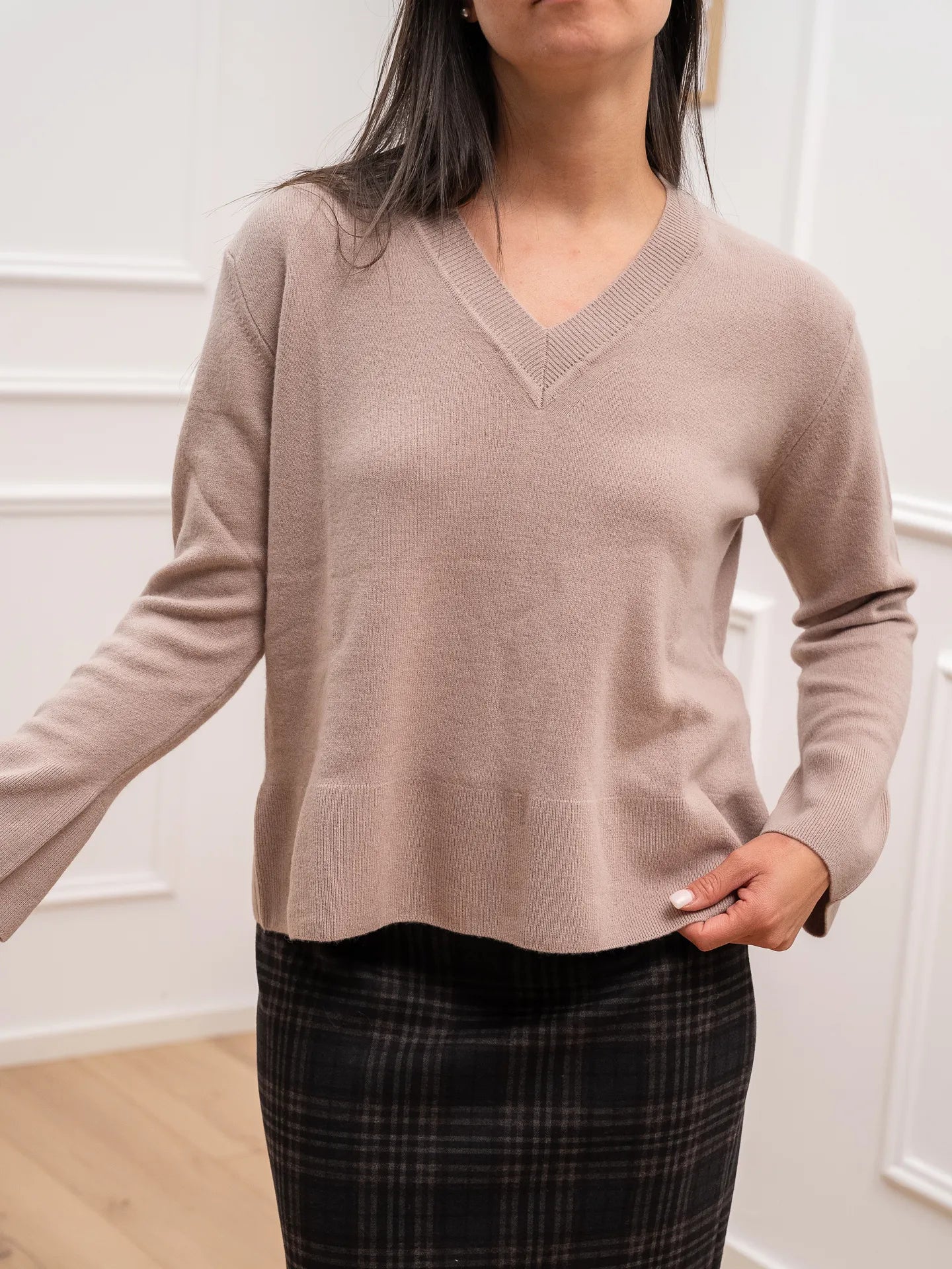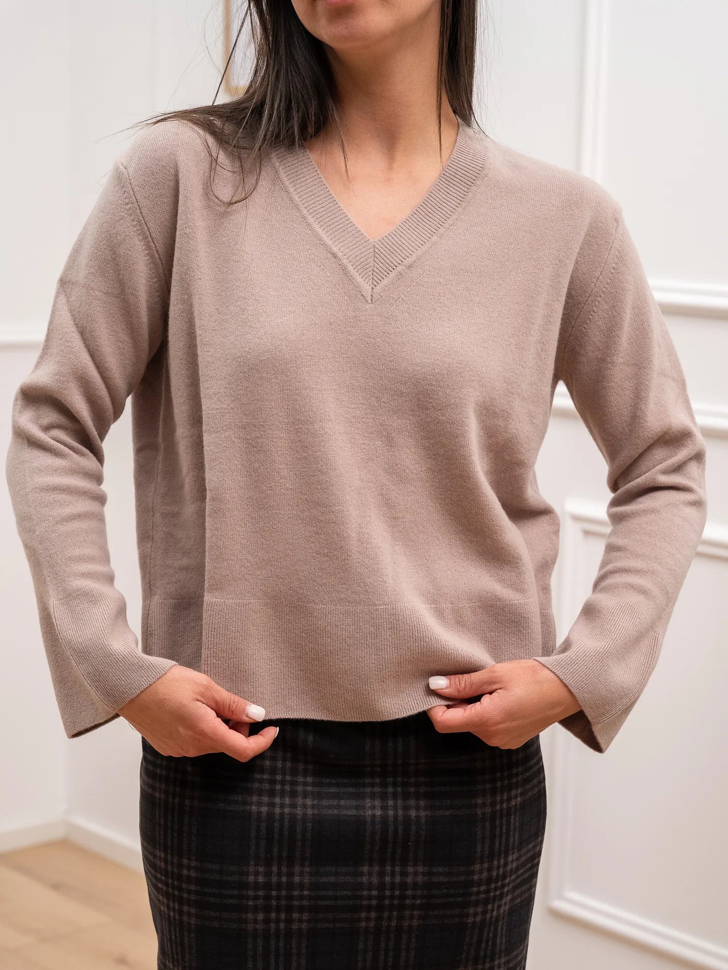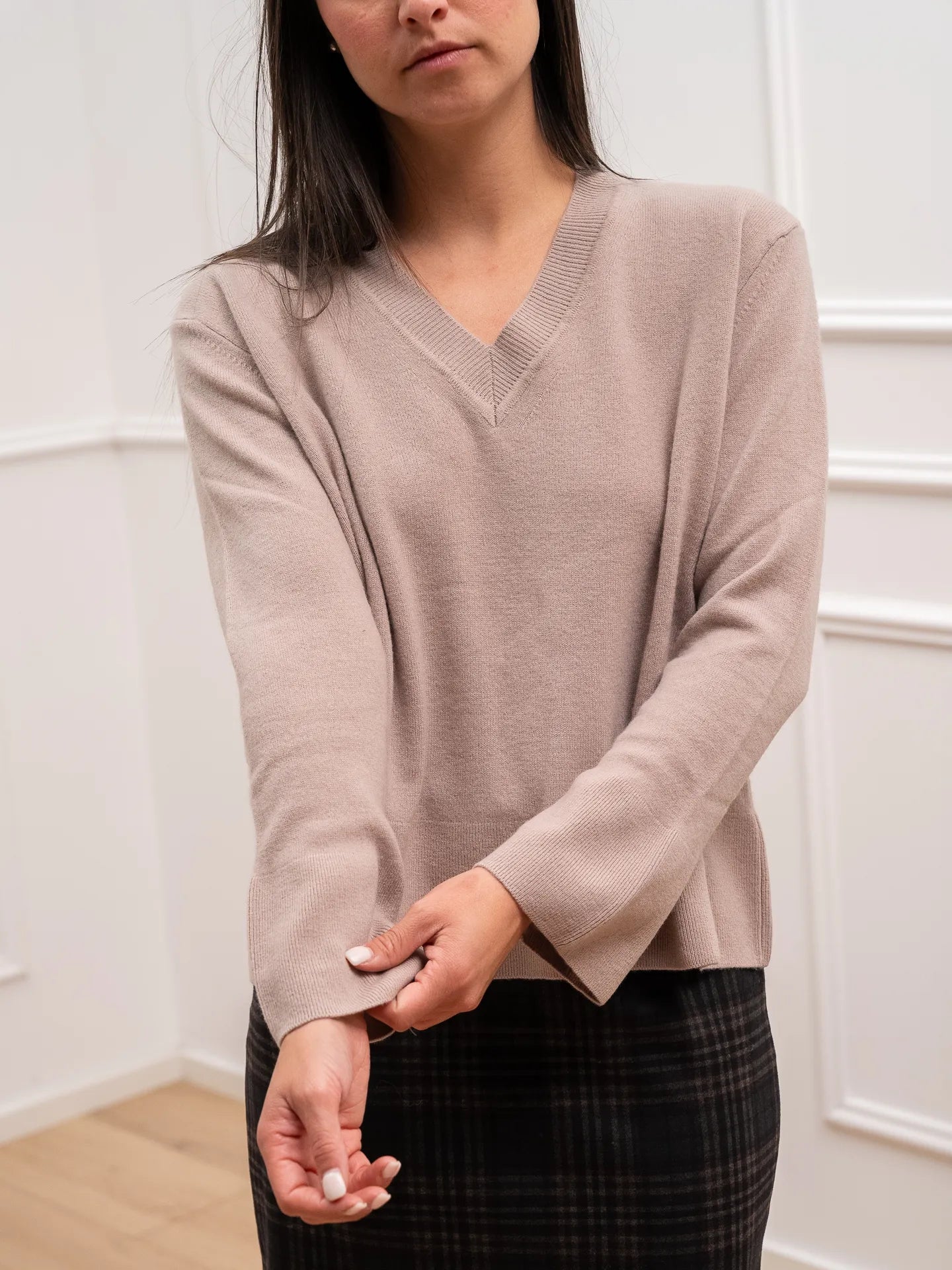 Maglia color beige 100% lana vergine HaveOne. Modello basic scollo a v e maniche lunghe con finiture a costine. Fit morbido.