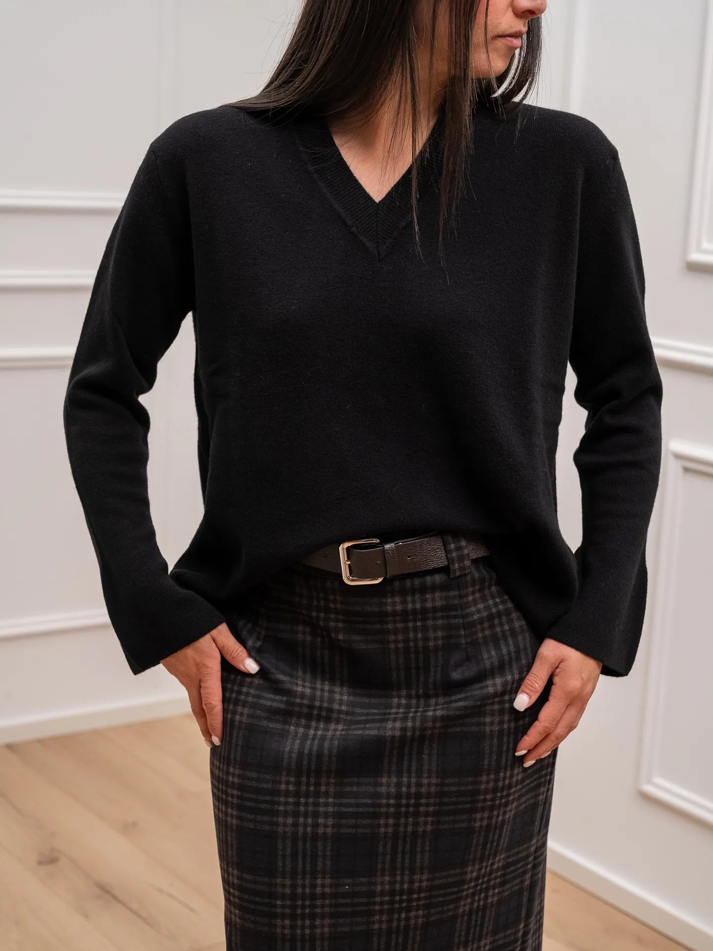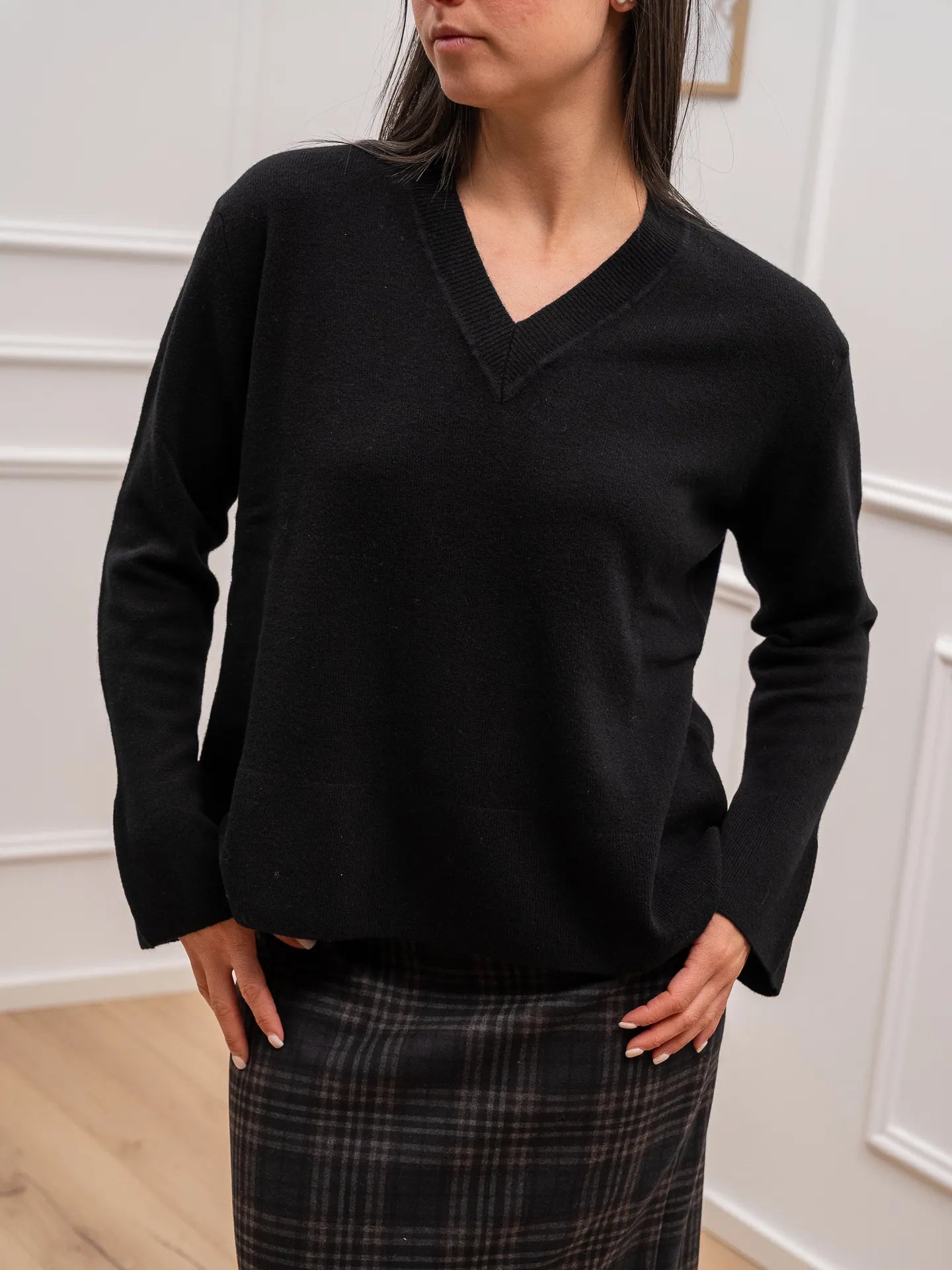 Maglia color nero 100% lana vergine HaveOne. Modello basic scollo a v e maniche lunghe con finiture a costine. Fit morbido.