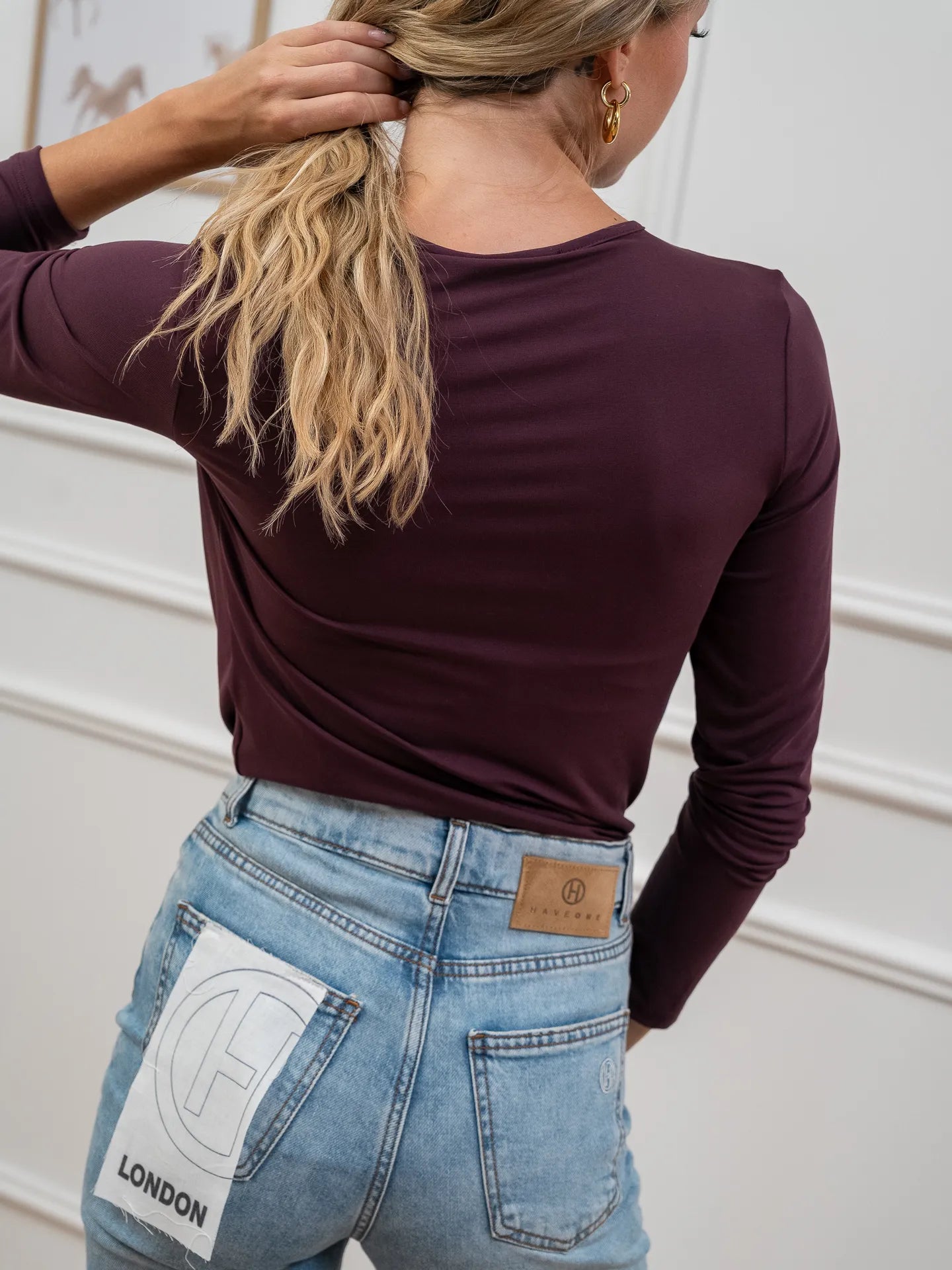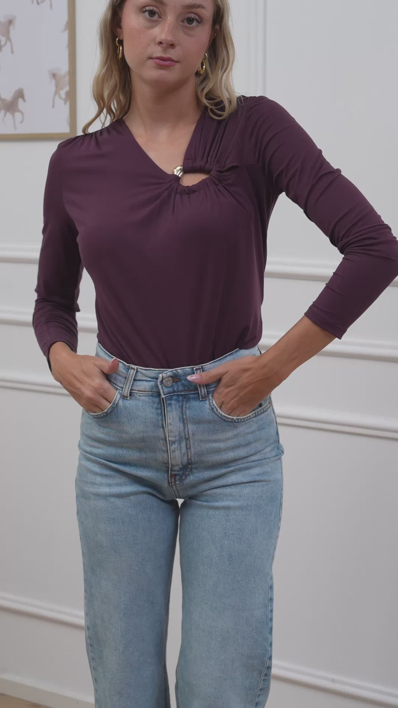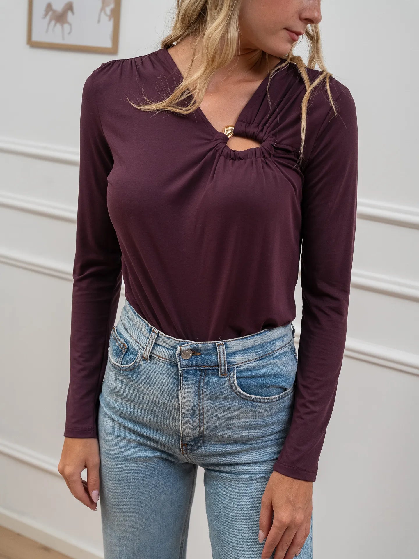 Maglia color vino in modal Vicolo. Modello a manica lunga girocollo con dettaglio di anello dorato frontale.