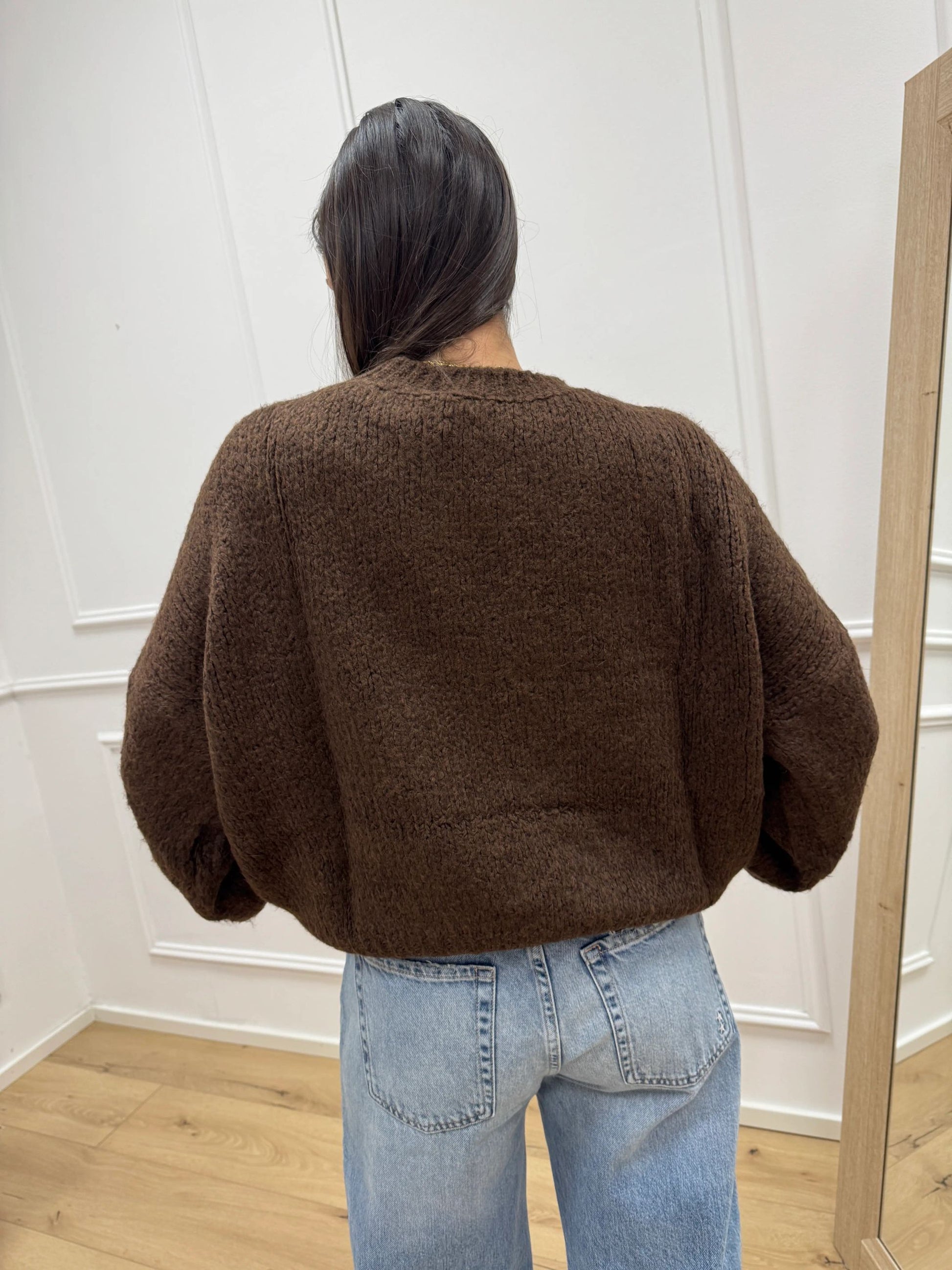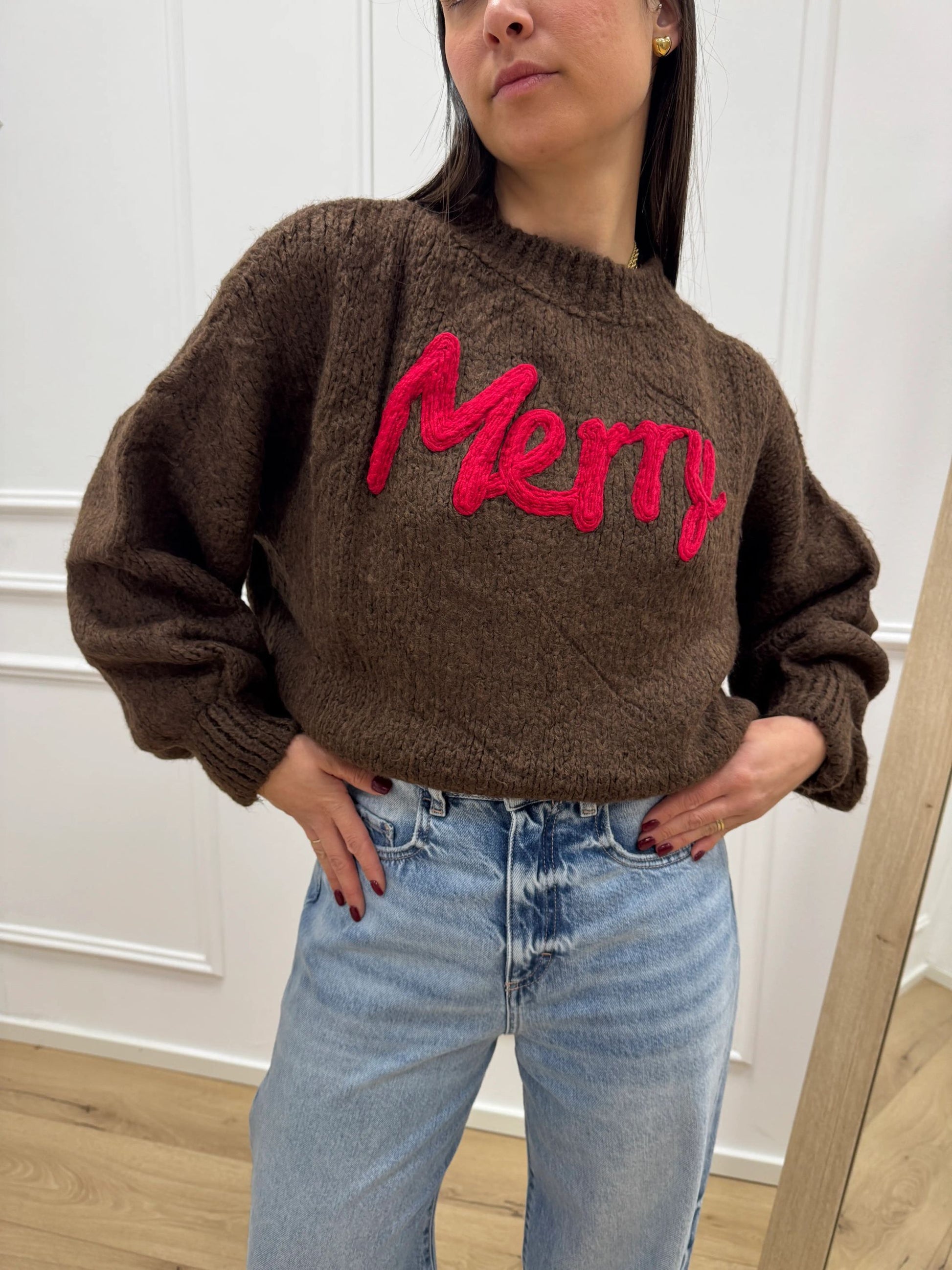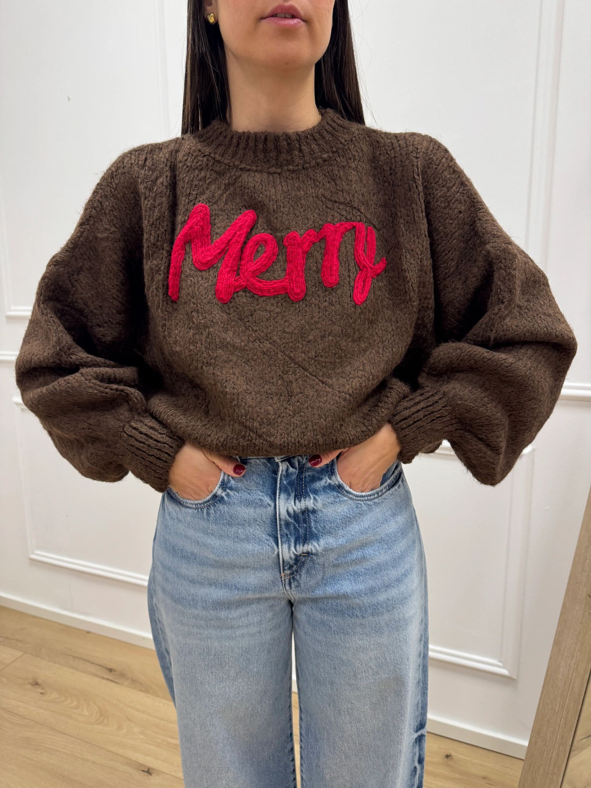 Maglione colo moro You Decide. Modello girocollo fit morbido con manica a palloncino. Finiture a coste. Dettaglio di ricamo Merry a contrasto frontale.