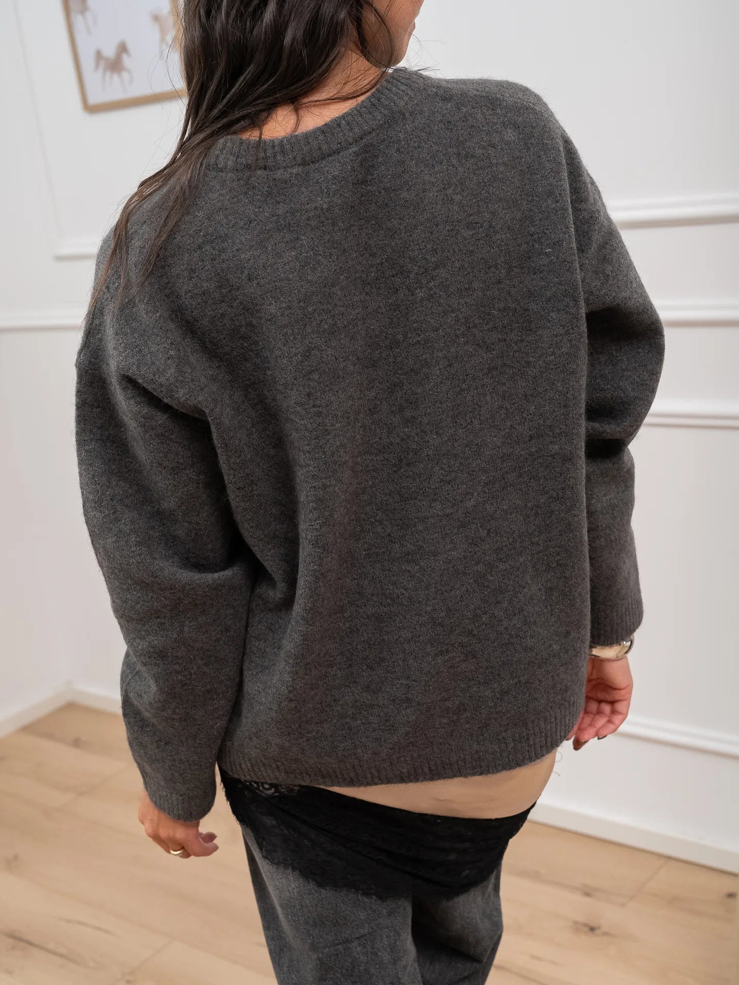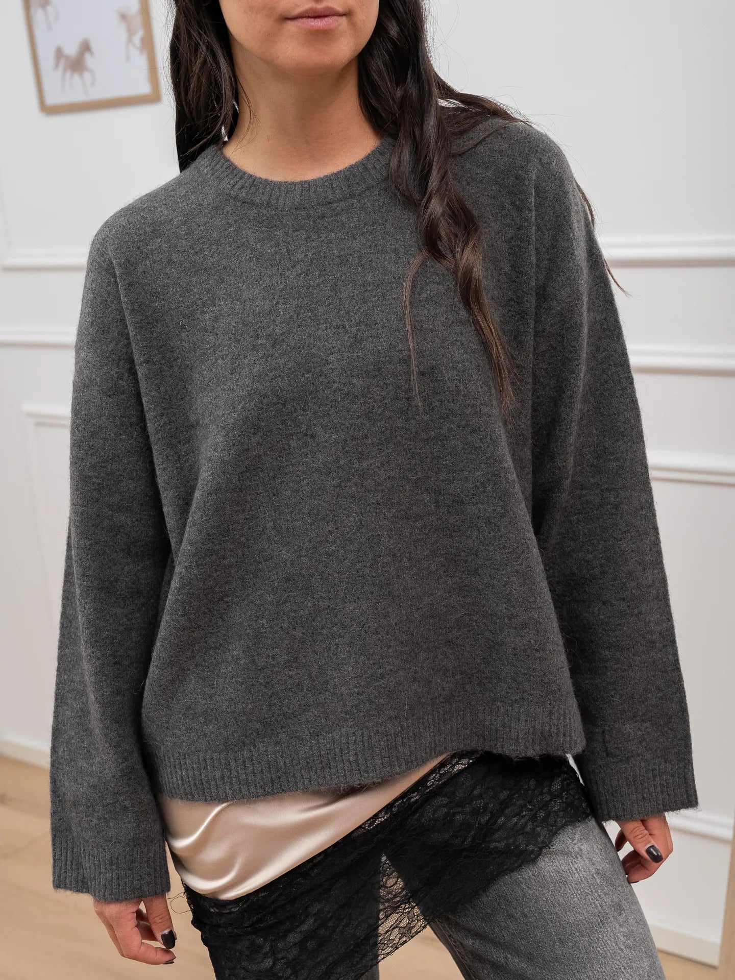 Maglione soffice color grigio misto lana JJXX. Modello fit oversize girocollo a manica lunga. Finiture a coste.