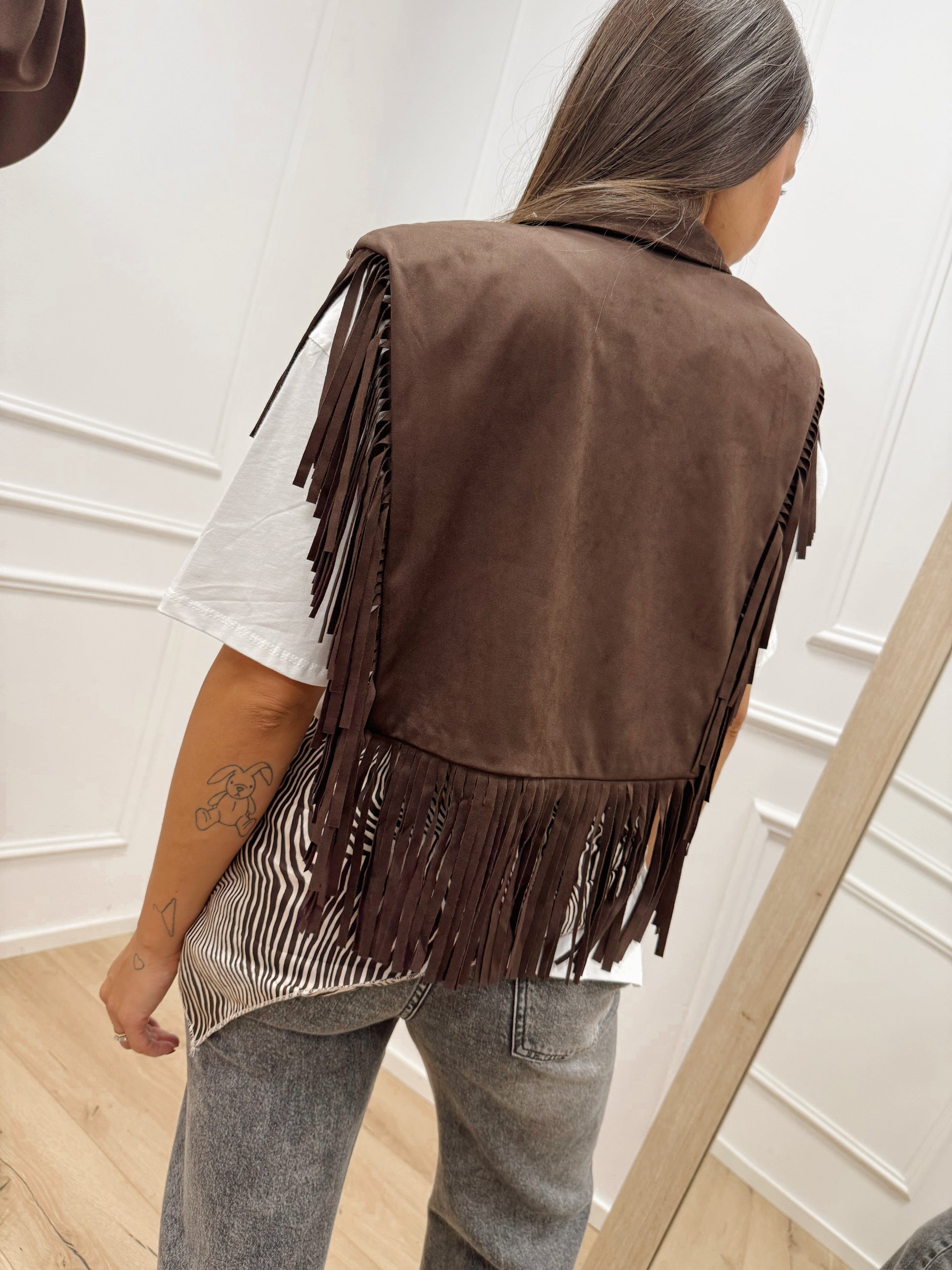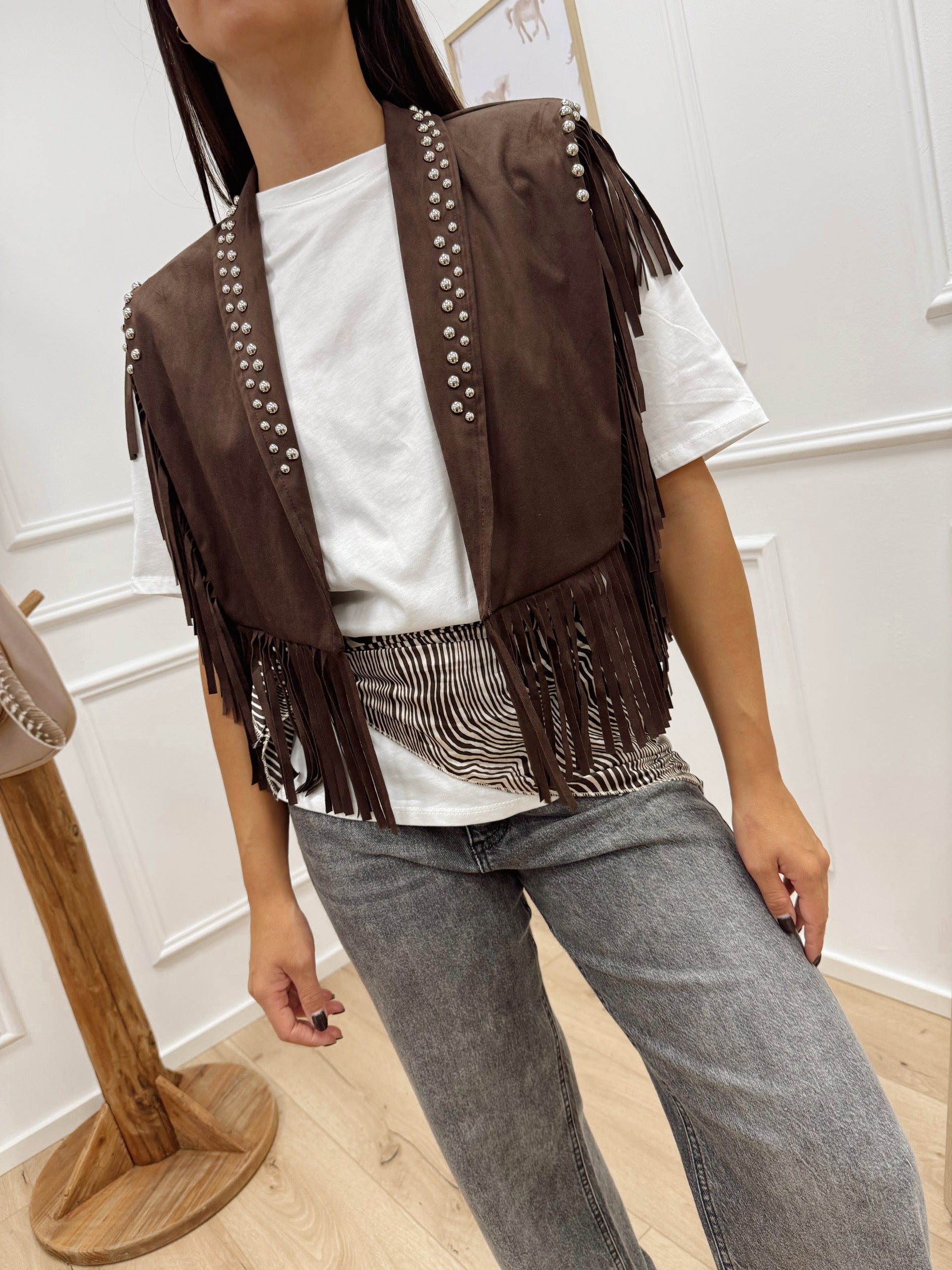 Mantella in dainetto color moro HaveOne. Modello fit regolare con spalla imbottita, dettaglio di frange a cascata e borchie rotonde argento.