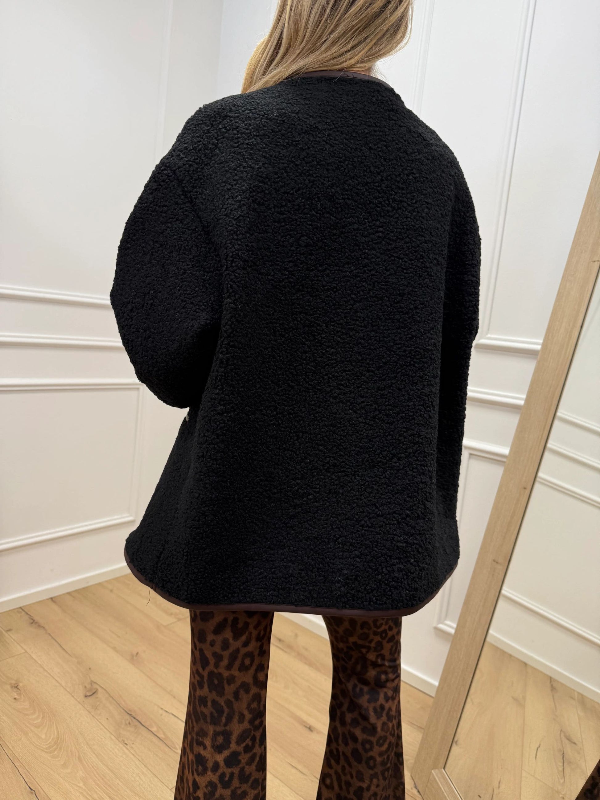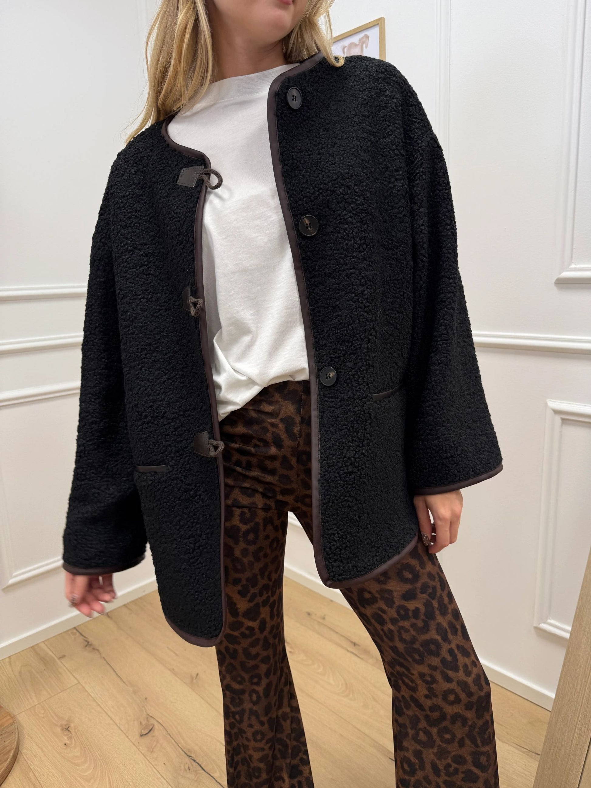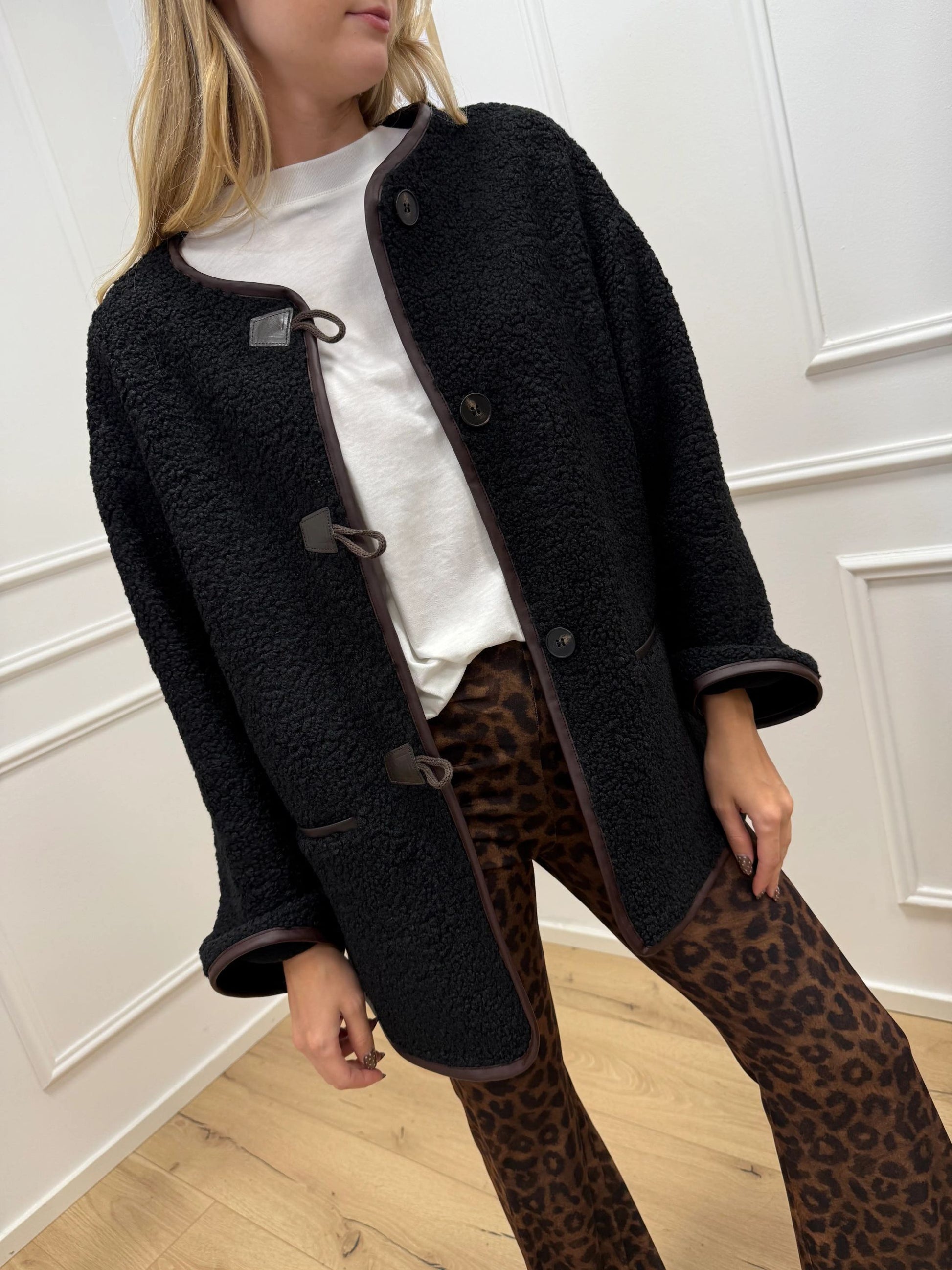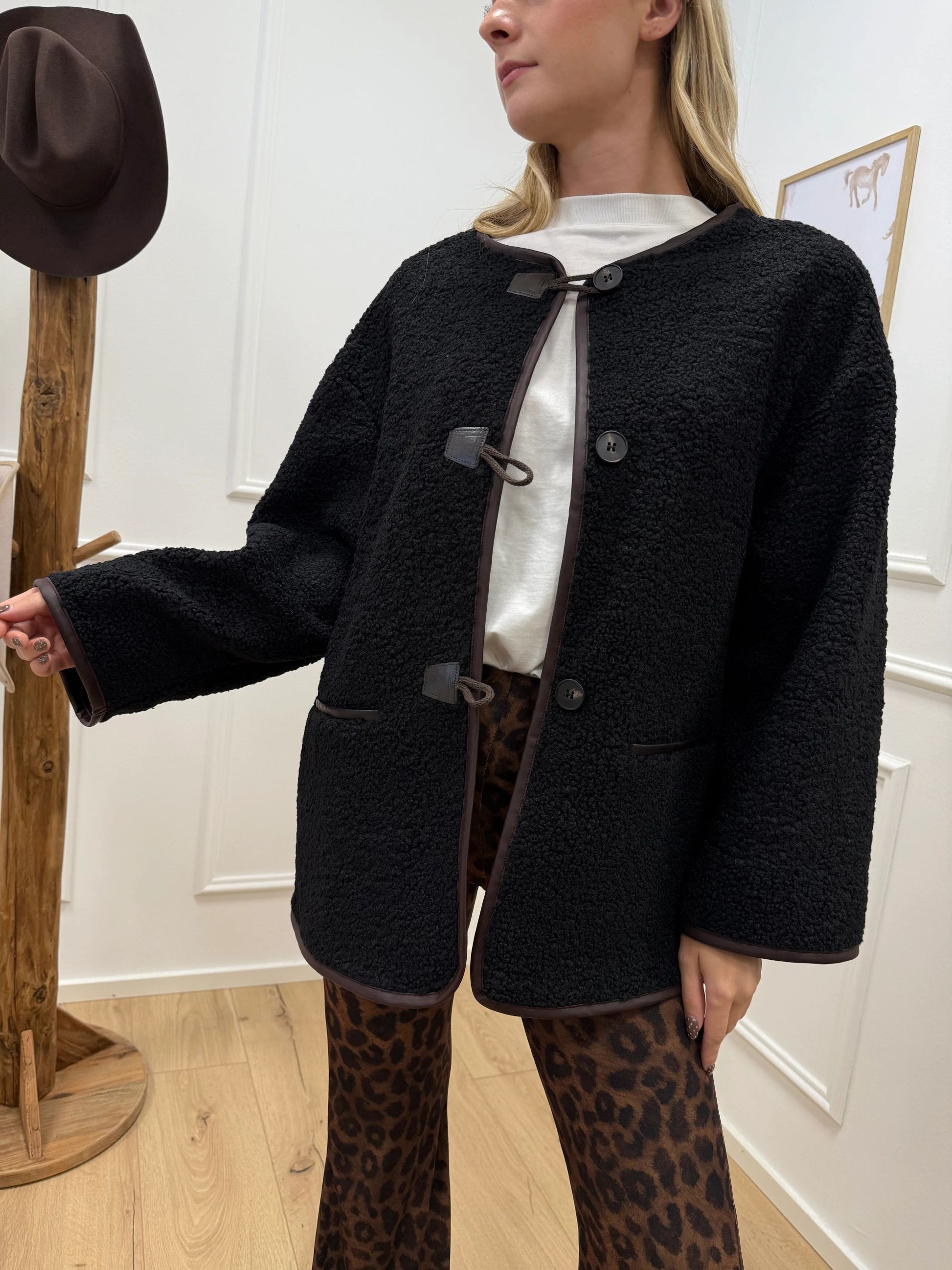 Montone color nero Vicolo. Modello fit oversize girocollo, chiusura frontale con alamari e finiture in ecopelle. Finte tasche a filetto.