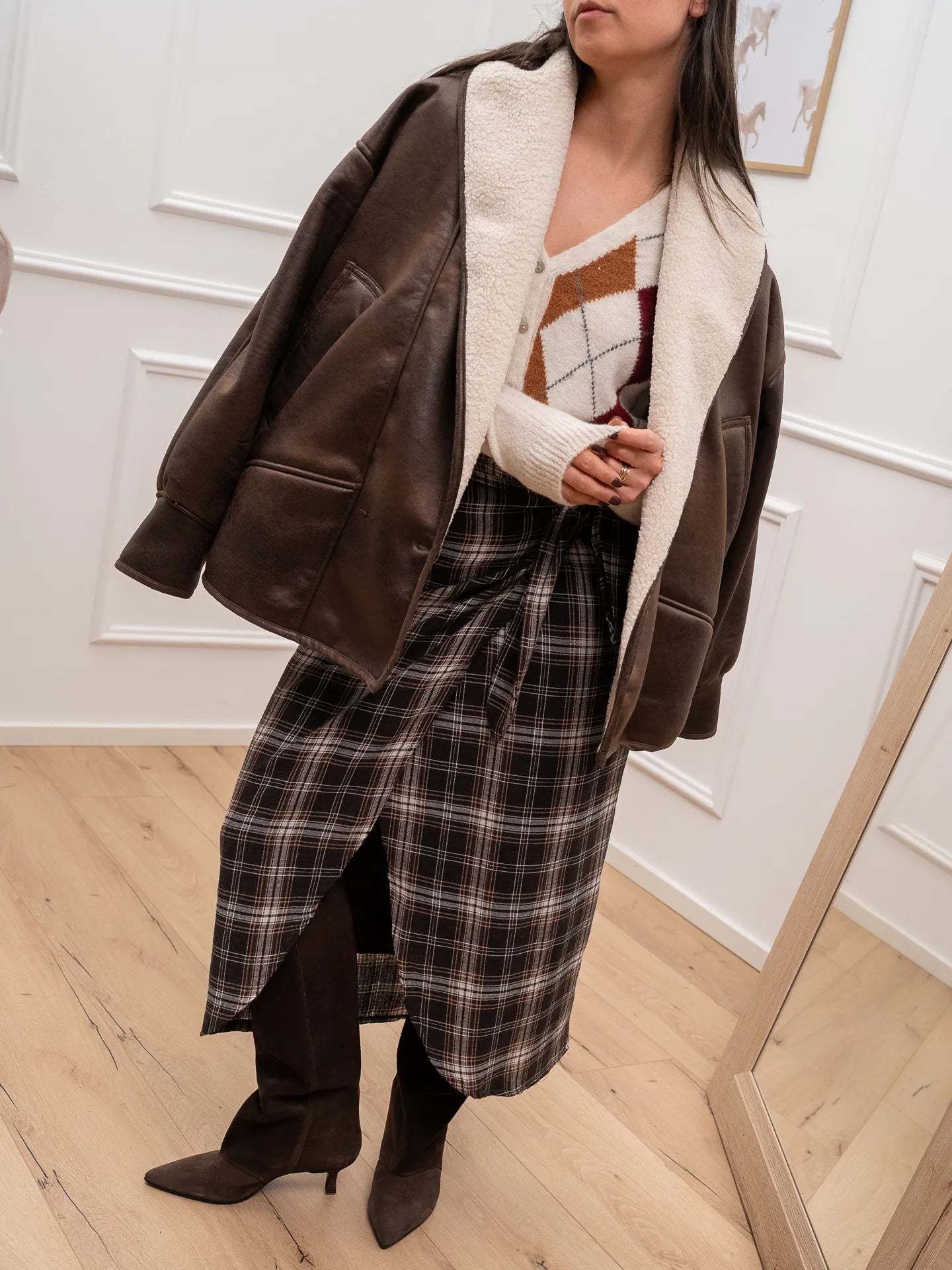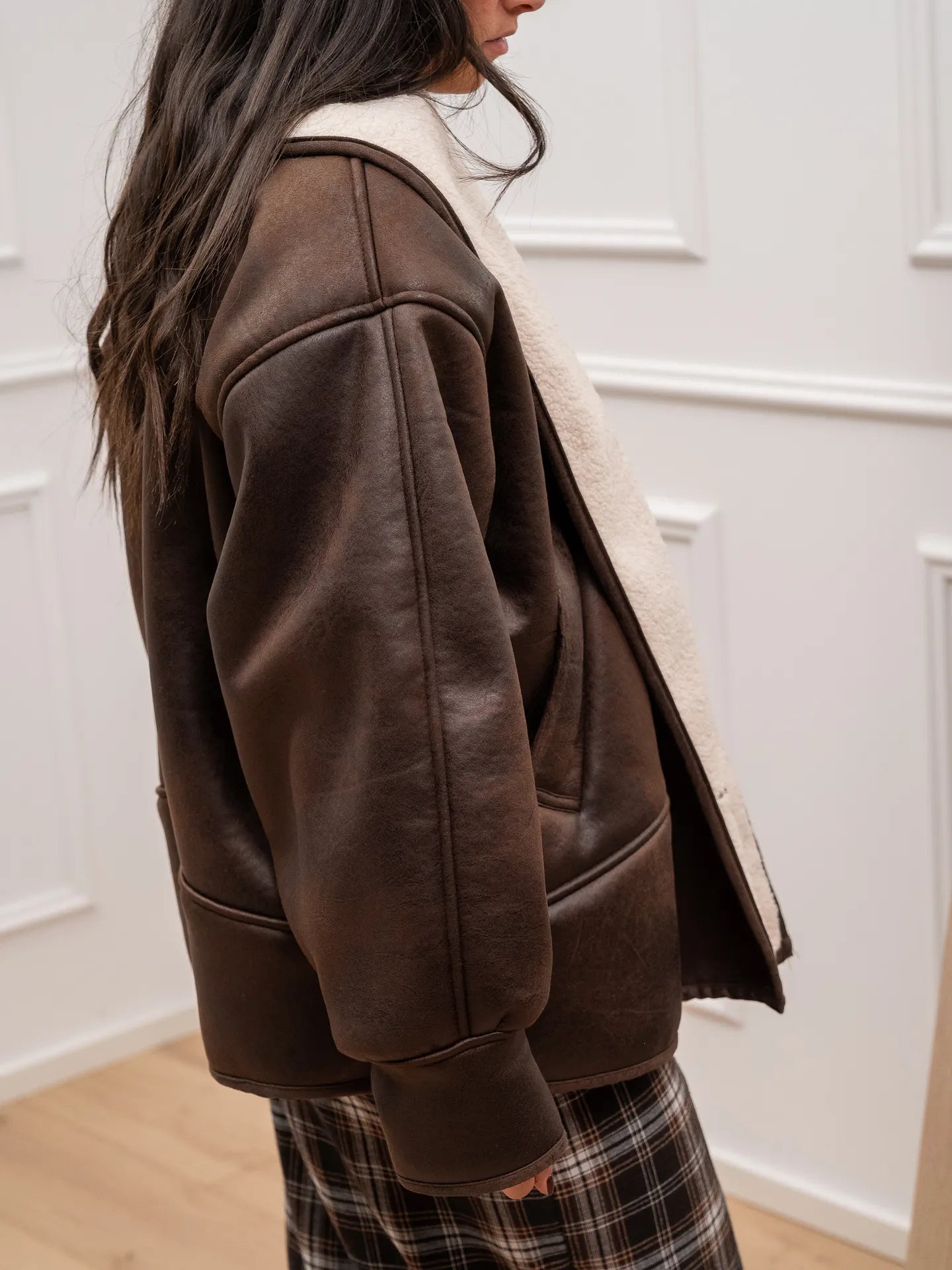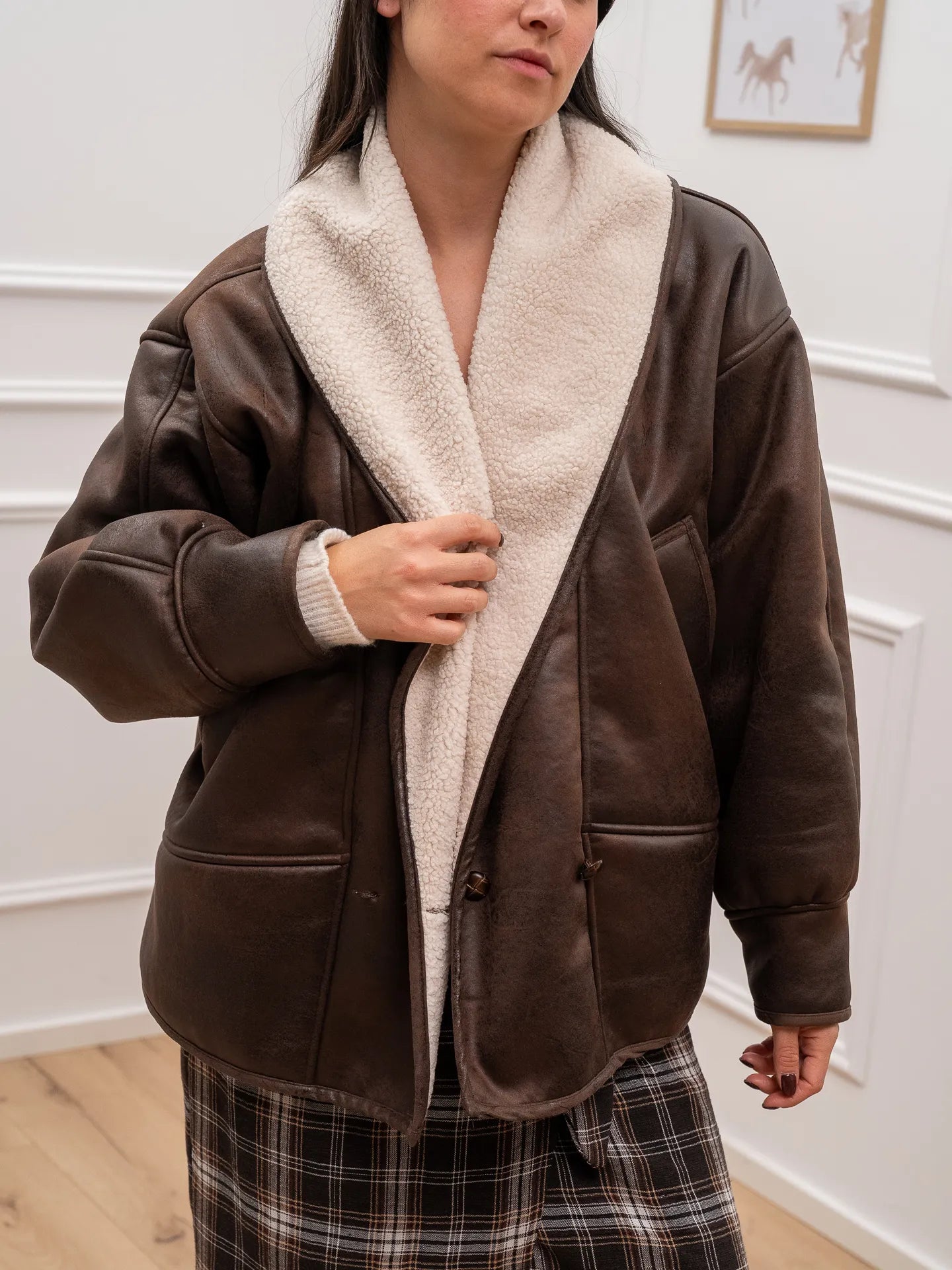 Montone color moka effetto invecchiato Haveone. Modello oversize con revers ampio e chiusura frontale. Interno shearling a contrasto burro.