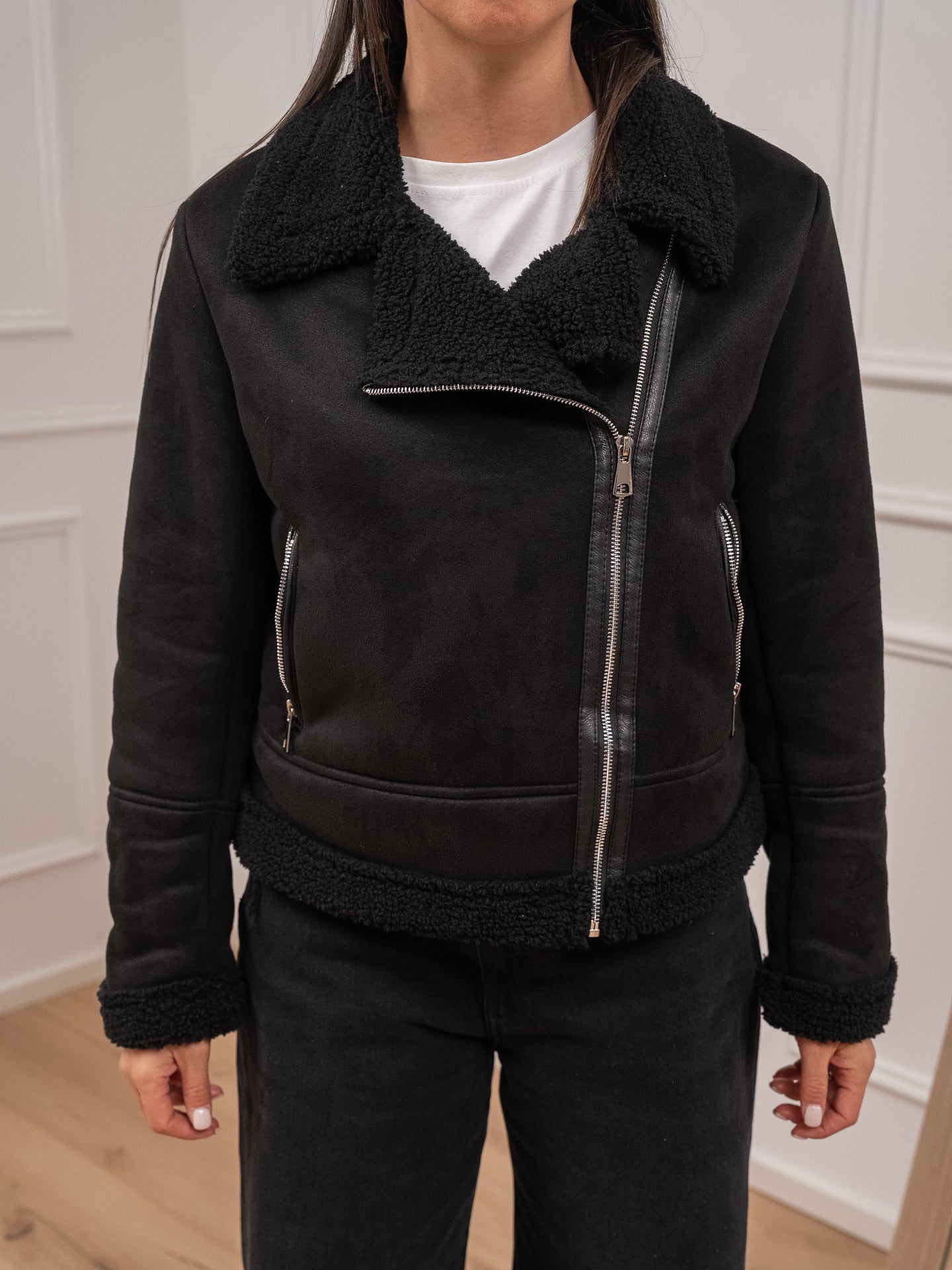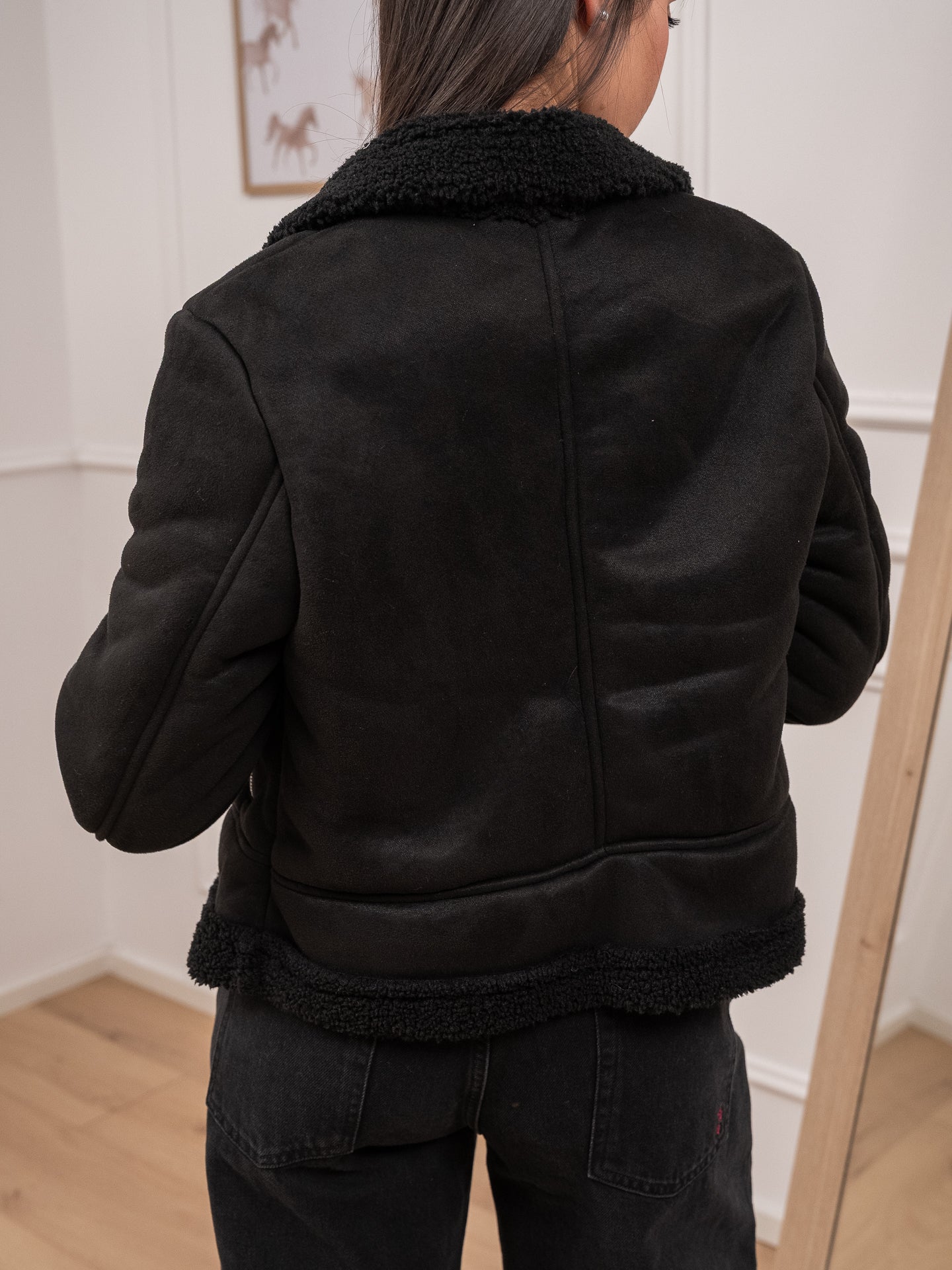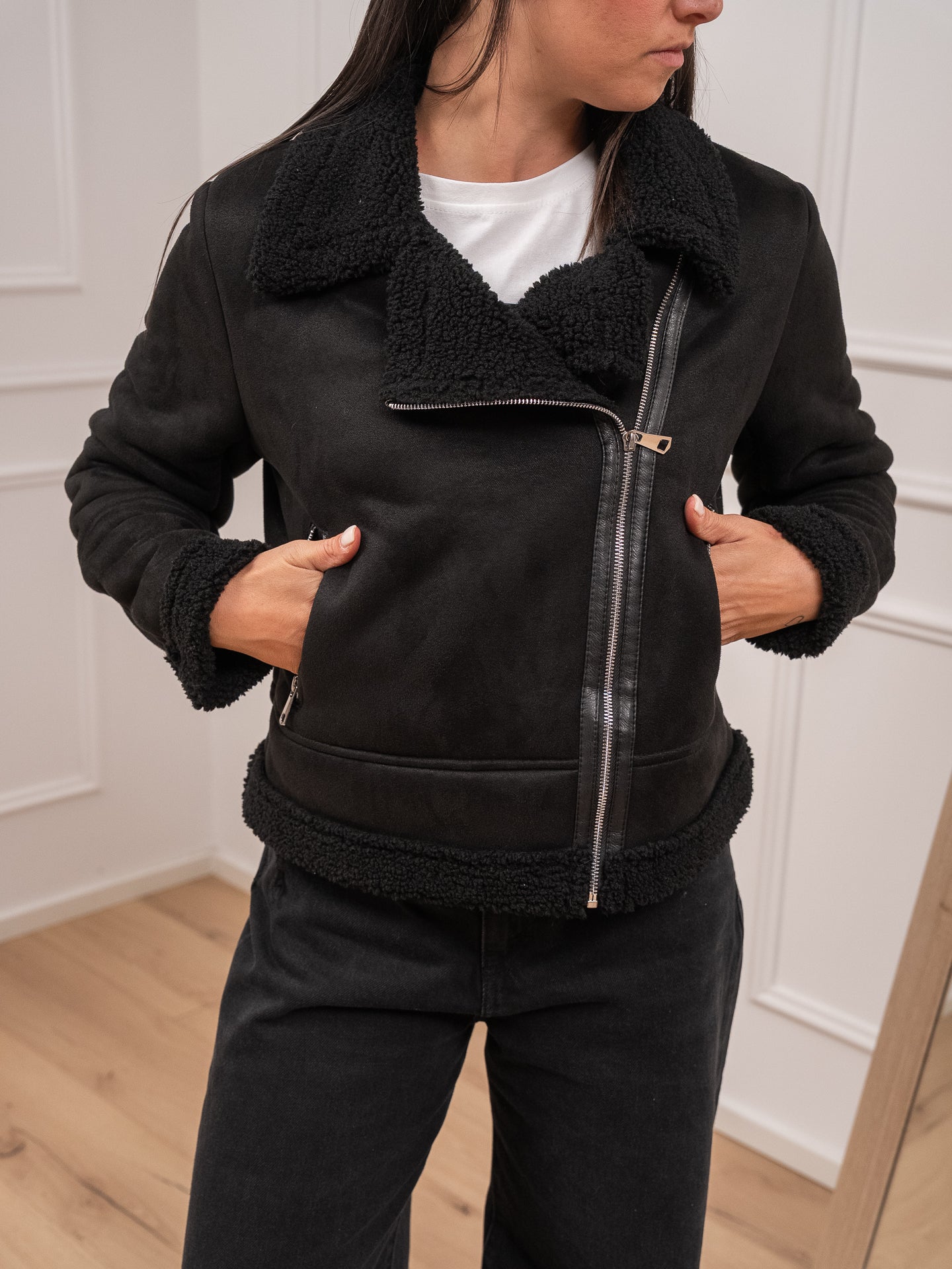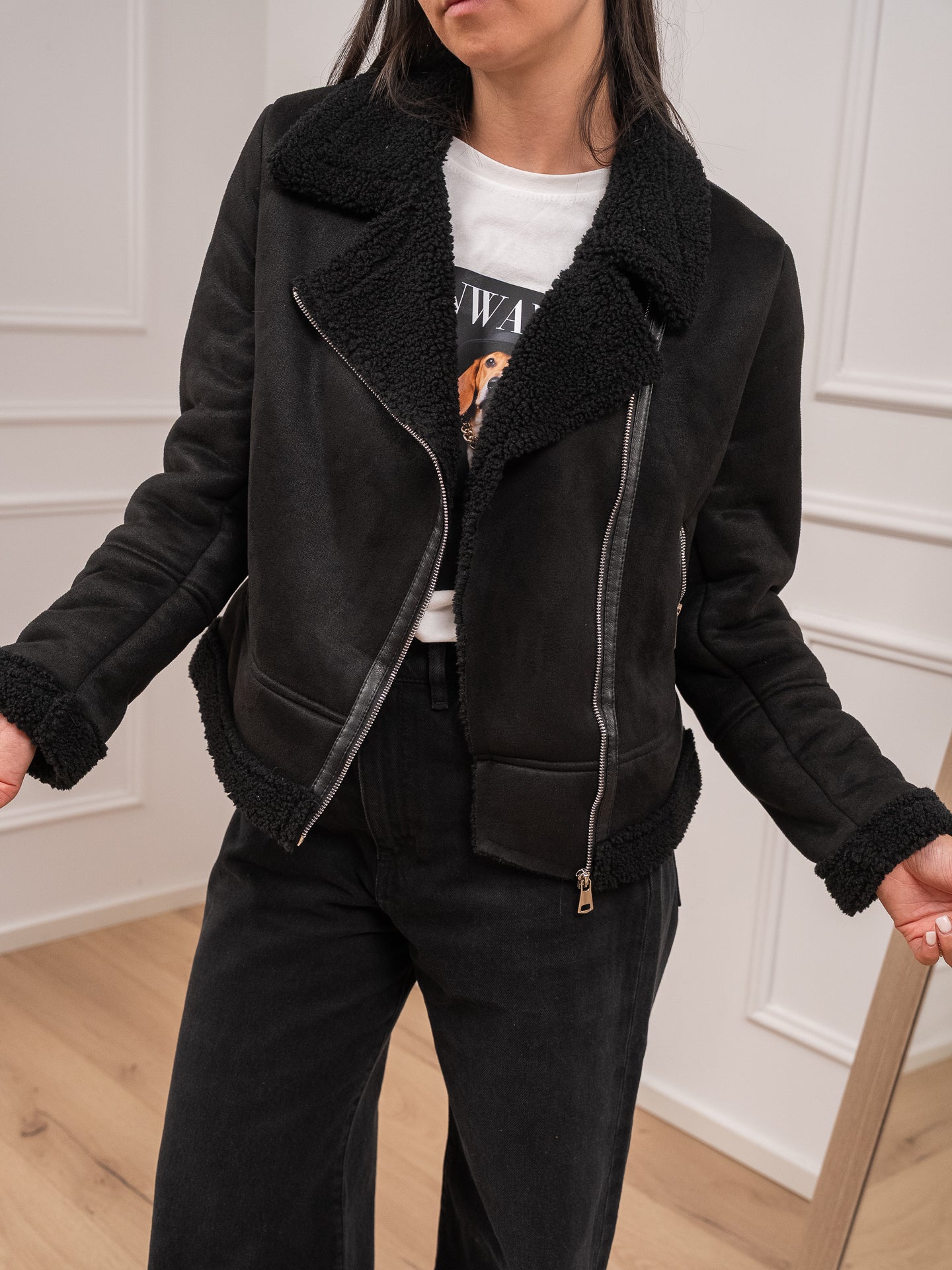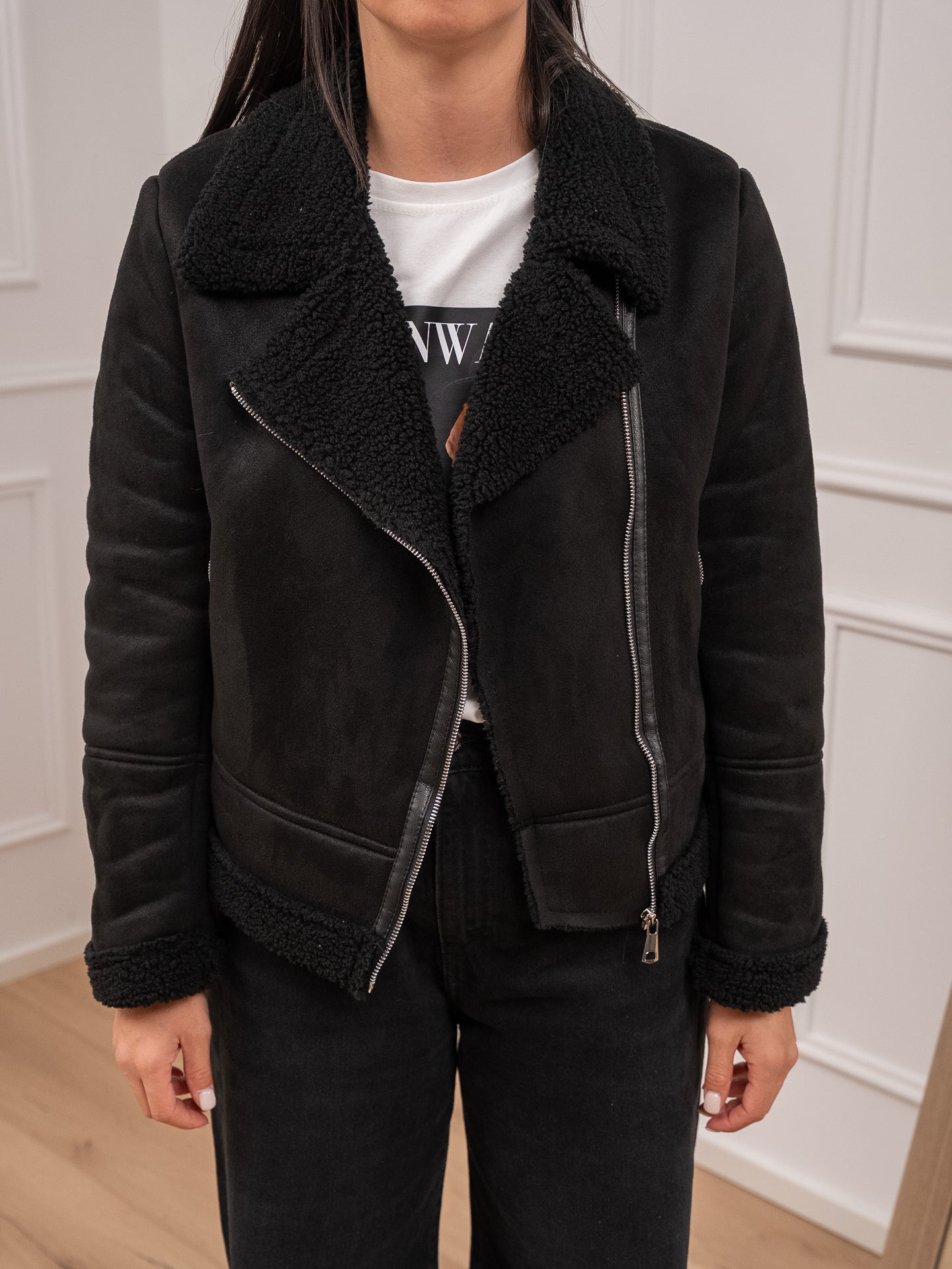 Montone scamosciato color nero HaveOne. Modello fit corto con collo revers e chiusura zip. Tasche frontali con zip. Dettaglio shearling.