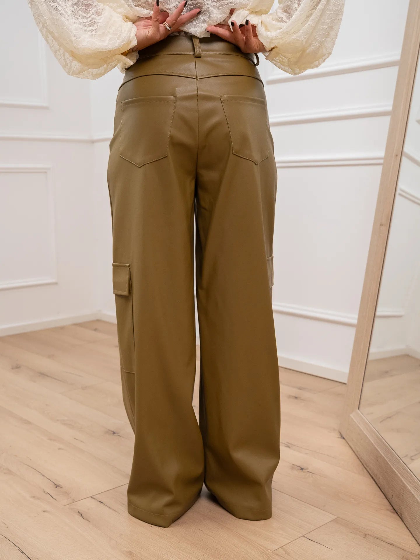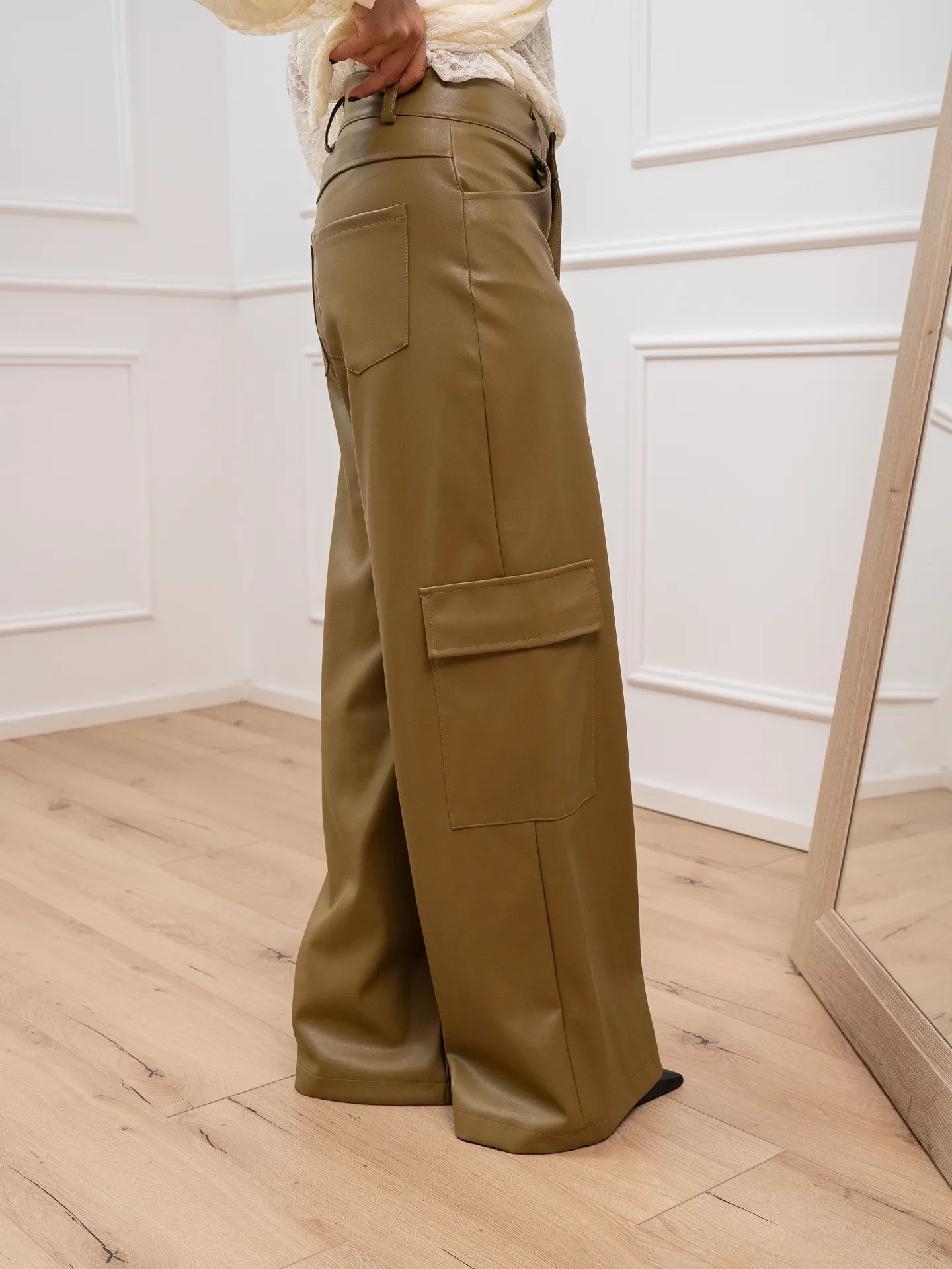 Pantaloni color olio in ecopelle HaveOne. Modello cargo wide leg fit gamba ampia, vita alta e dettaglio di maxi tastoni laterali. Chiusura con bottone e zip.