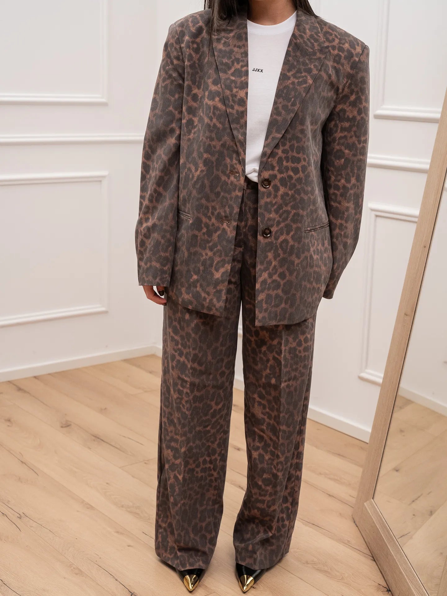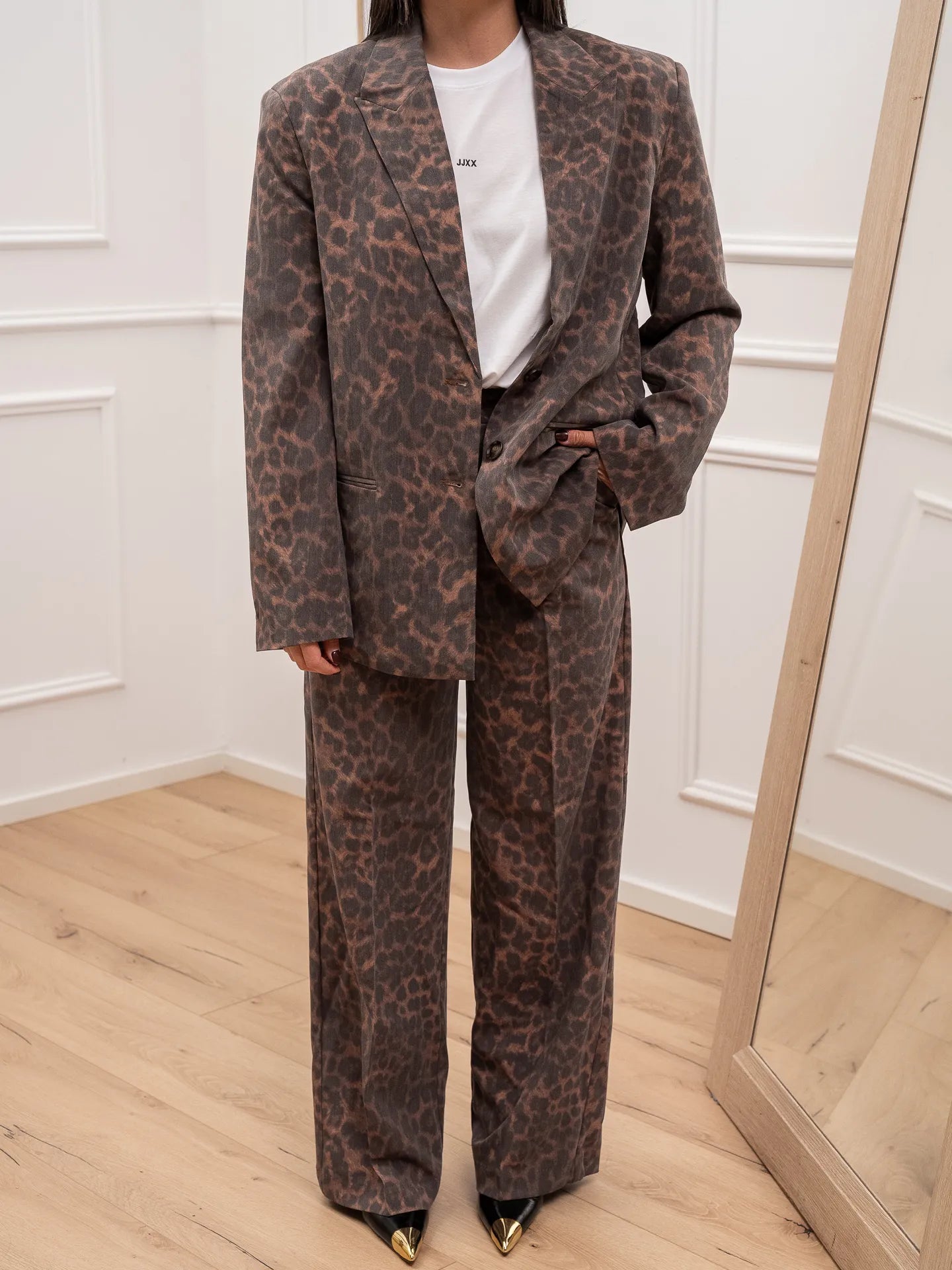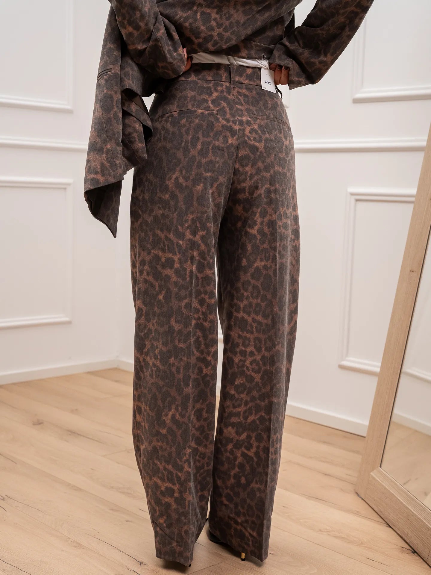 Pantalone sartoriale Ellis fantasia maku JJXX. Modello a palazzo gamba morbida con pinces frontali e vita alta. Chiusura gancio e zip.