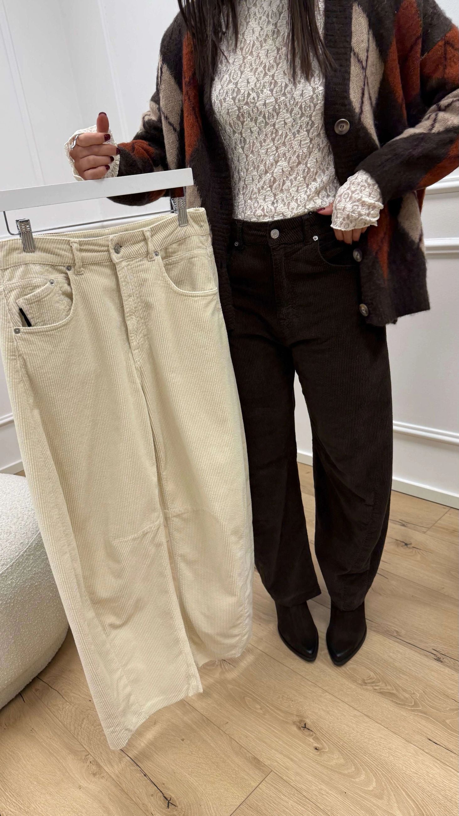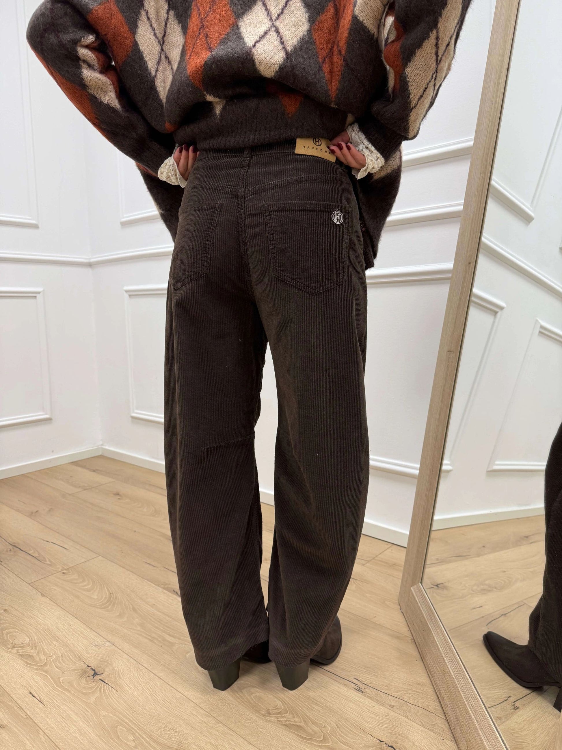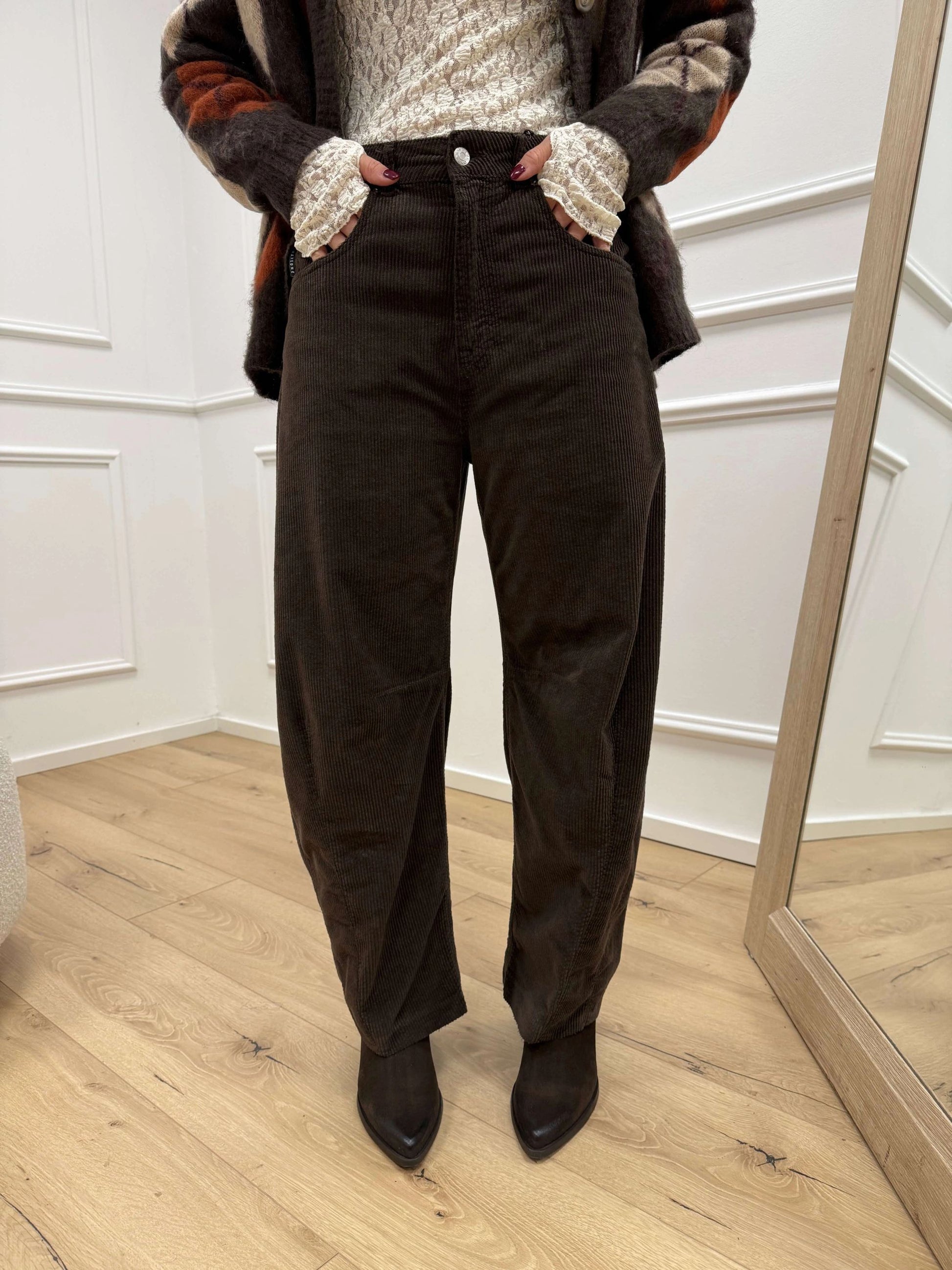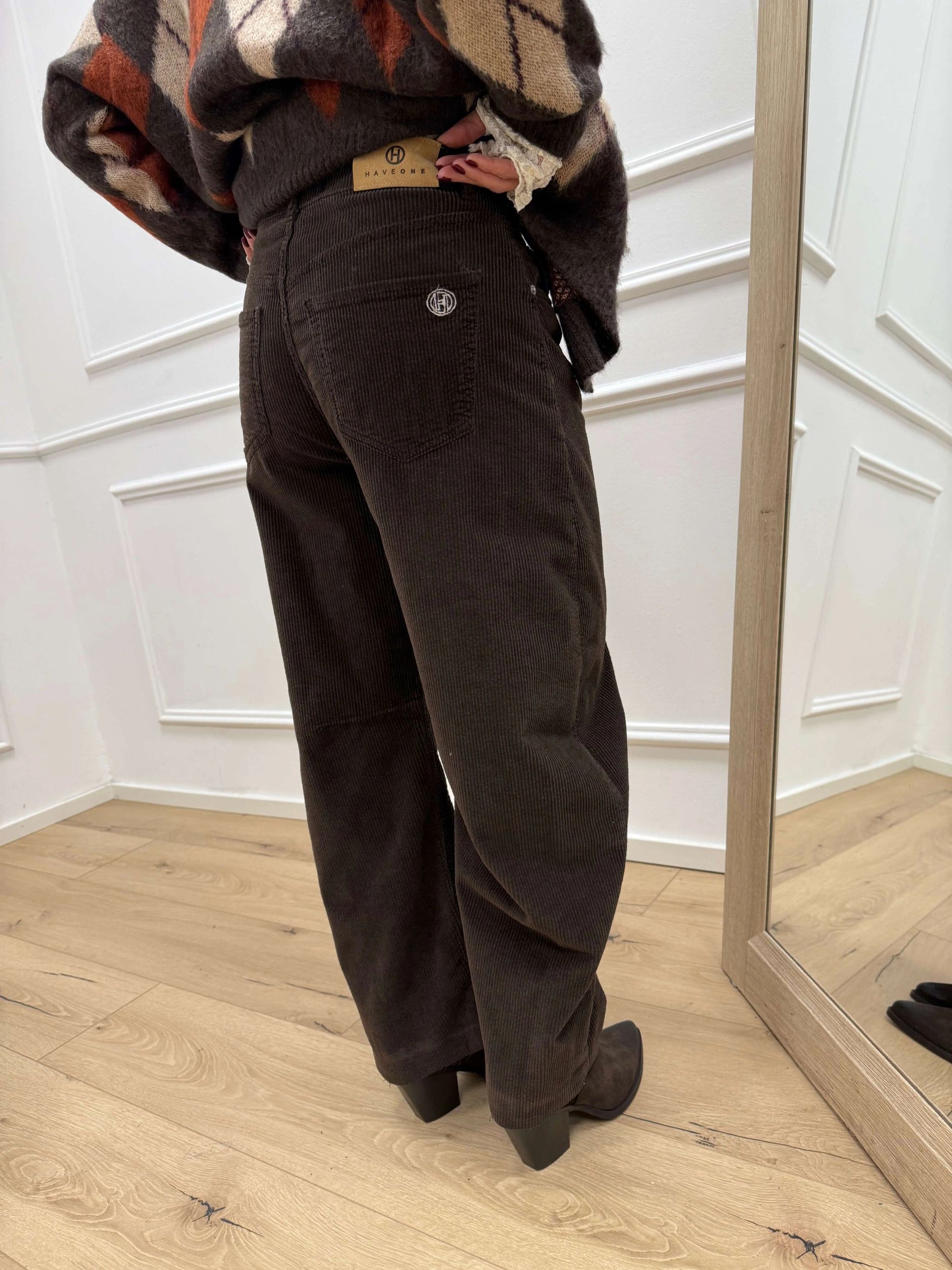 Jeans Barbara in velluto millerighe color moro HaveOne. Modello a ferro di cavallo con pinces sul ginocchio e taglio vivo sul fondo.