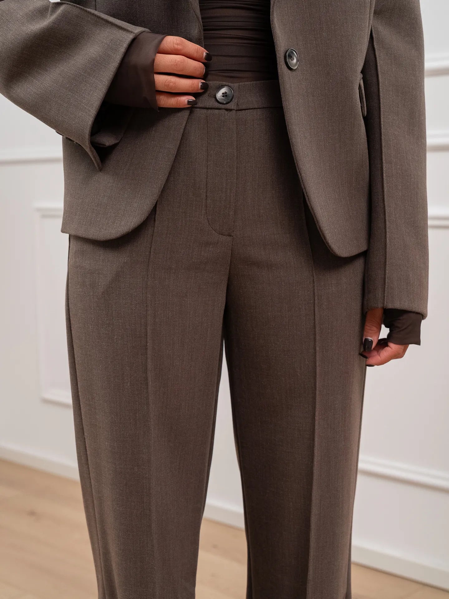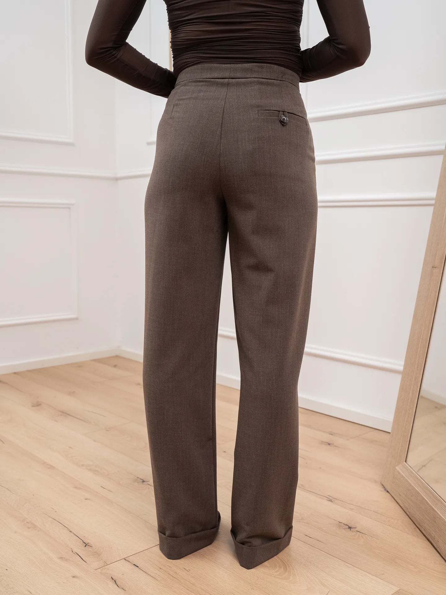 Pantaloni color fango mélange Vicolo. Modello fit dritto a vita alta, dettaglio di cucitura frontale in rilievo e risvolto sul fondo. Chiusura con doppio bottone e zip. Tasche laterali e tasca singola a filetto sul retro.