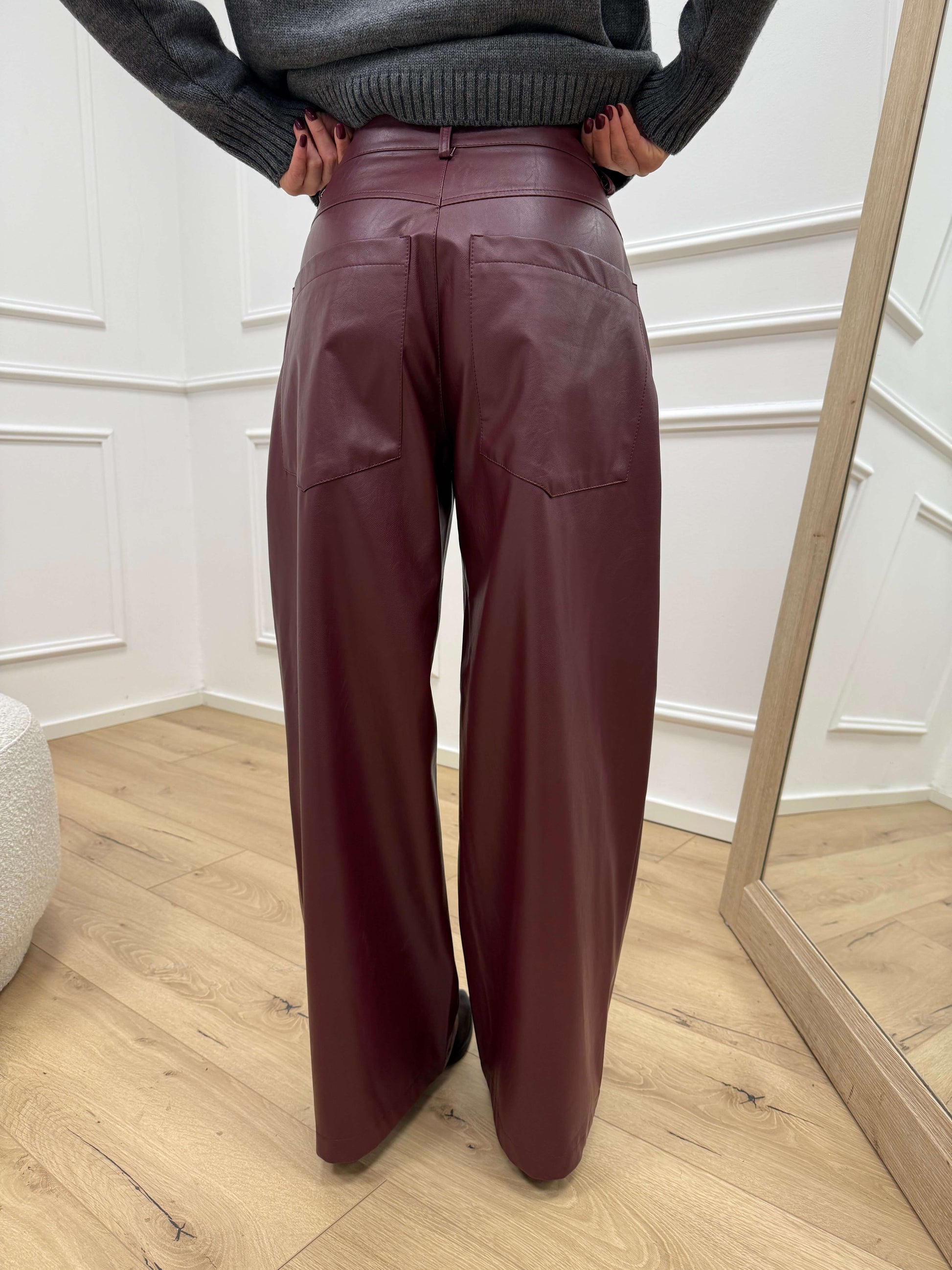 Pantaloni Giusy color bordeaux in ecopelle martellata Tensione In. Modello fit over gamba ampia con dettaglio di maxi tasche sul retro. Vita alta con chiusura bottone e zip.