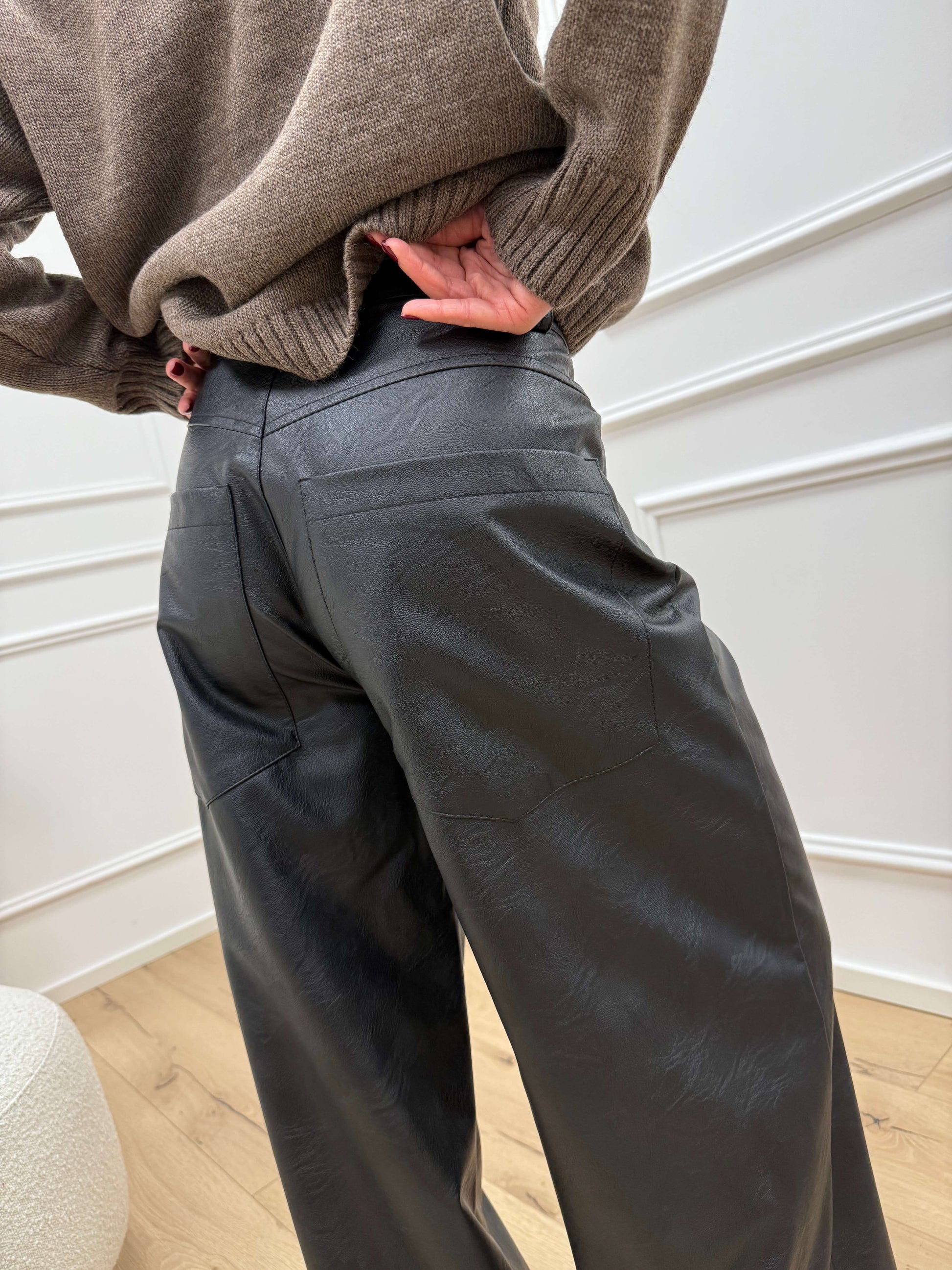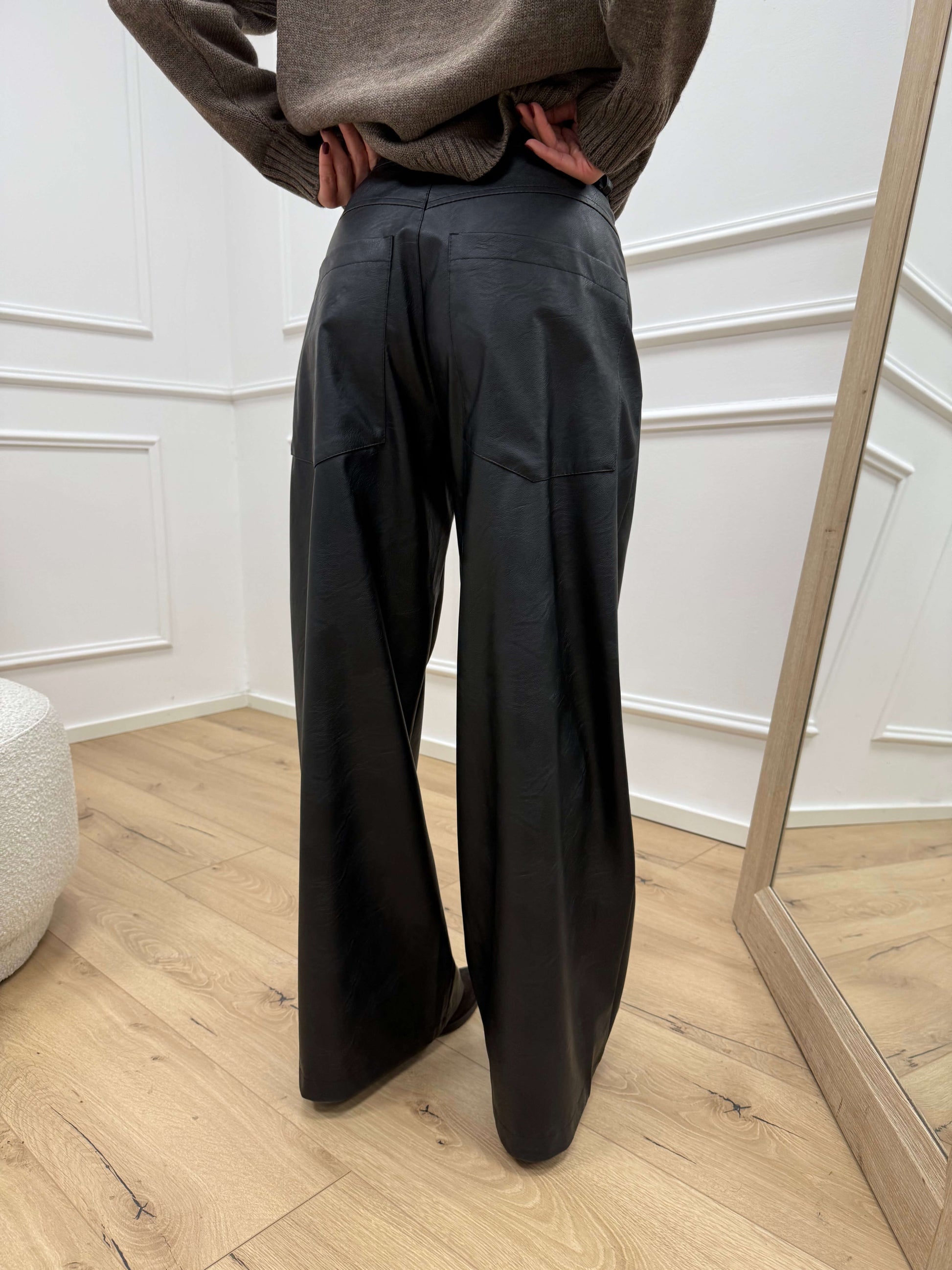 Pantaloni Giusy color nero in ecopelle martellata Tensione In. Modello fit over gamba ampia con dettaglio di maxi tasche sul retro. Vita alta con chiusura bottone e zip.