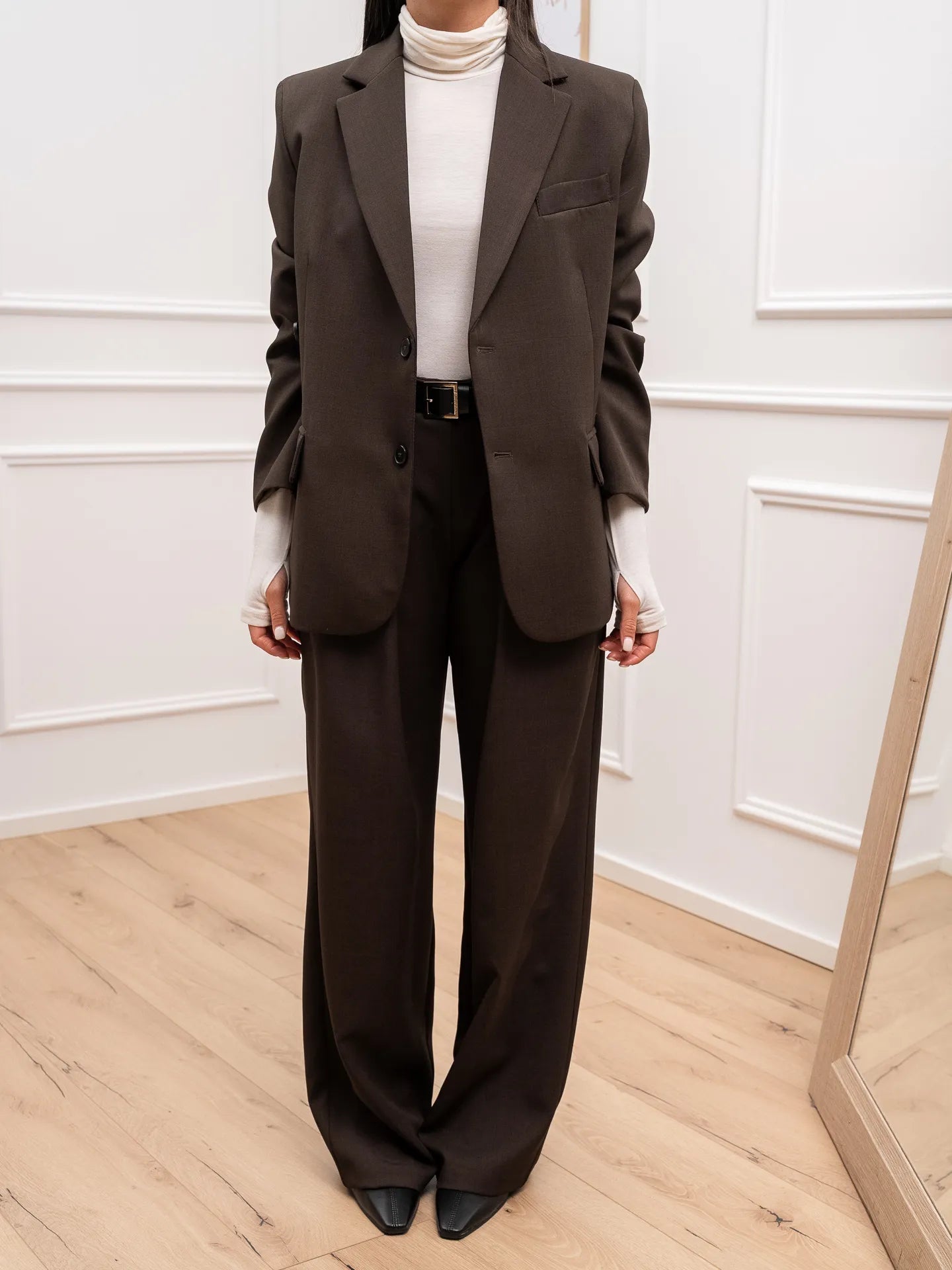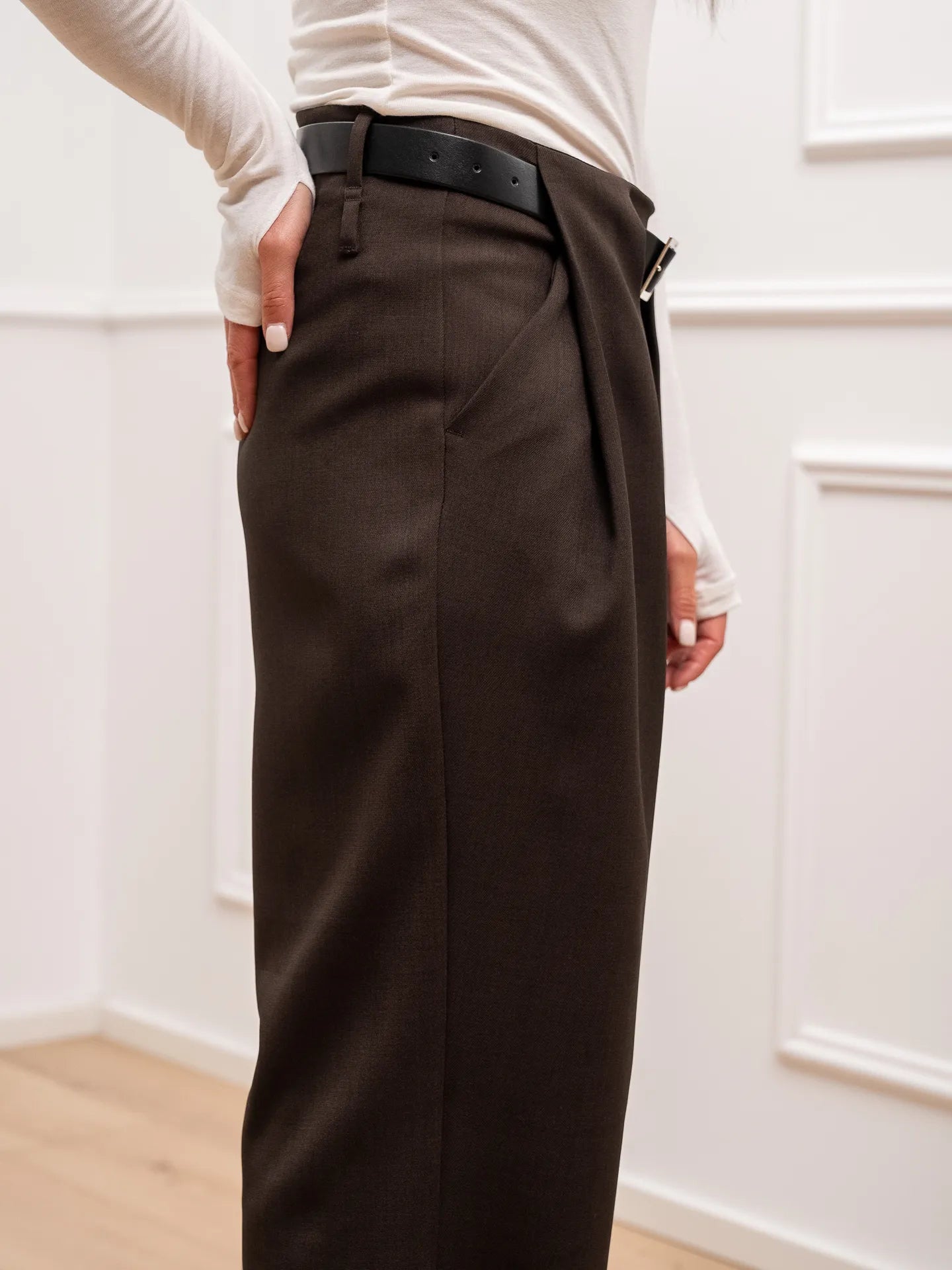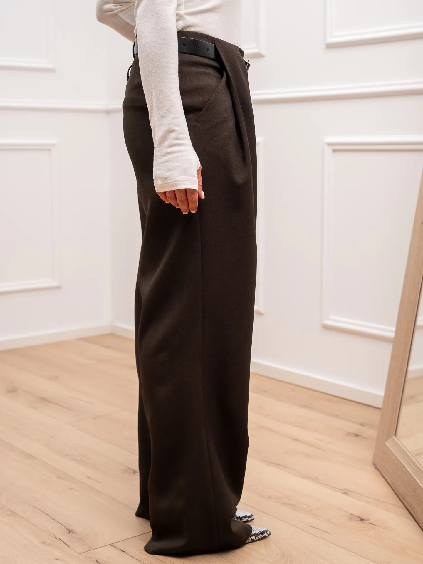 Pantaloni Ludo color castagna tessuto fiammato Vicolo. Modello a palazzo fit gamba ampia, vita alta e chiusura con zip laterale. Dettaglio di cintura logata in vita.