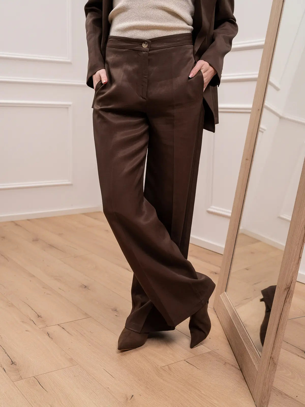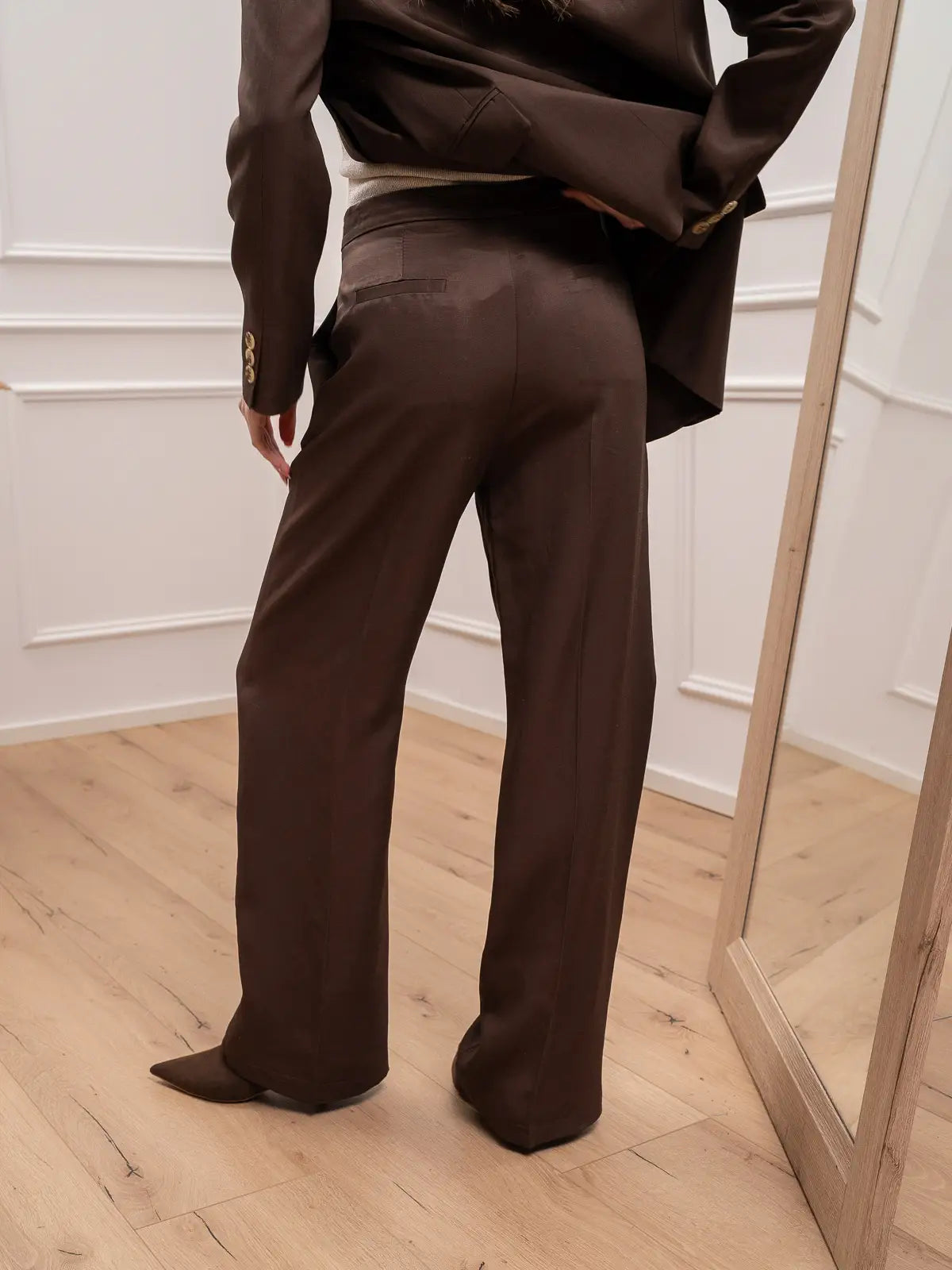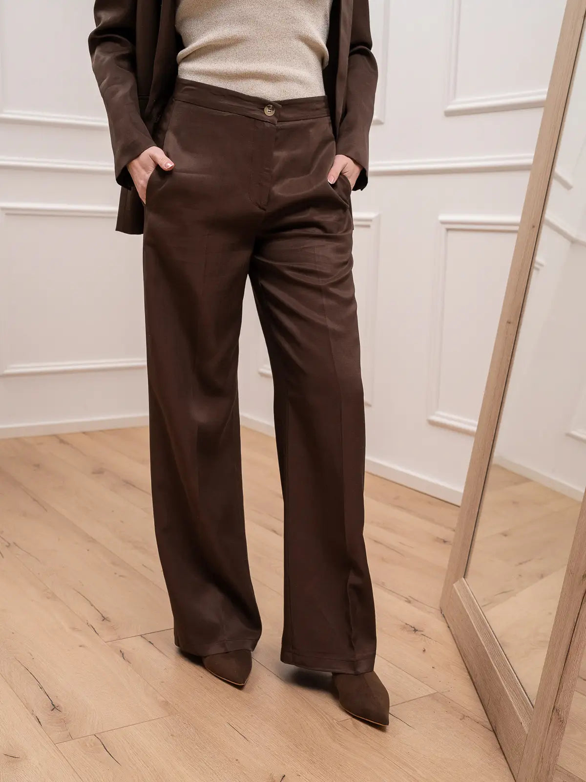 Pantaloni color moka in misto lino Vicolo. Modello a gamba dritta con vita alta. Chiusura con zip e bottone. Tasche laterali.