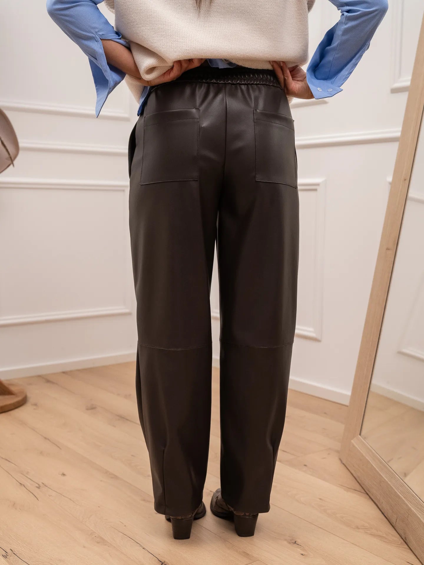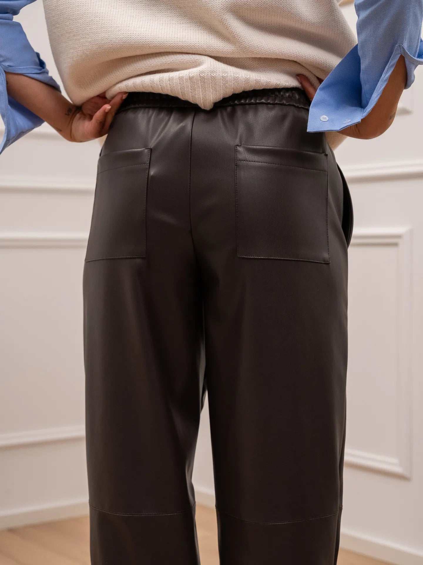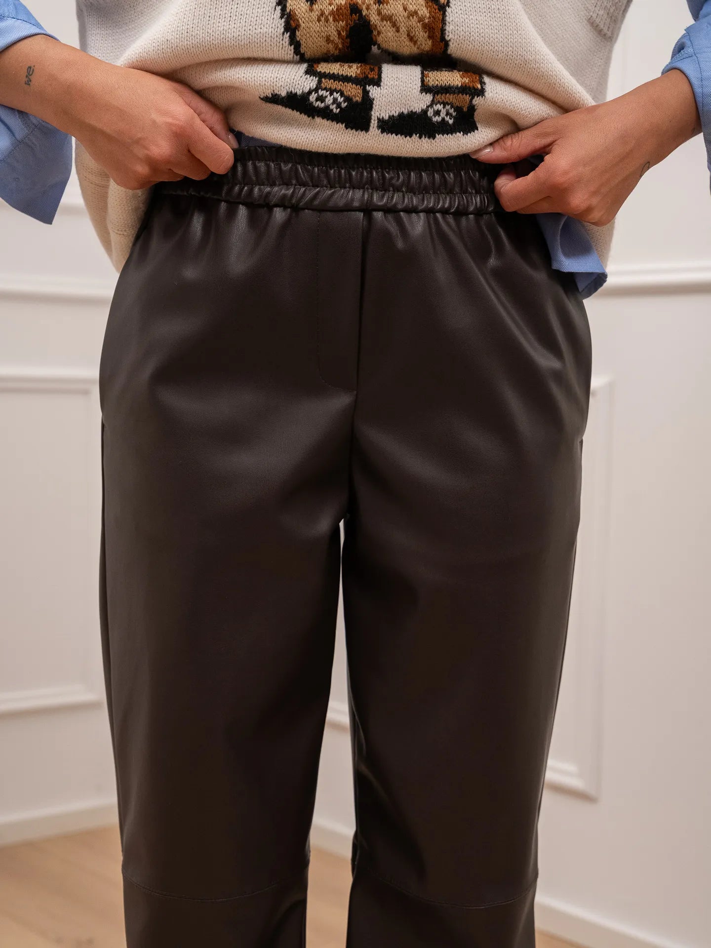 Pantaloni color moro in ecopelle Vicolo. Modello carrot fit a vita alta arricciata elasticizzata. Impunture in rilievo. Tasche sul retro.