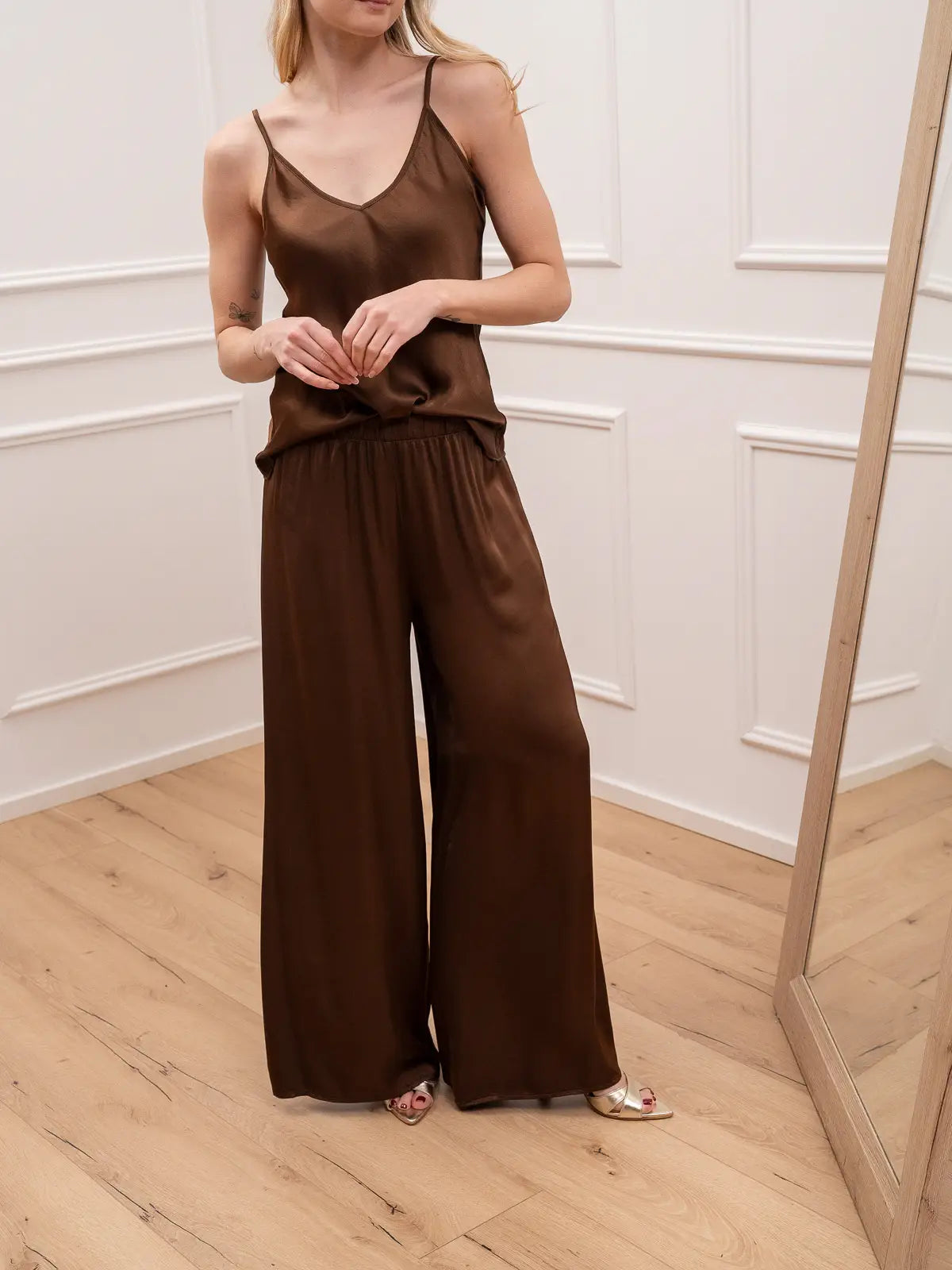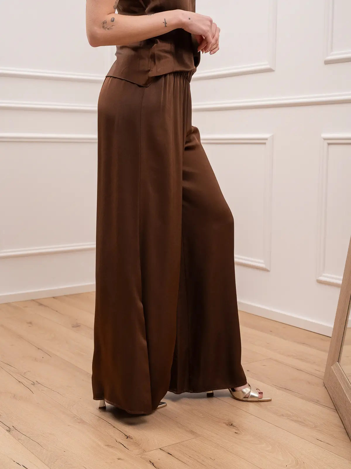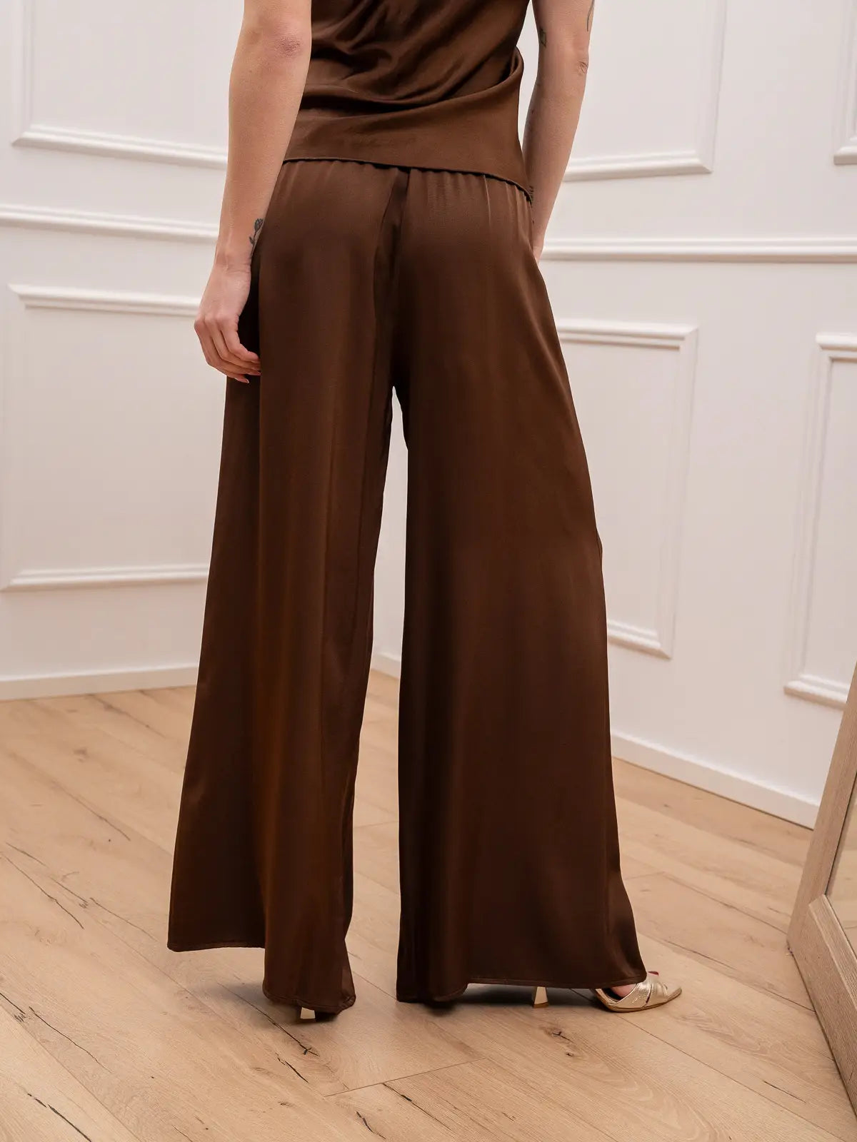 Pantaloni color moro in raso HaveOne. Modello a palazzo gamba morbida con vita alta elasticizzata.