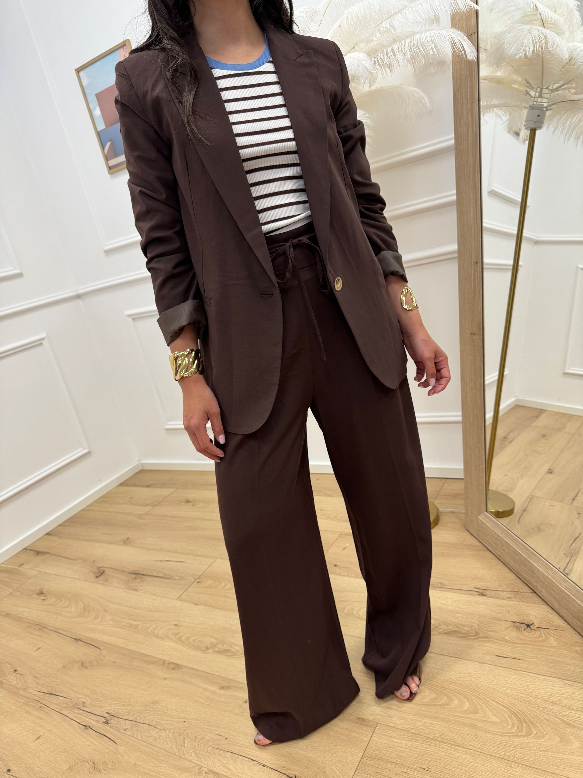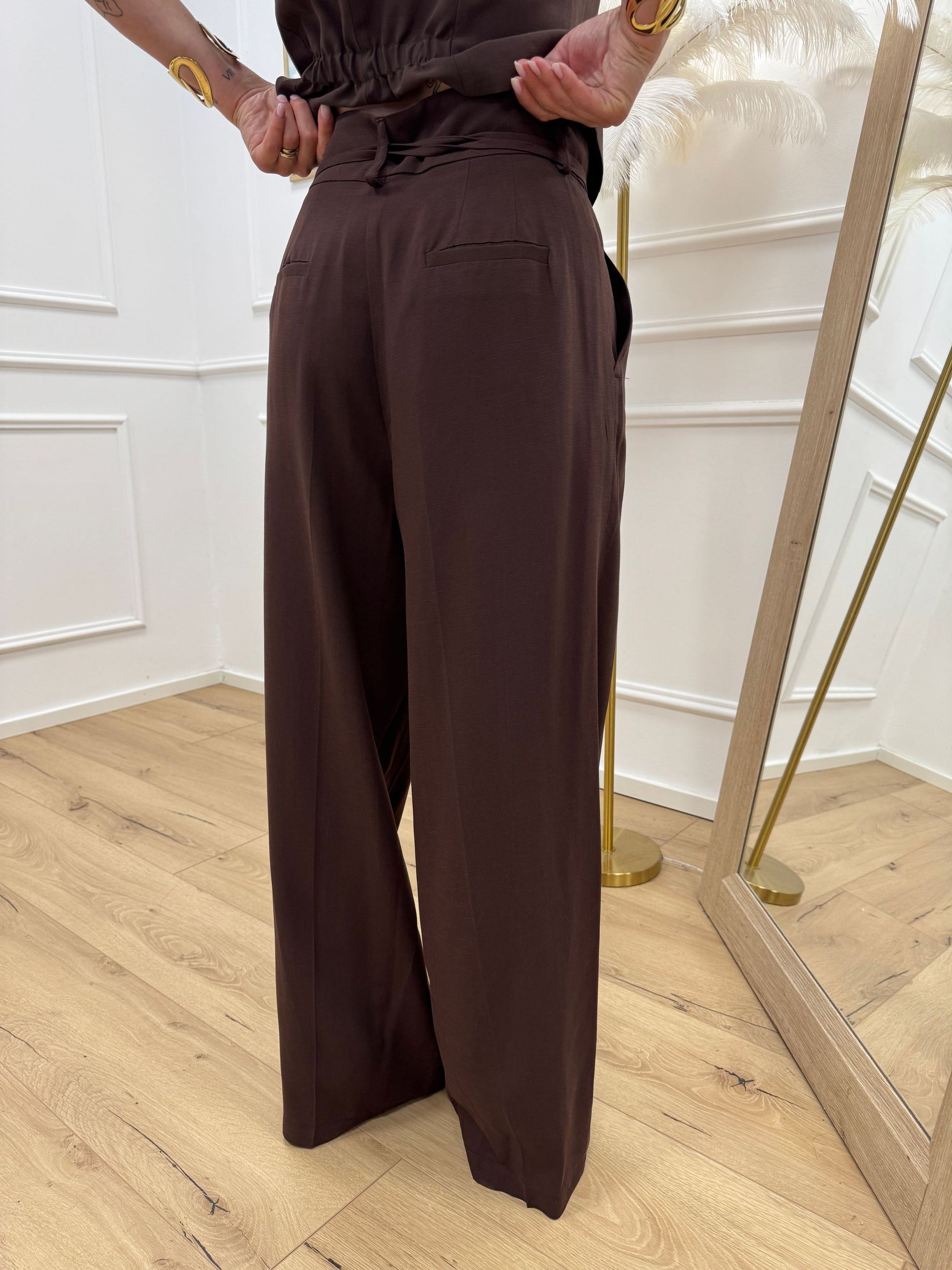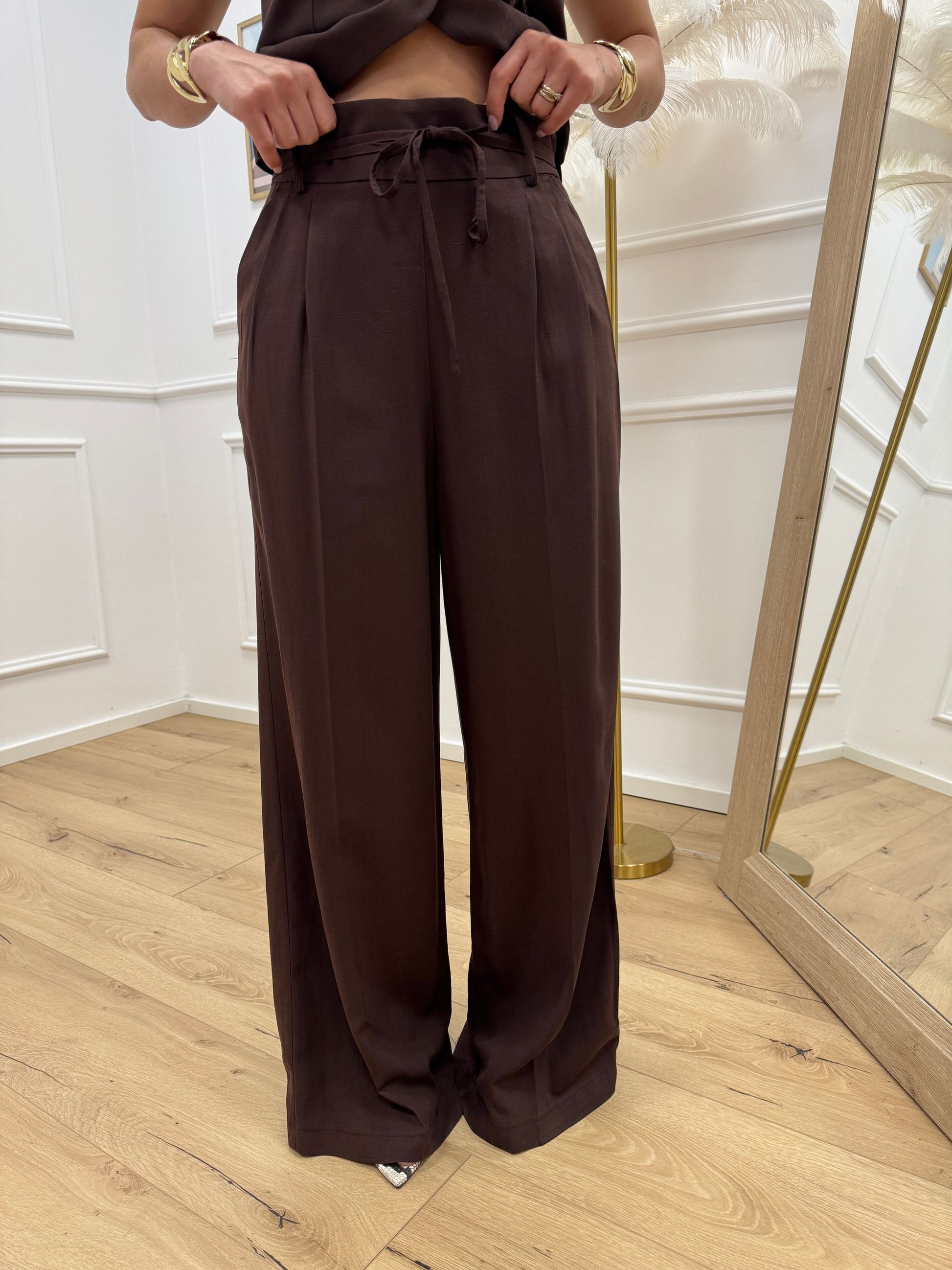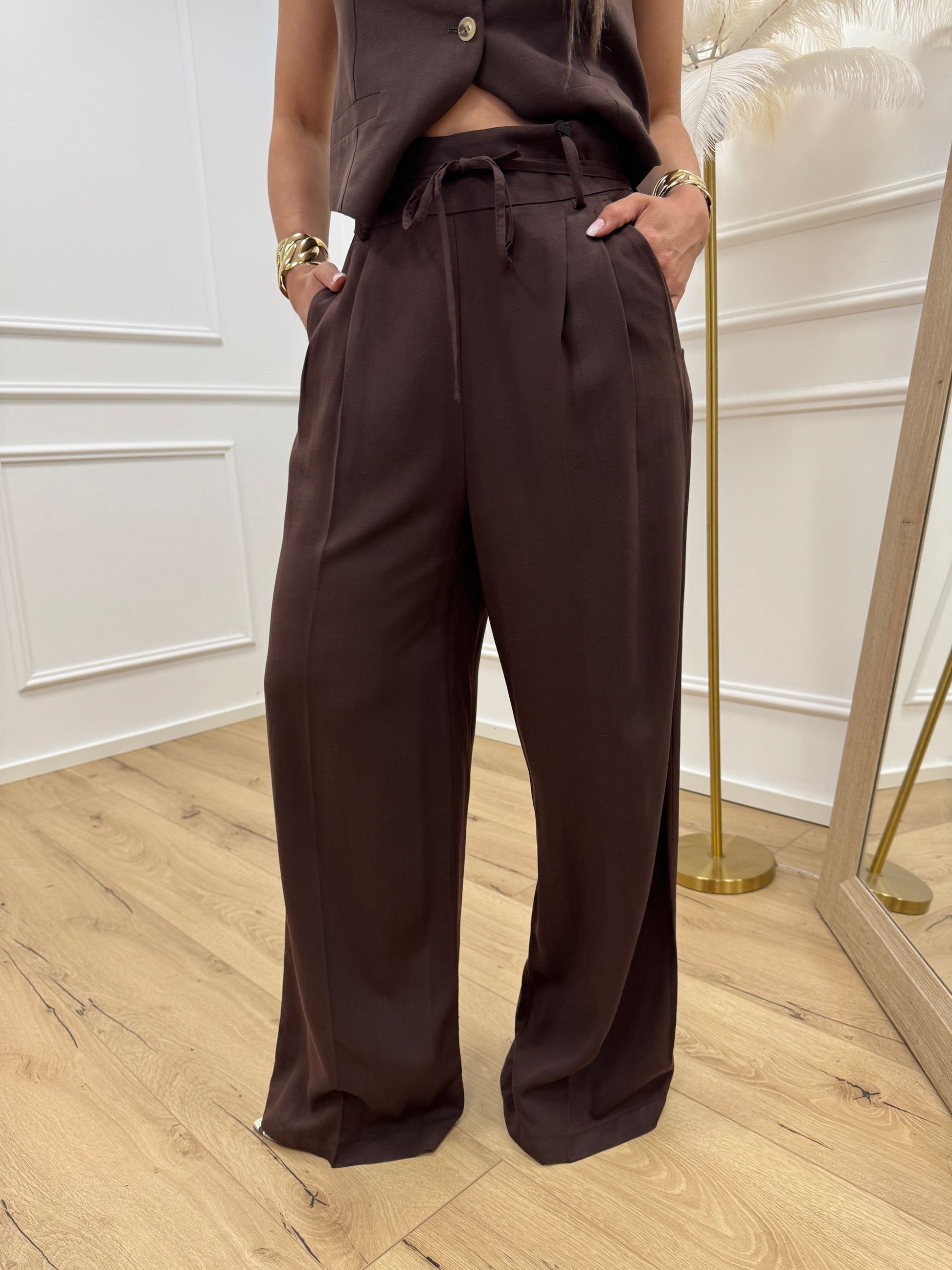Pantaloni color moro misto lino e viscosa Vicolo. Modello con coulisse in vita alta con passanti e laccio lungo. Tasche alla francese laterali. Chiusura laterale con zip invisibile. Tasche posteriori a filetto.