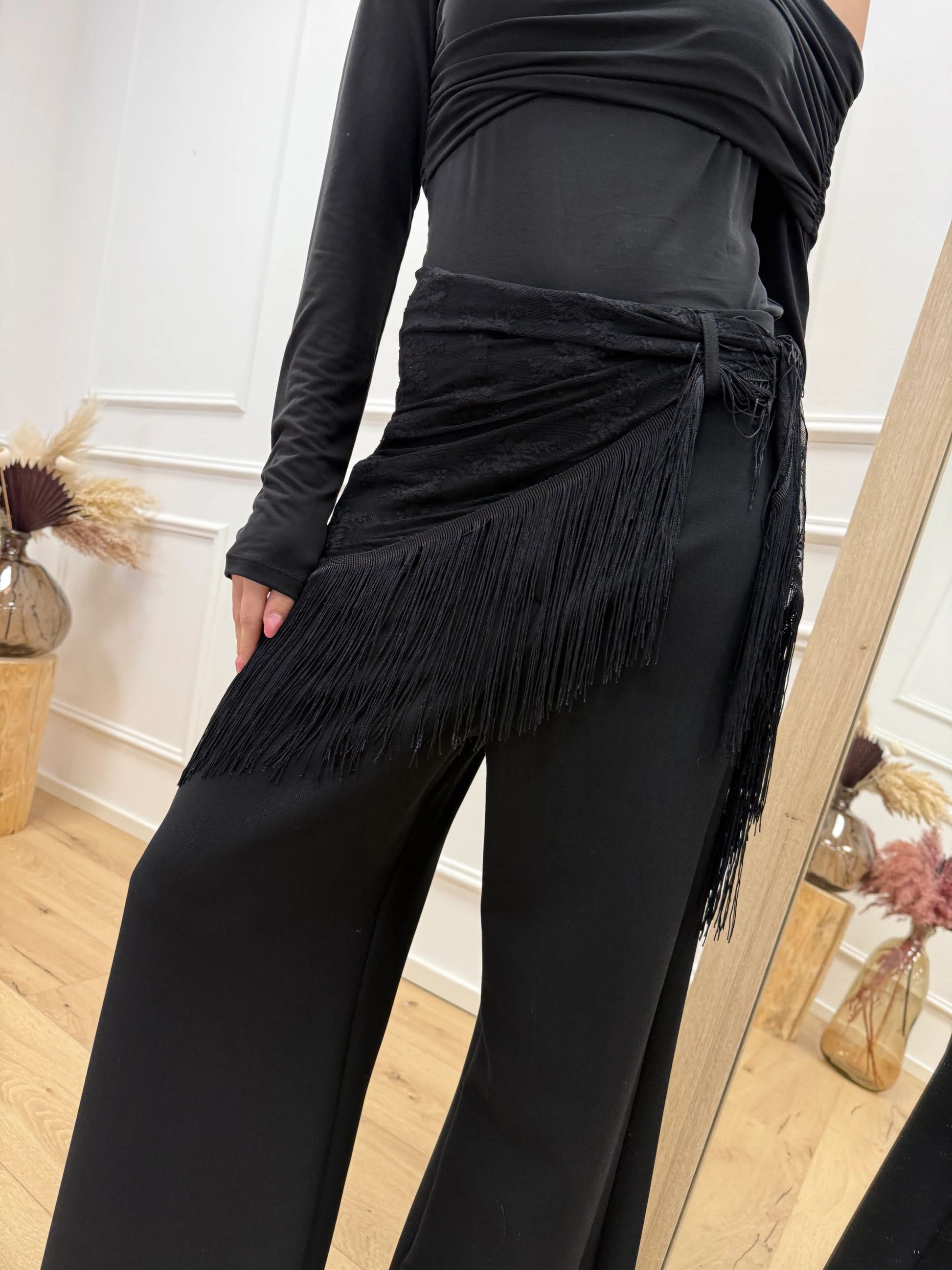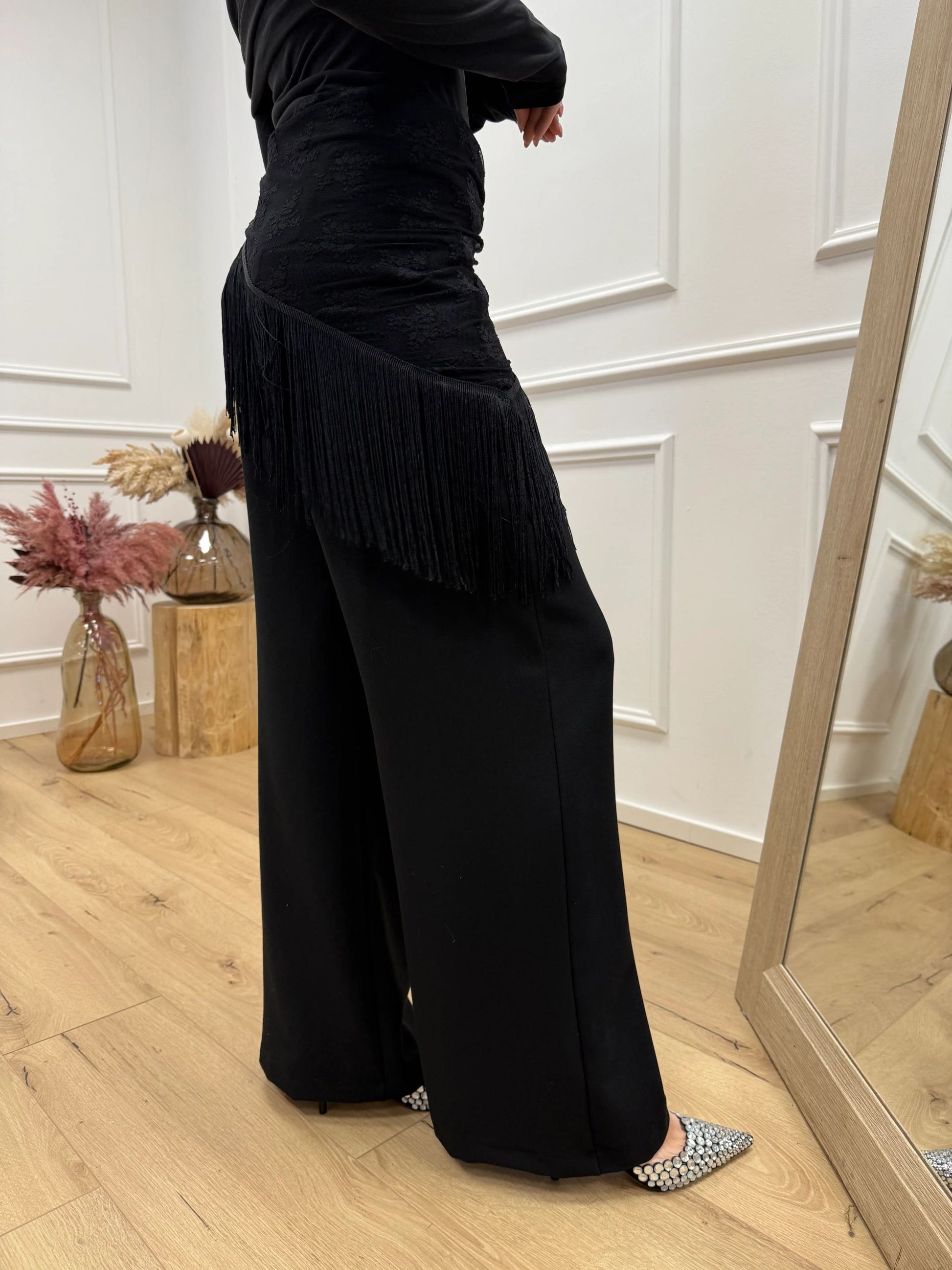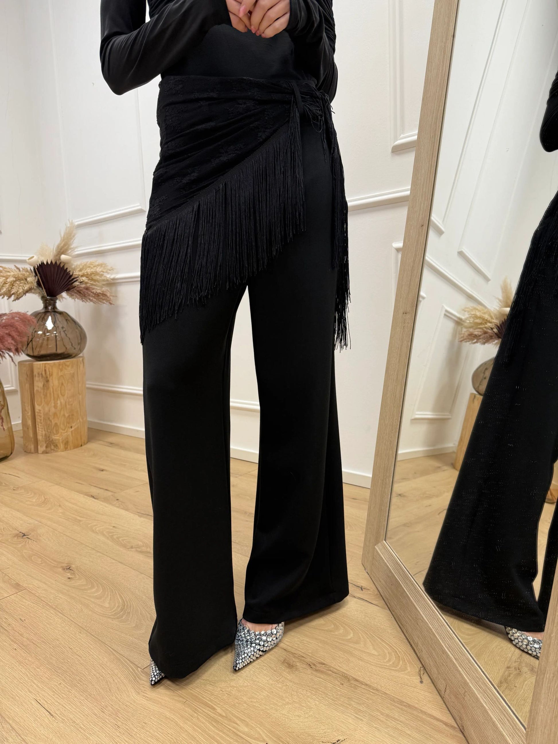 Pantaloni color nero HaveOne. Modello fit a palazzo con vita alta, chiusura bottone e zip. Dettaglio di bandana in tulle nera con frange.
