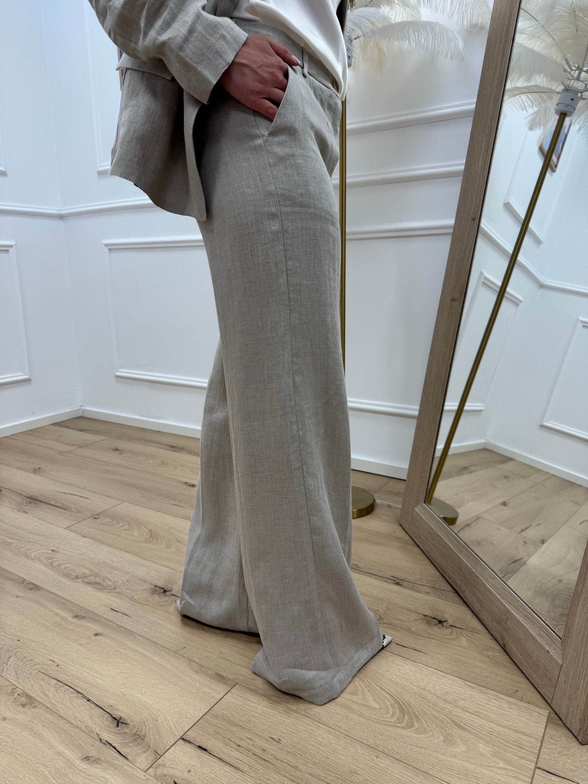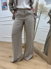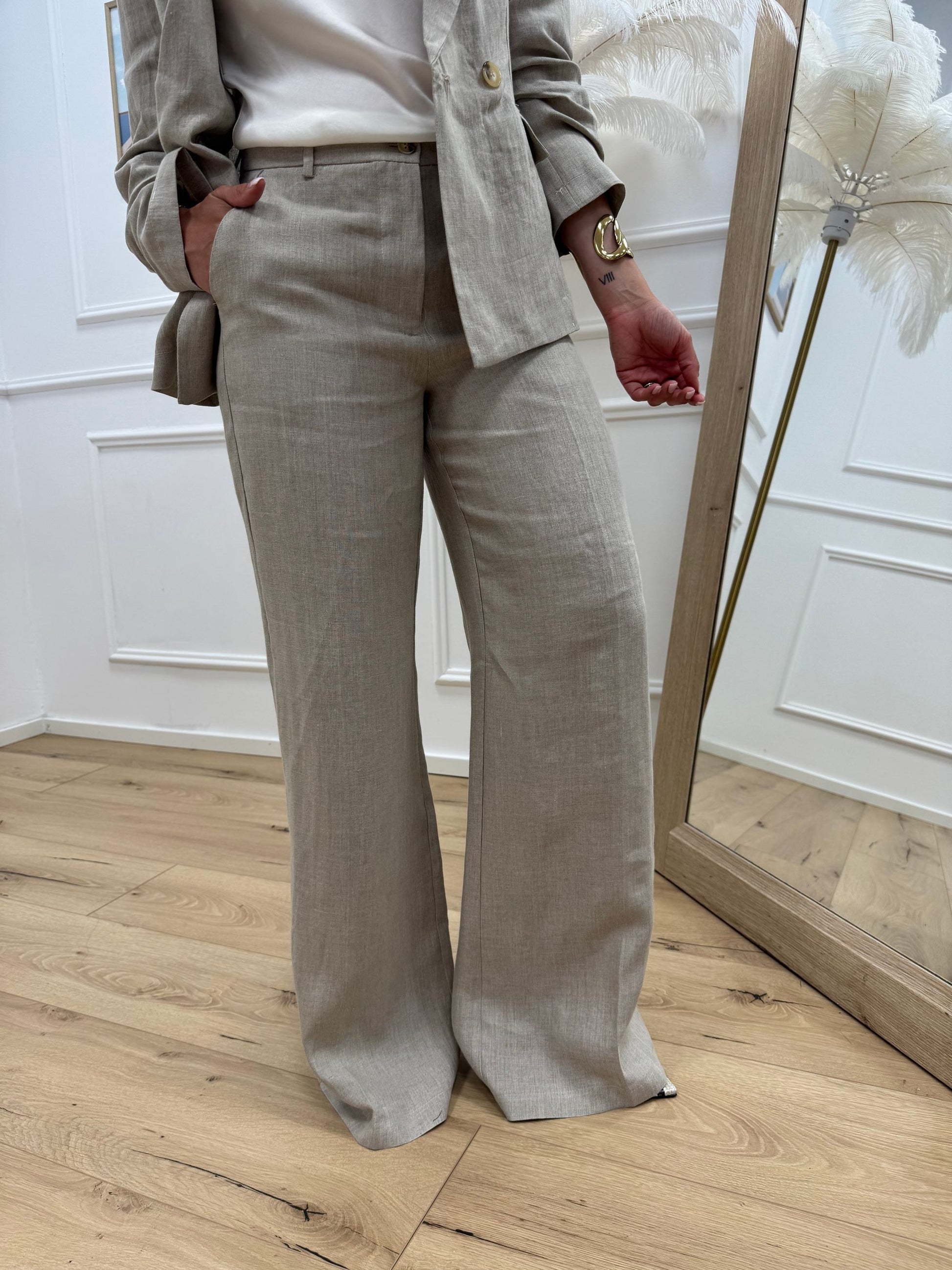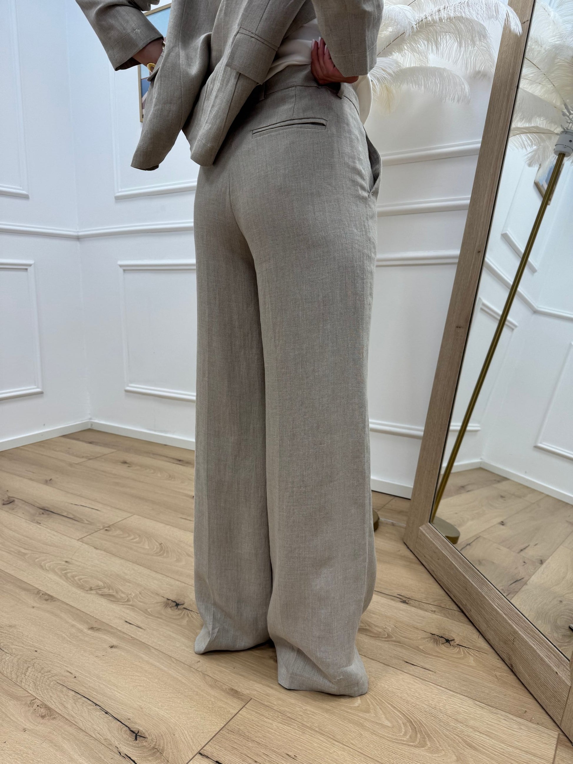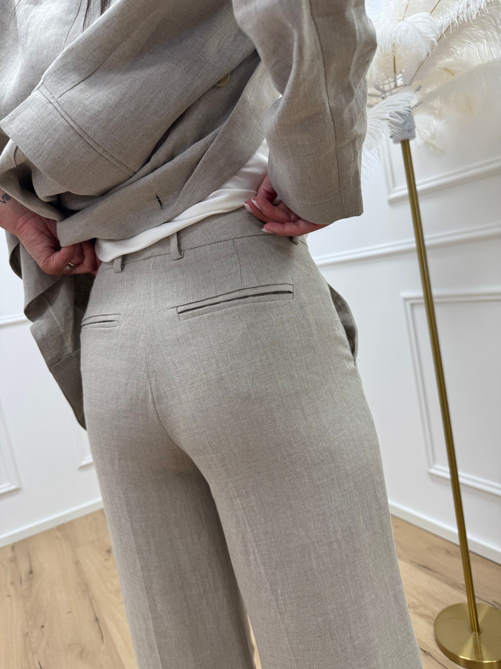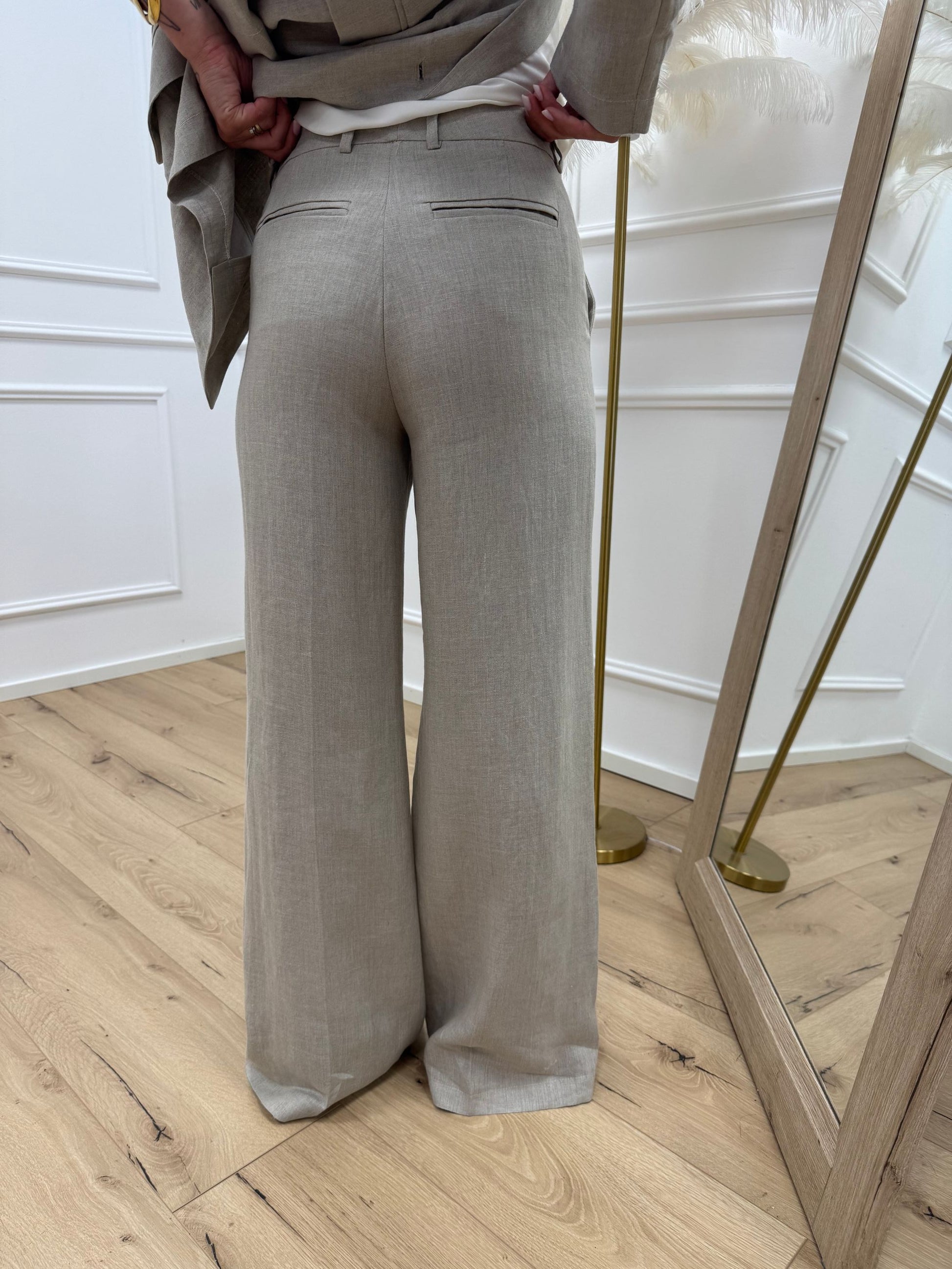 Pantaloni color pietra 100% lino Vicolo. Modello a palazzo con gamba ampia, vita alta. Chiusura con bottone e zip, tasche laterali e tasche a filetto sul retro.