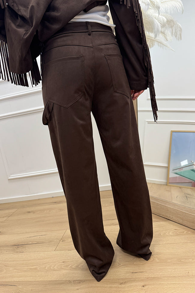 Pantaloni scamosciati color moro Tensione In. Modello dritto con vita alta, chiusura zip e bottone. Dettaglio di bandana rosa.