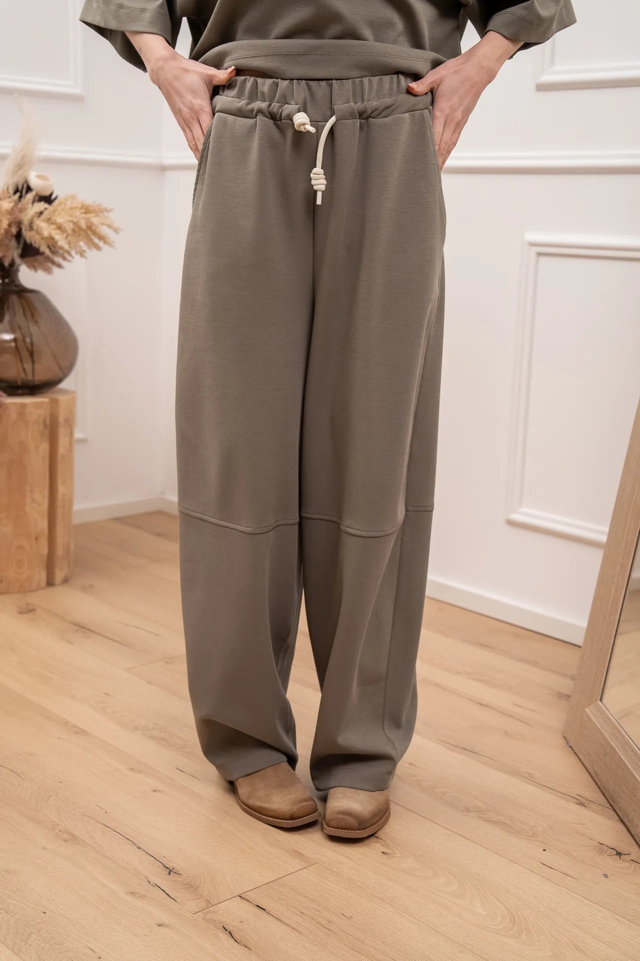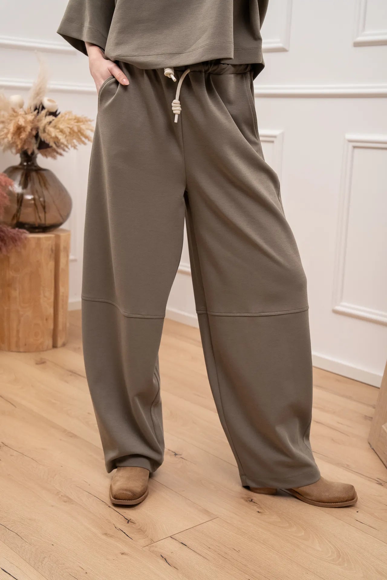 Pantaloni soft touch color kaki Vicolo. Modello barrel fit con impunture. Vita alta elasticizzata e coulisse.