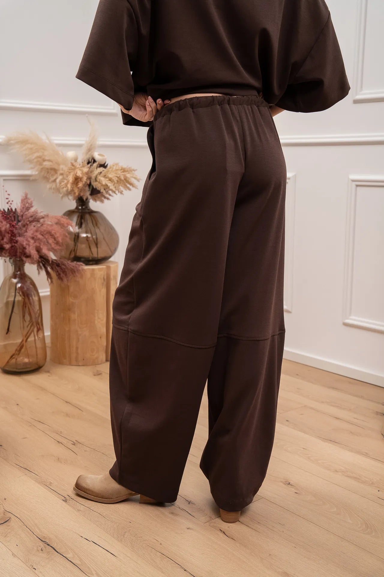 Pantaloni soft touch color moro Vicolo. Modello barrel fit con impunture. Vita alta elasticizzata e coulisse.