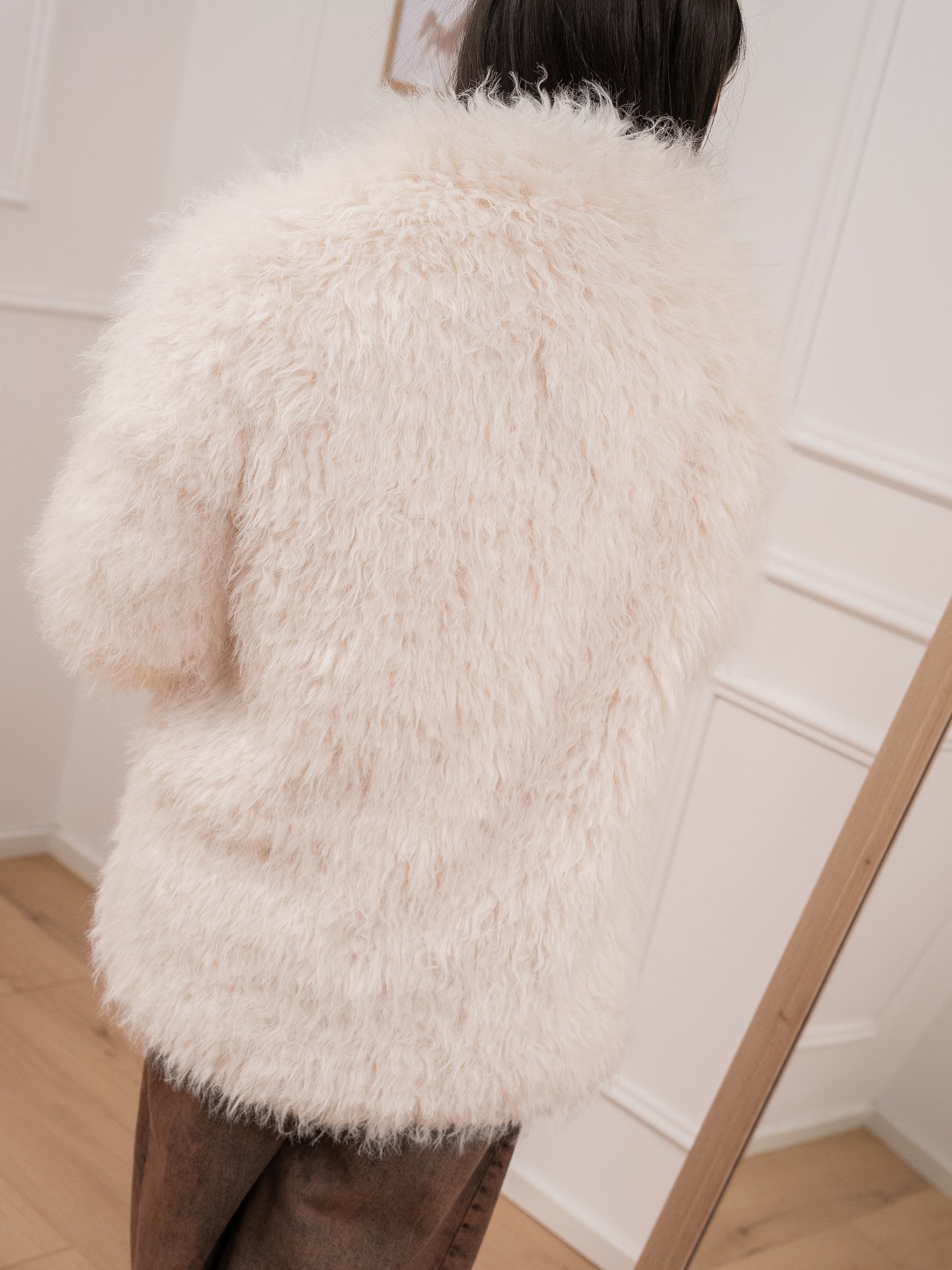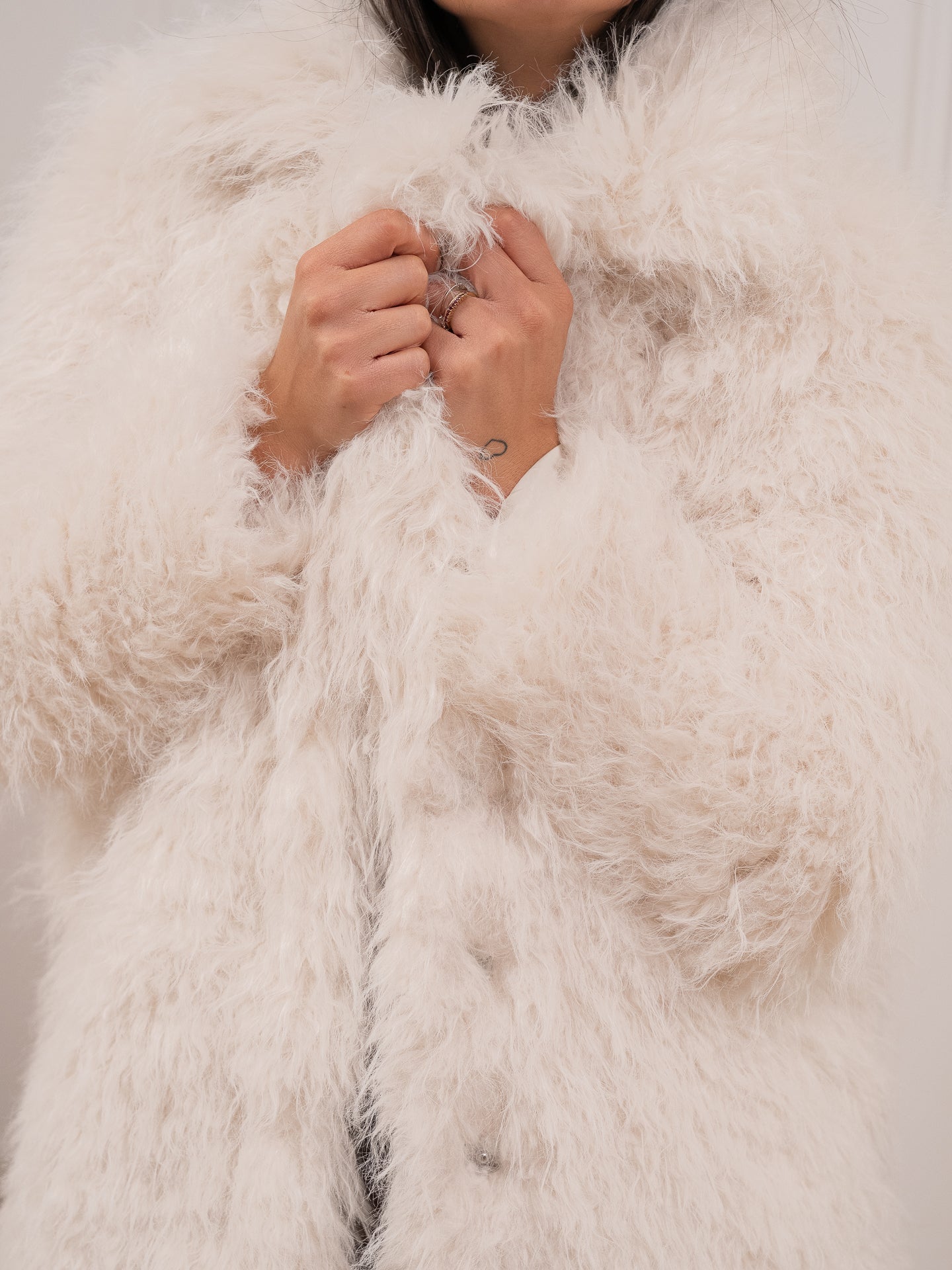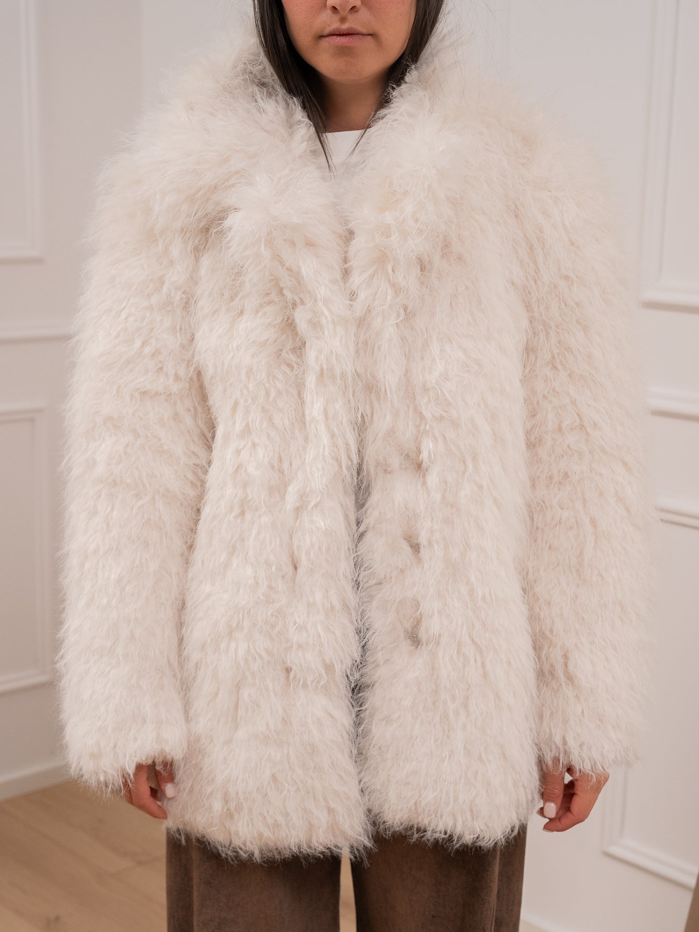 Pelliccia fluffly color bianco Glamorous. Modello midi con color revers e chiusura frontale con due bottoni nascosti. Tasche a filetto laterali.