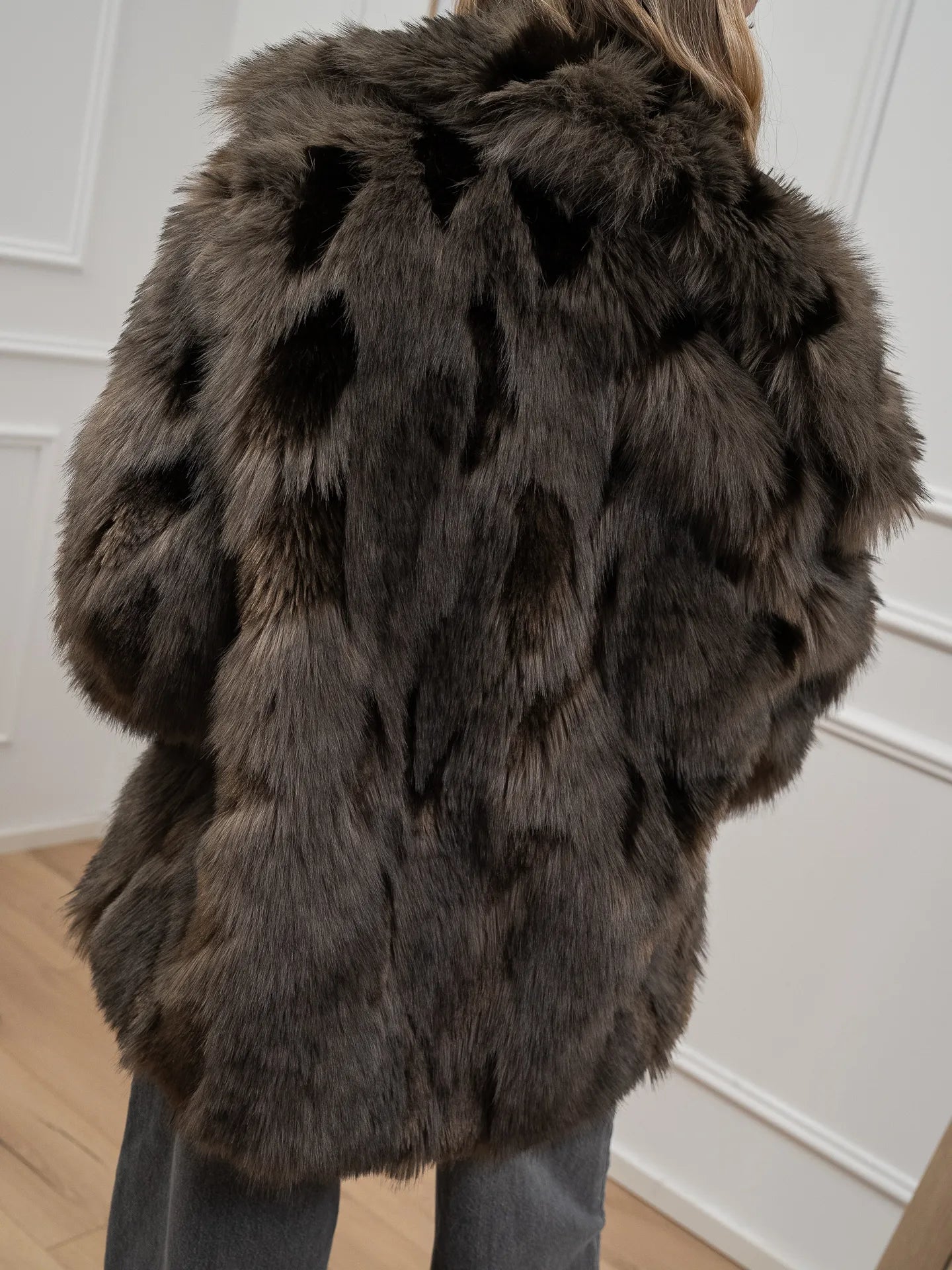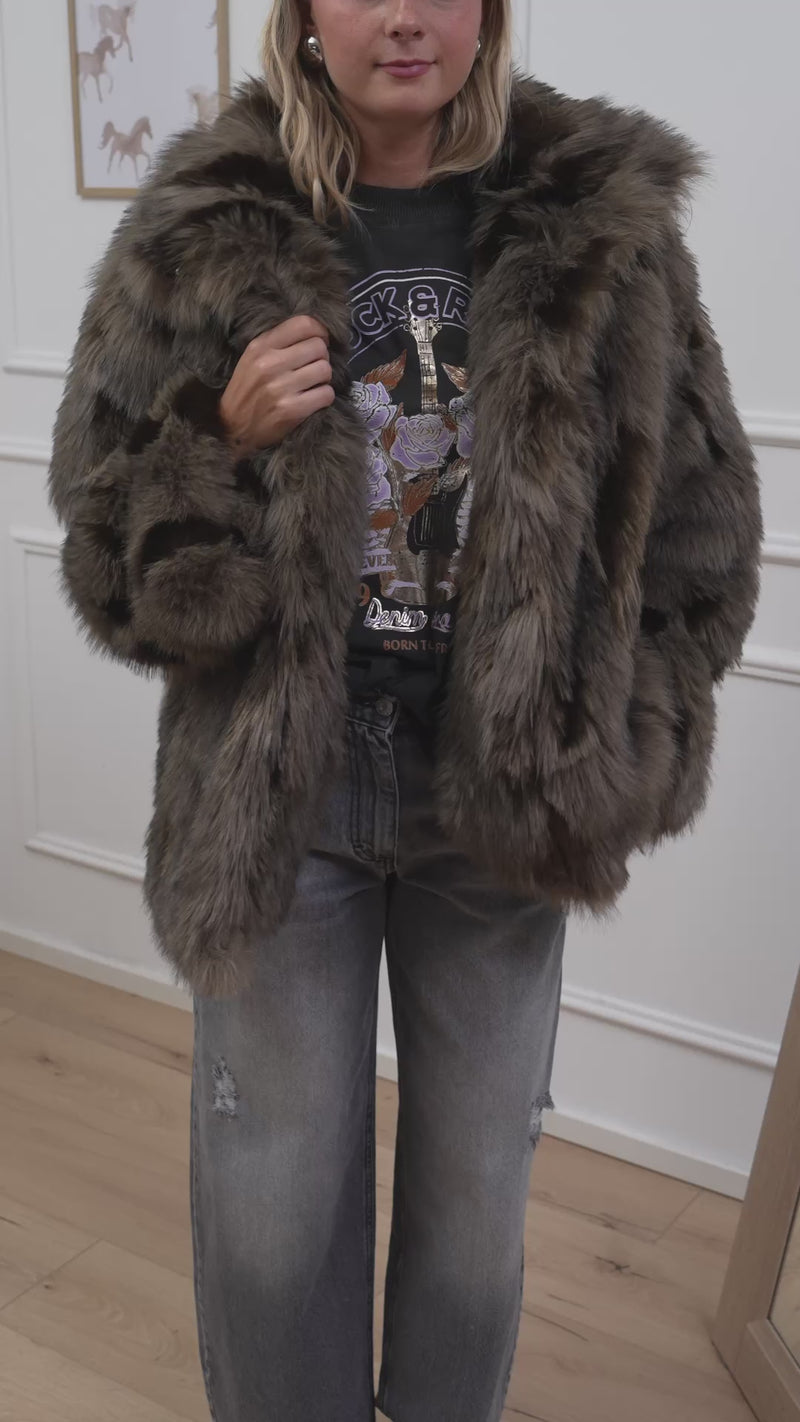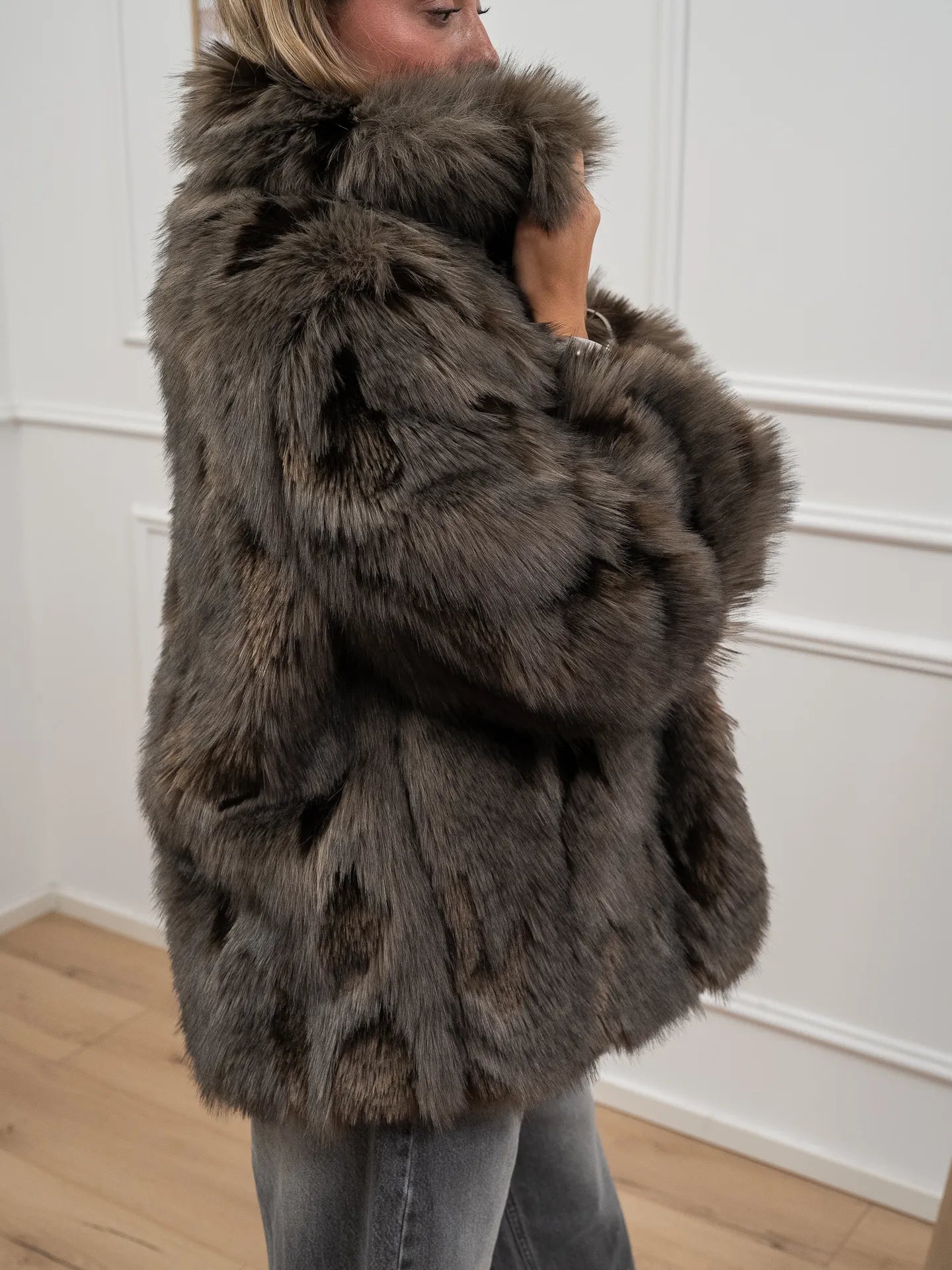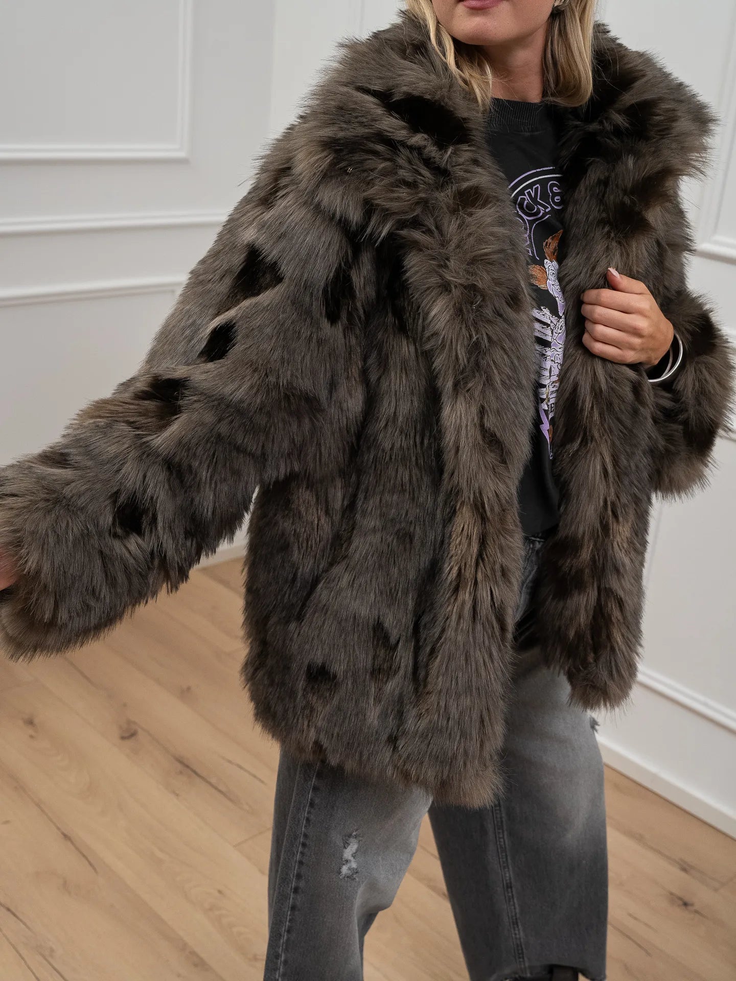 Pelliccia midi color tortora e marrone HaveOne. Modello collo revers lunghezza midi con maniche lunghe. Chiusura frontale con doppio gancio, tasche laterali.
